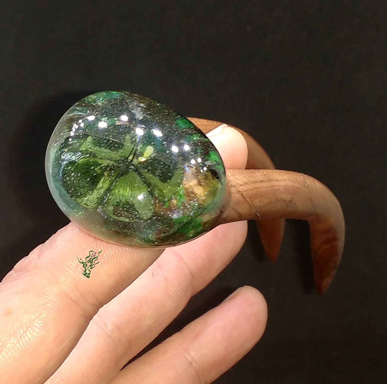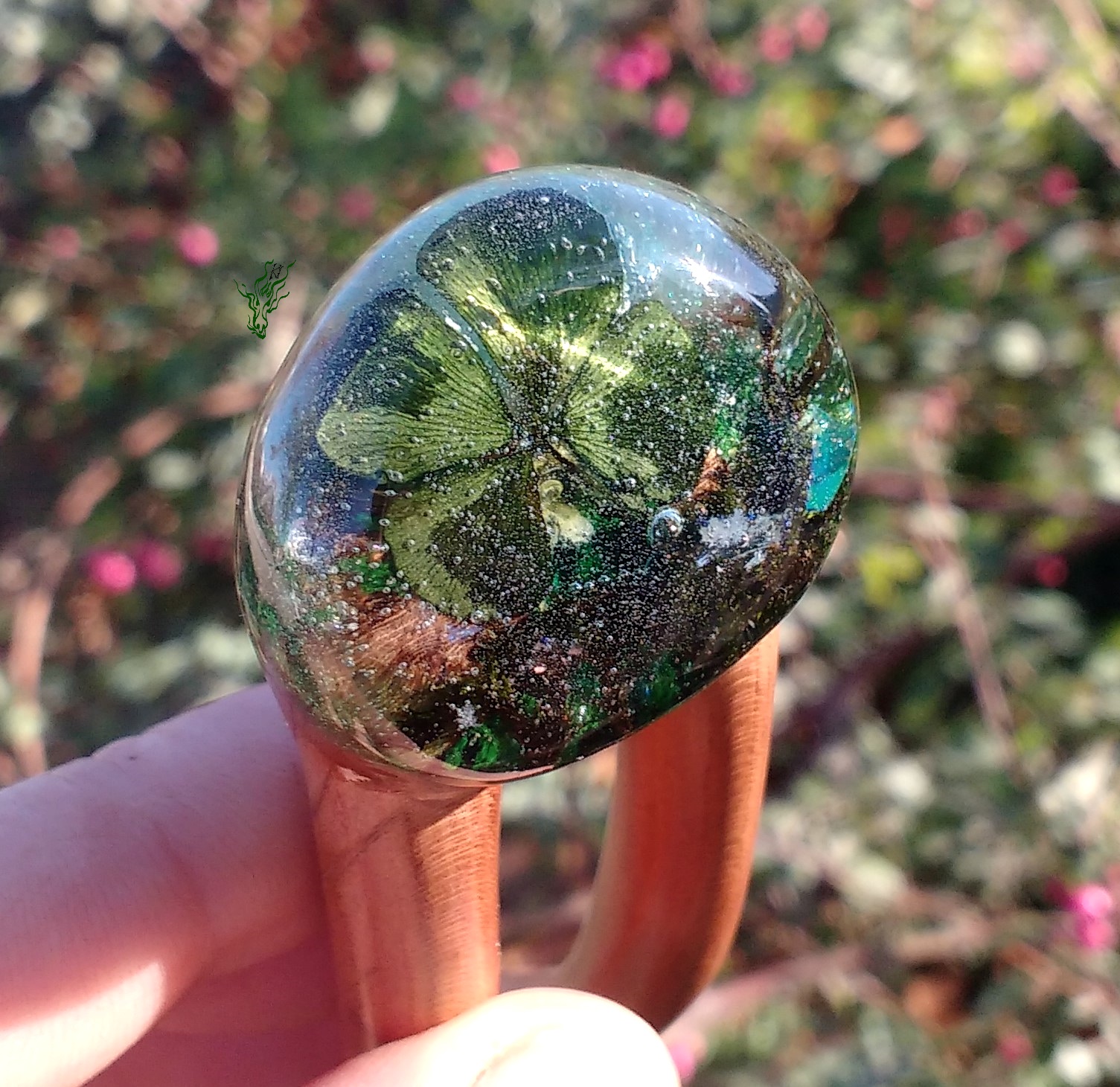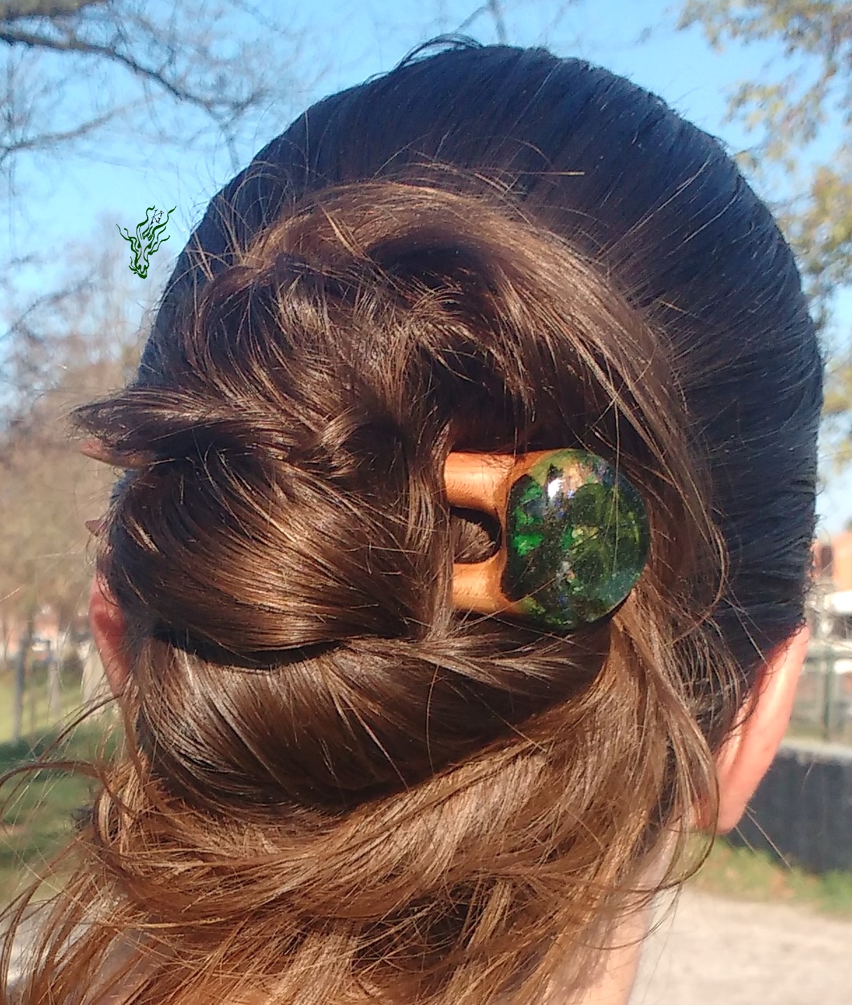 Eine Haarforke für Feenhaar,  leicht &  klein. Aufregende Landschaft mit Glücksklee &  Blässchen in einer Kuppel in smaragdgrün. Und das auf seidenglattem PflaumenHolz.   Die Form schmiegt sich an deinen Kopf – durch die Kopfform- Rundung für optimale Bequemlichkeit. Die kleinen  Nöpsies am  Zinkenende geben sicheren Halt.