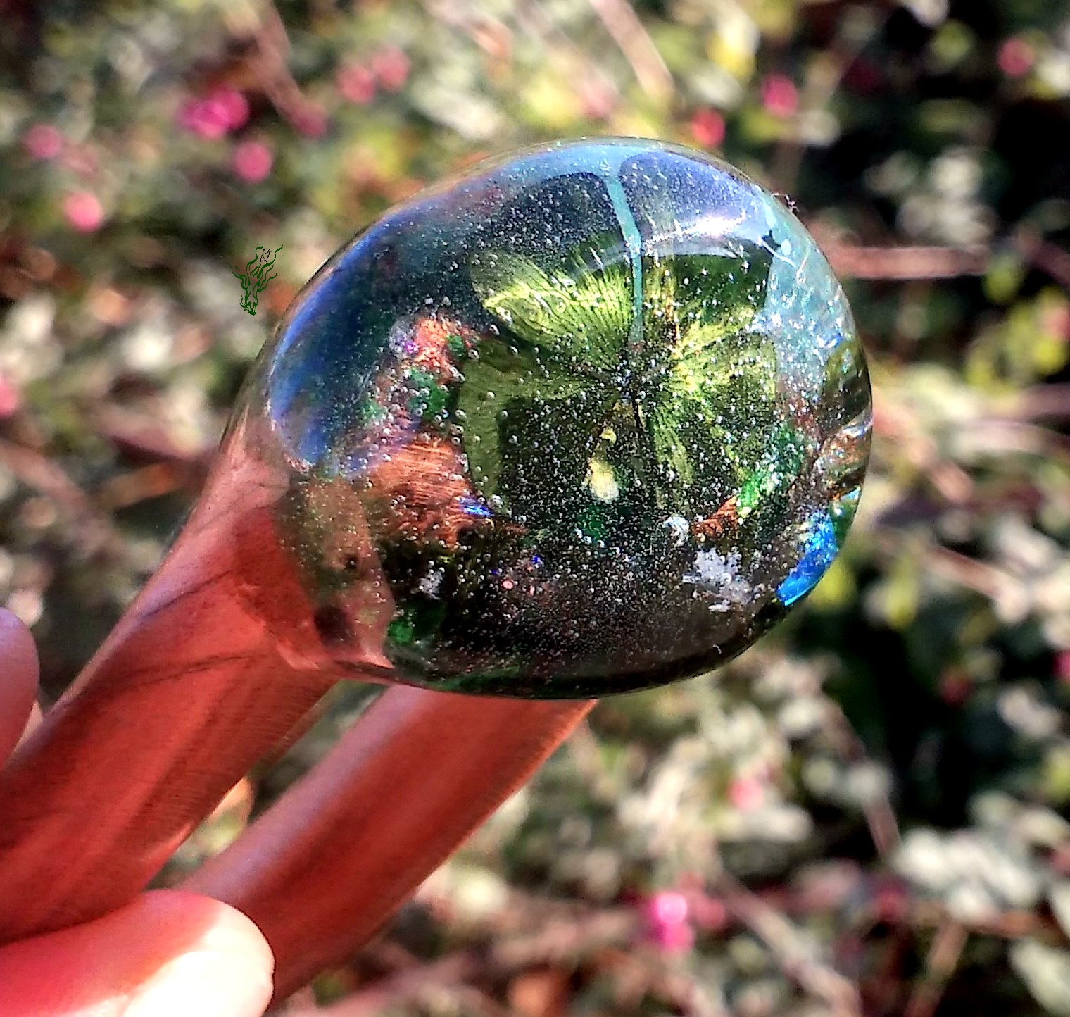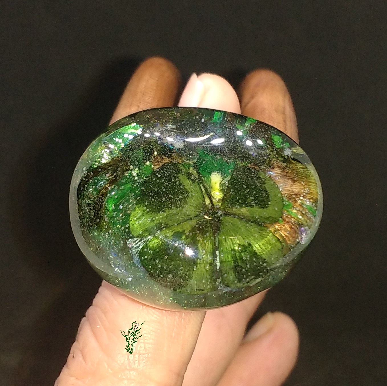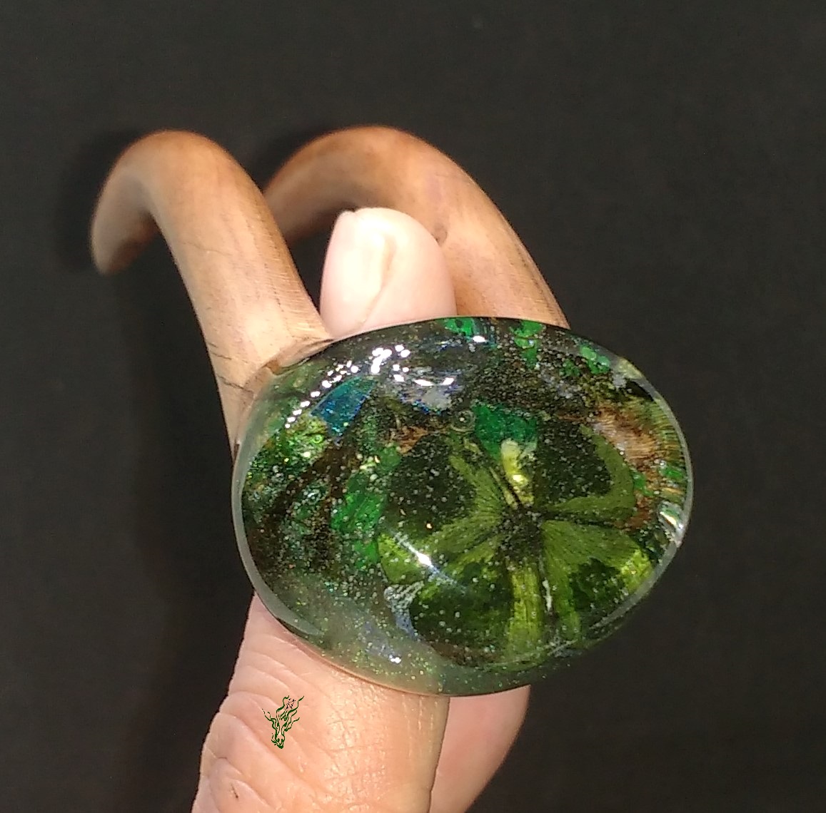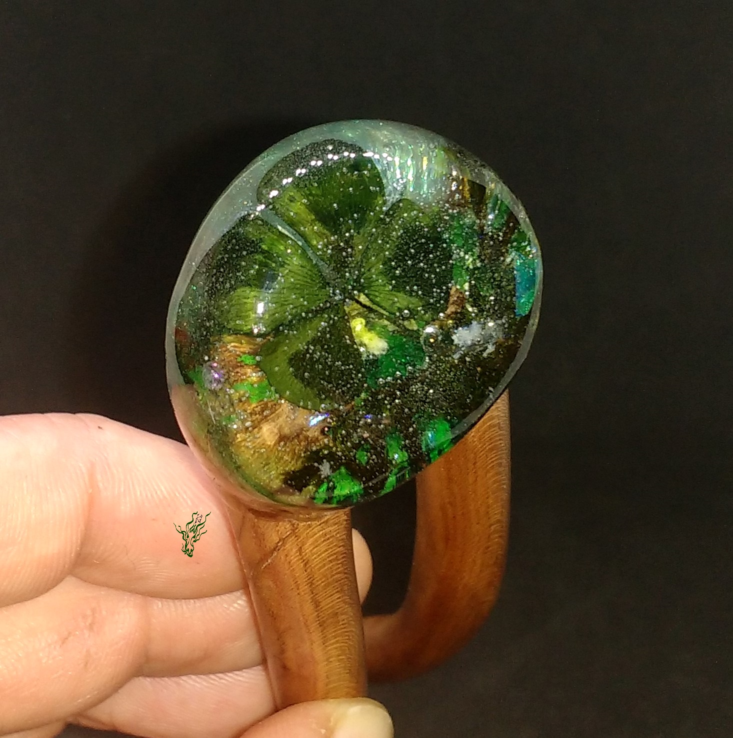 Eine Haarforke für Feenhaar,  leicht &  klein. Aufregende Landschaft mit Glücksklee &  Blässchen in einer Kuppel in smaragdgrün. Und das auf seidenglattem PflaumenHolz.   Die Form schmiegt sich an deinen Kopf – durch die Kopfform- Rundung für optimale Bequemlichkeit. Die kleinen  Nöpsies am  Zinkenende geben sicheren Halt.