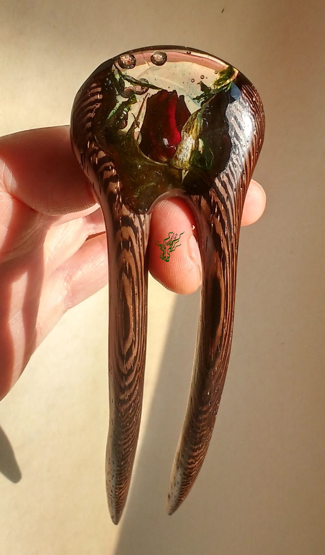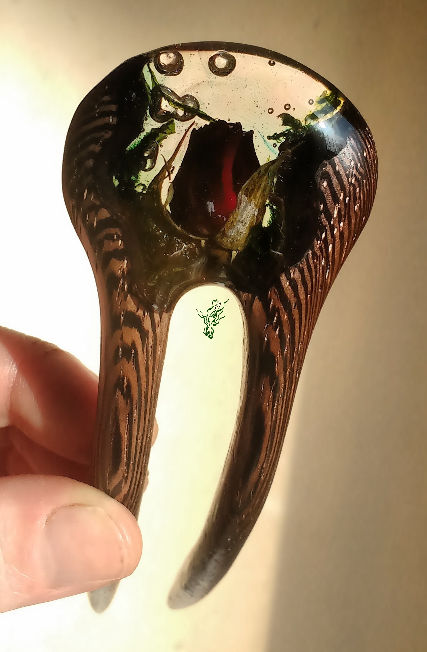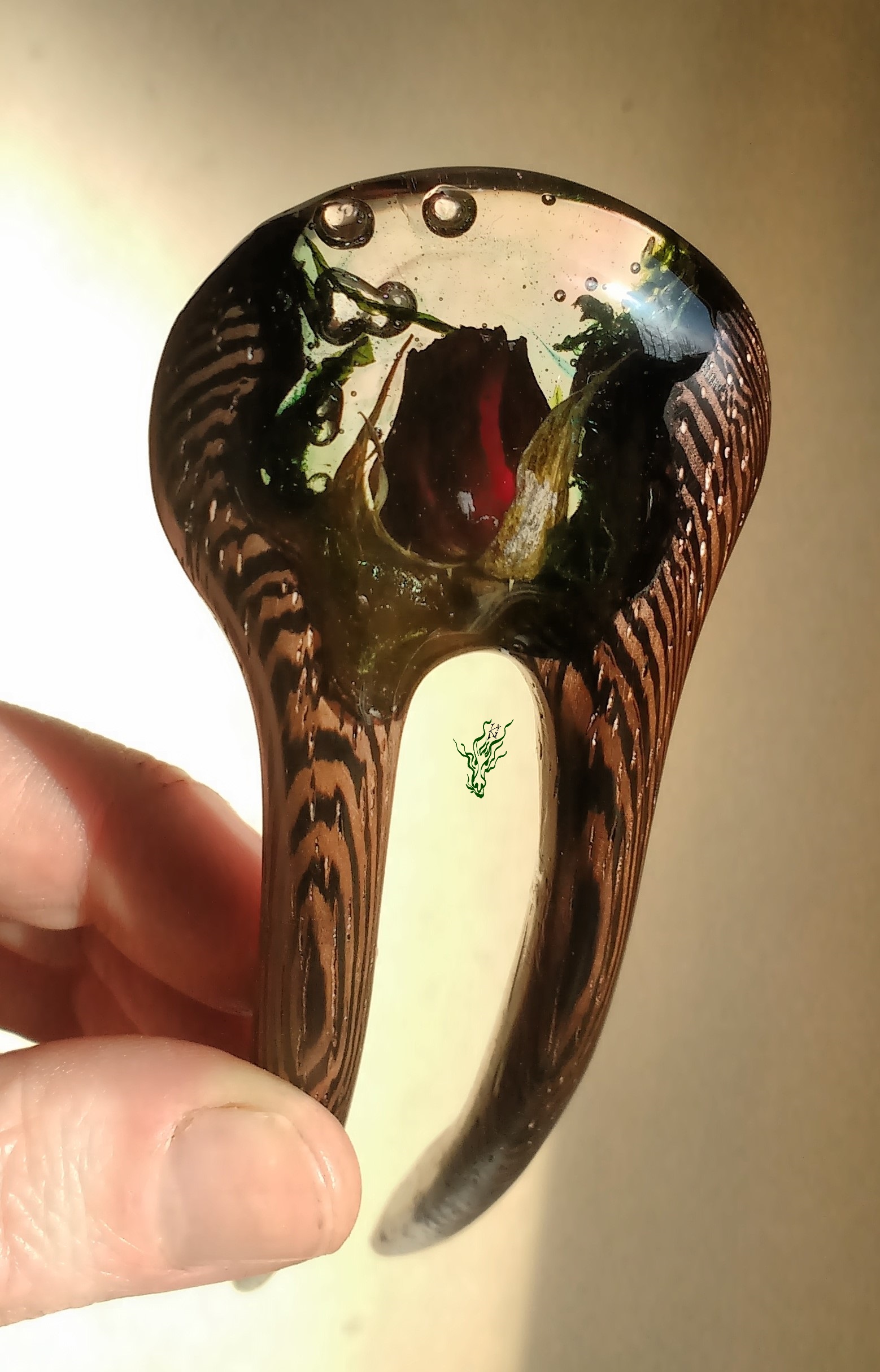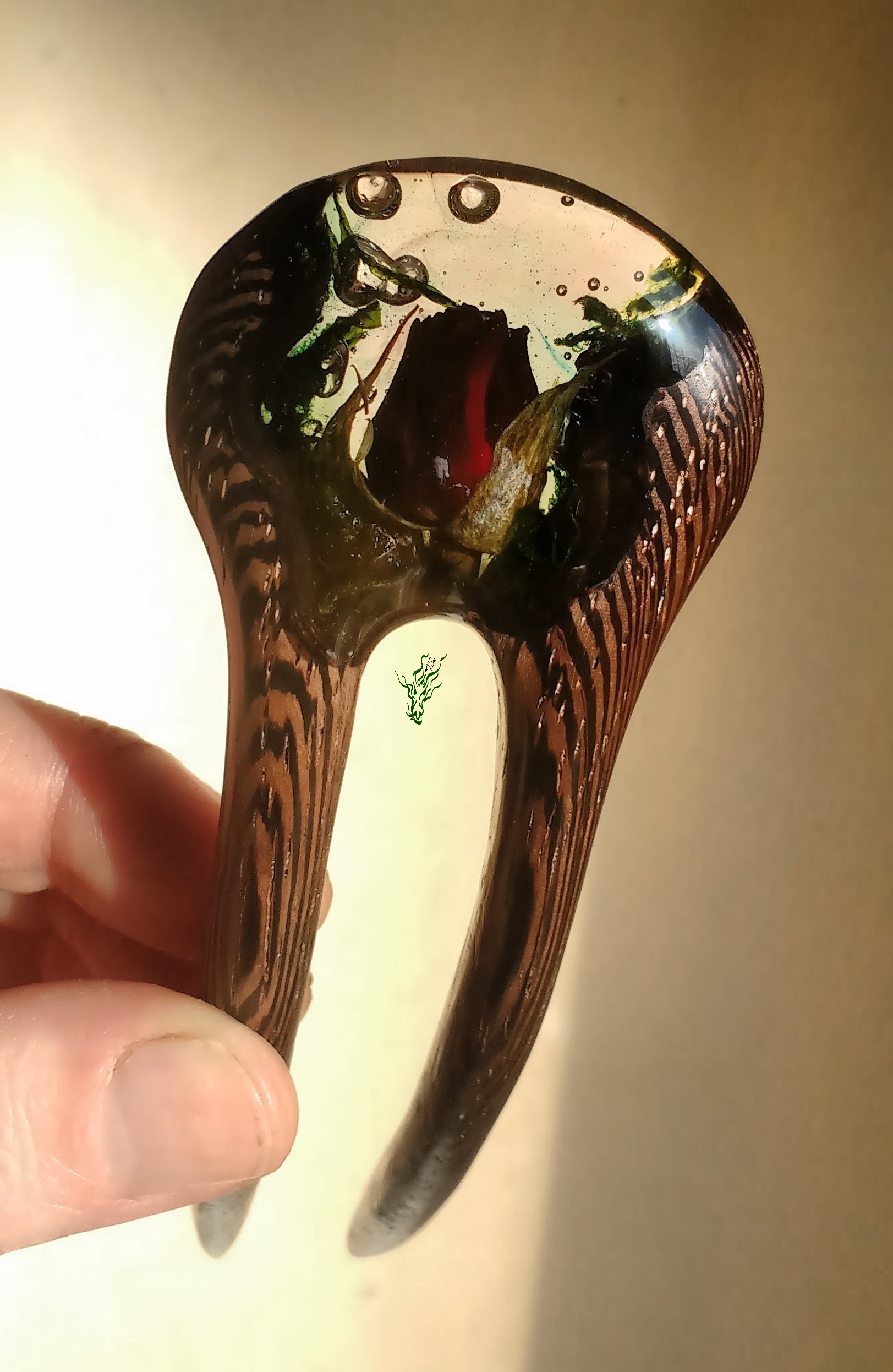 Diese neue Form habe ich erfunden, um Gewicht zu sparen. Sie ist genauso leicht wie eine adäquate Forke aus Holz. Eine Haarforke für Feenhaar, leicht & klein. Klar eingeschlosene Rosenknospe, Luftblasen und Moos.
