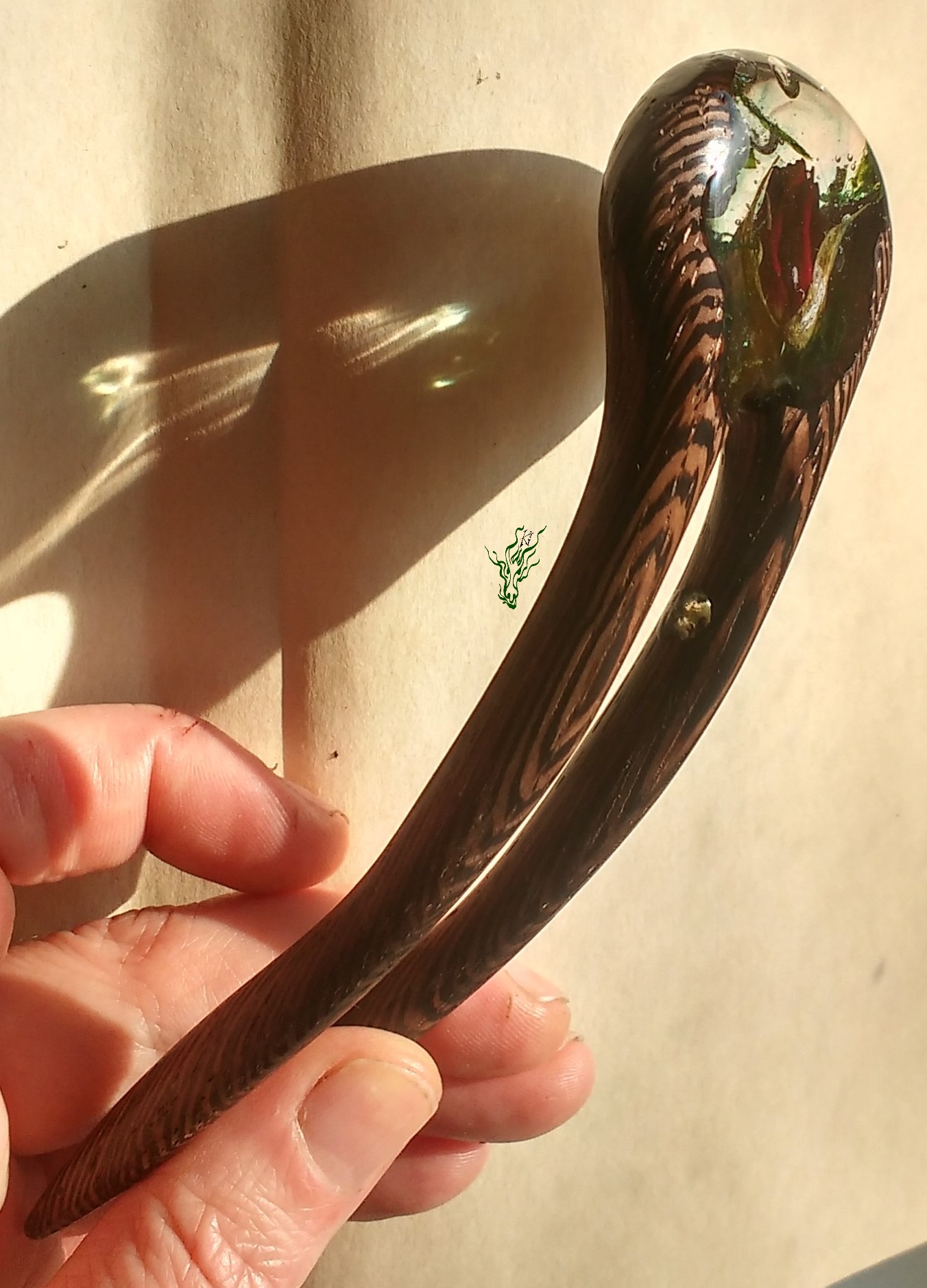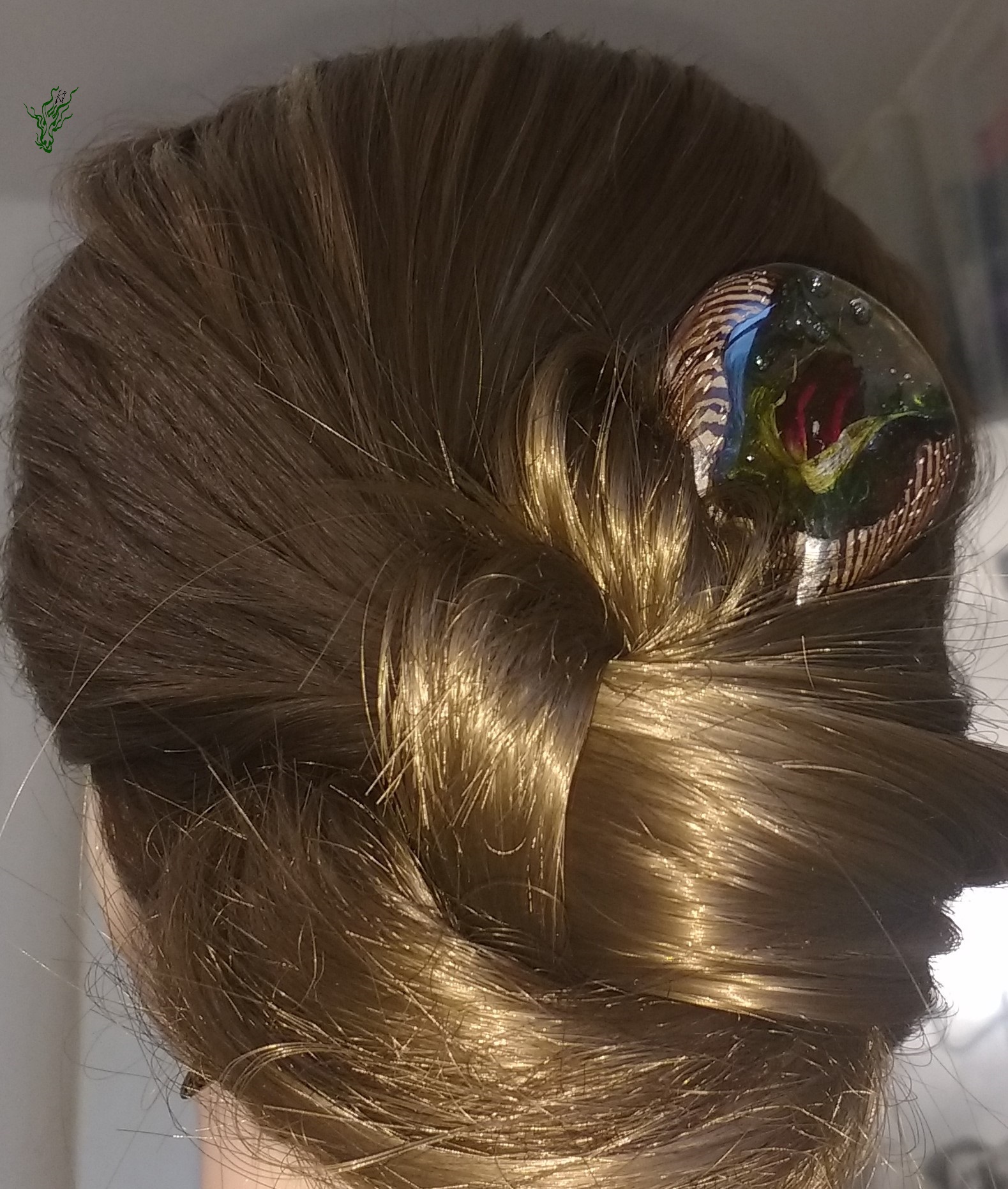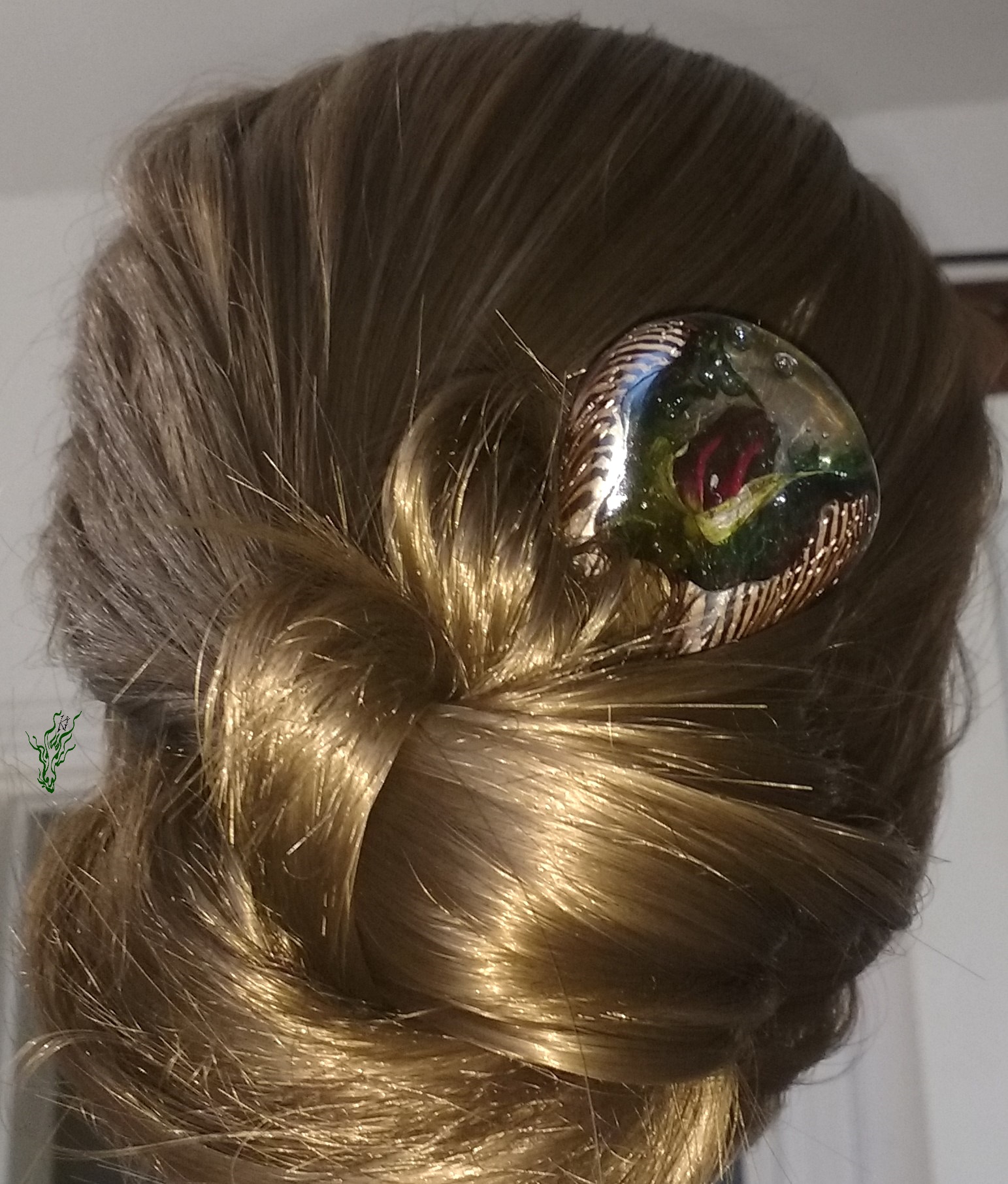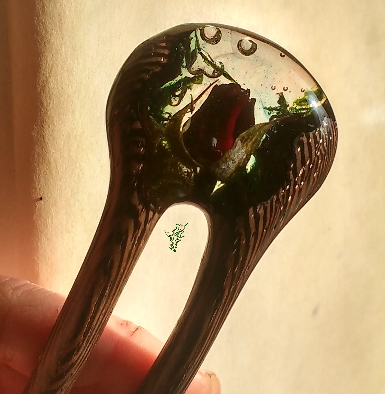 Diese neue Form habe ich erfunden, um Gewicht zu sparen. Sie ist genauso leicht wie eine adäquate Forke aus Holz. Eine Haarforke für Feenhaar, leicht & klein. Klar eingeschlosene Rosenknospe, Luftblasen und Moos.