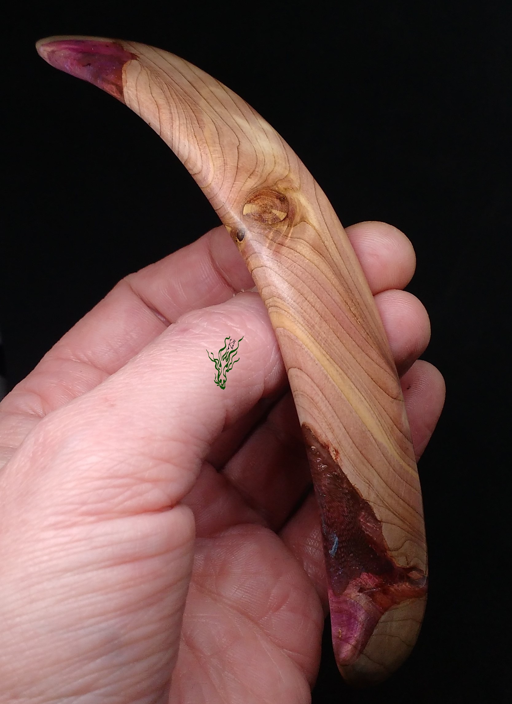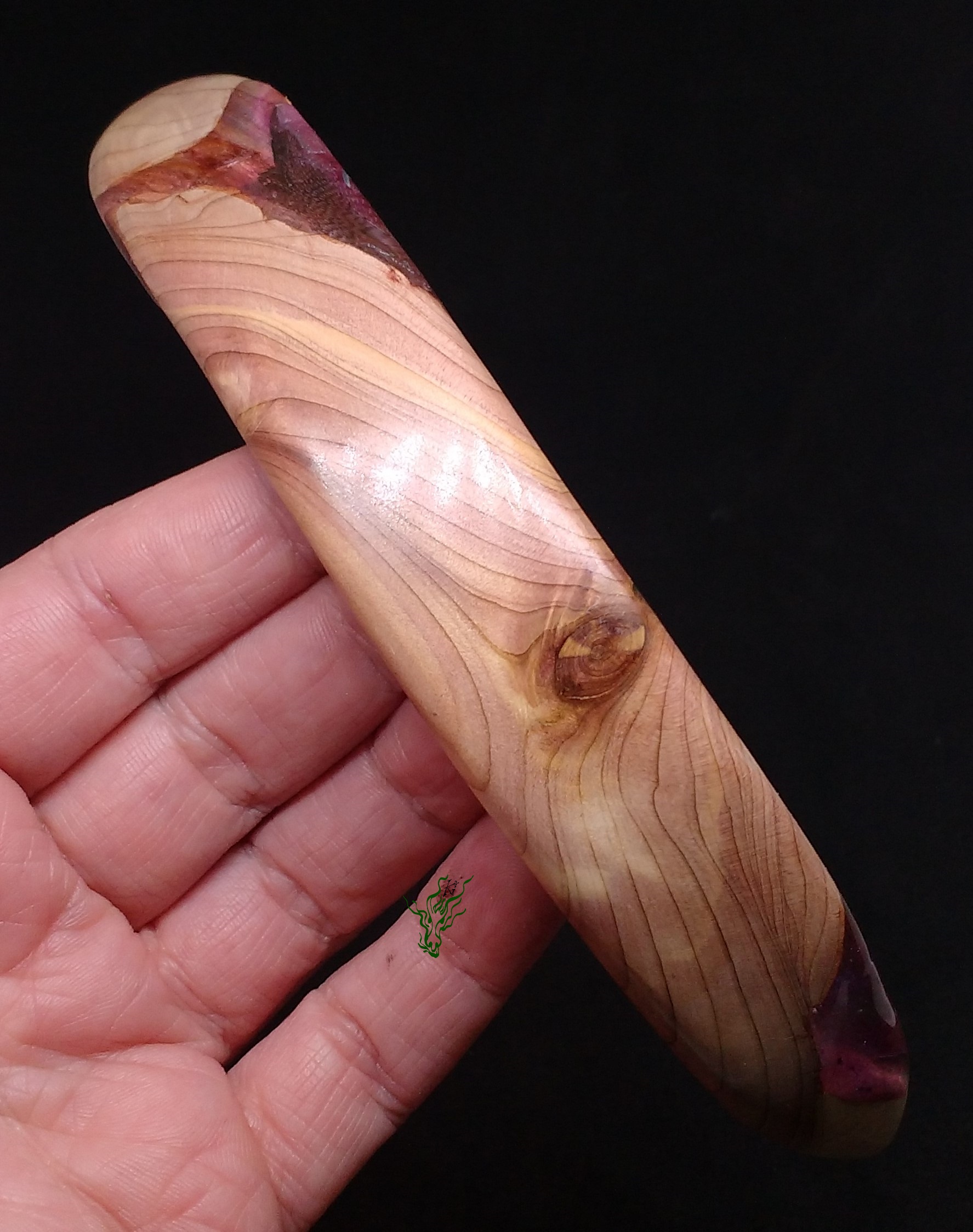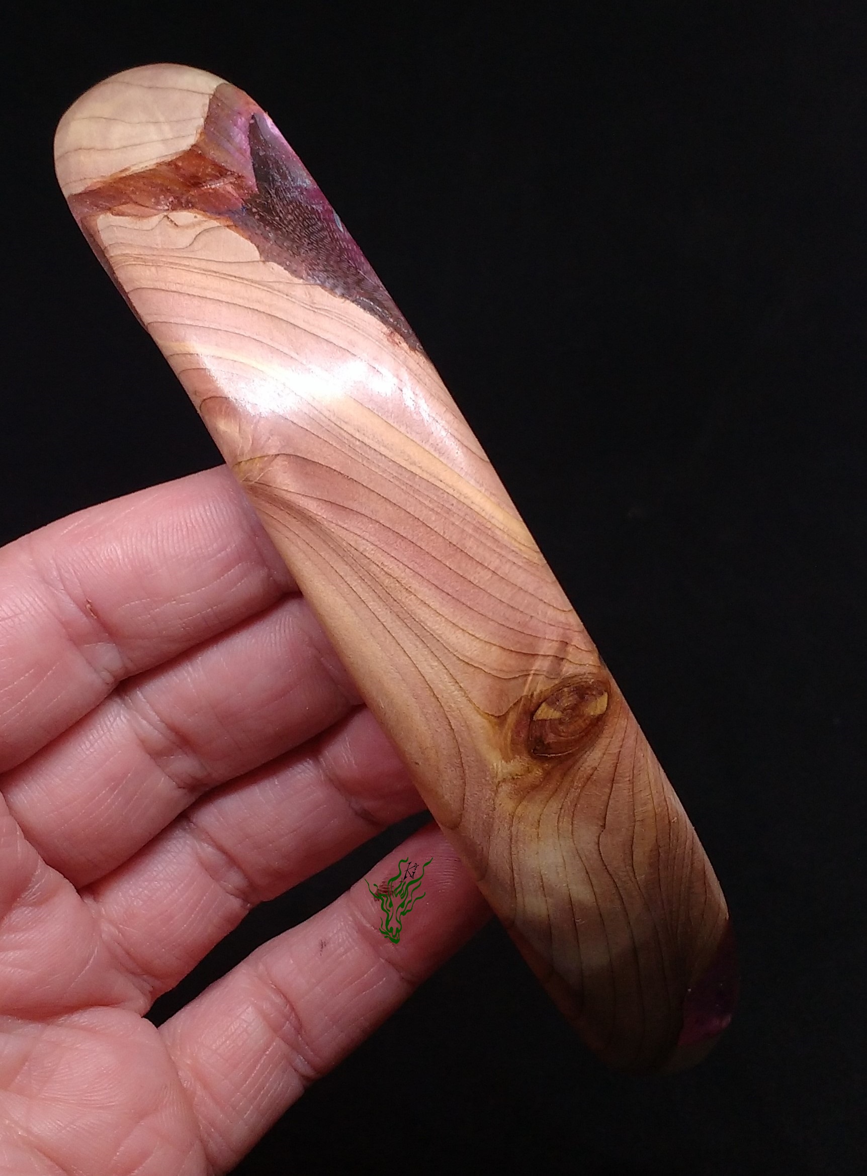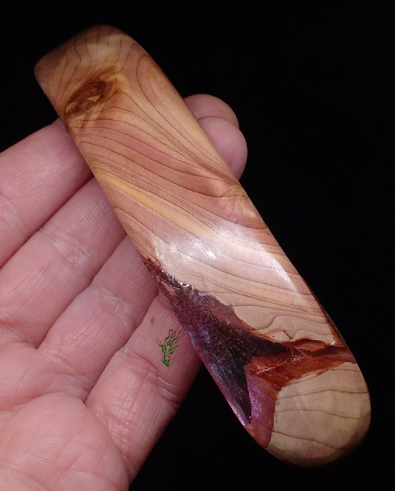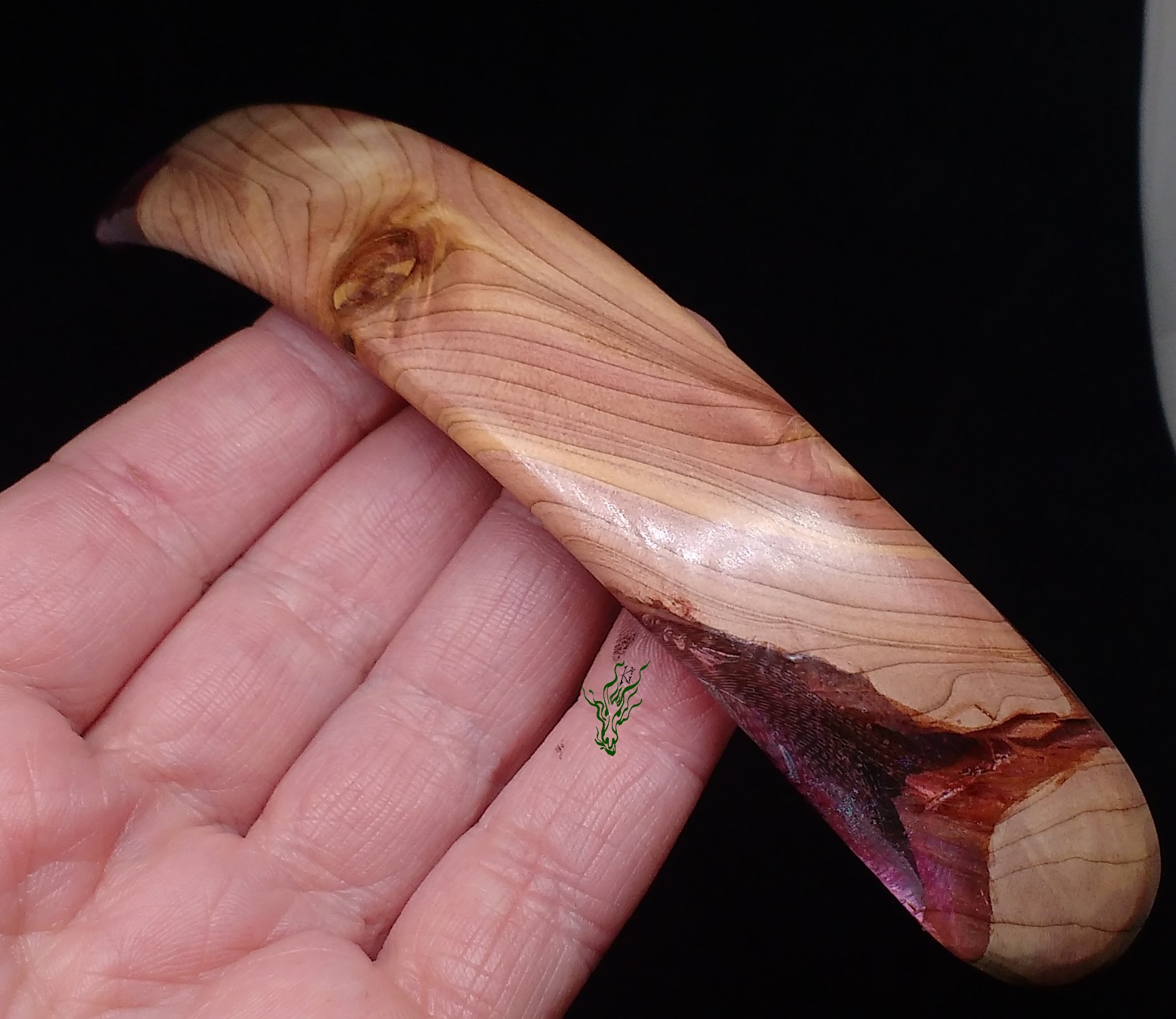 Breiter Gletscherstab , so bequem aus meinem herrlich roten WacholderHolz. Deshalb liebe ich die breiten Haarstäbe: genug Platz um die aufregende Holzmaserung zu zeigen. Schönheit für beide Seiten deines Dutts: echte, selbst gesammelte Federn mit Leopardenmuster umgeben von kühl- roter Klarheit.