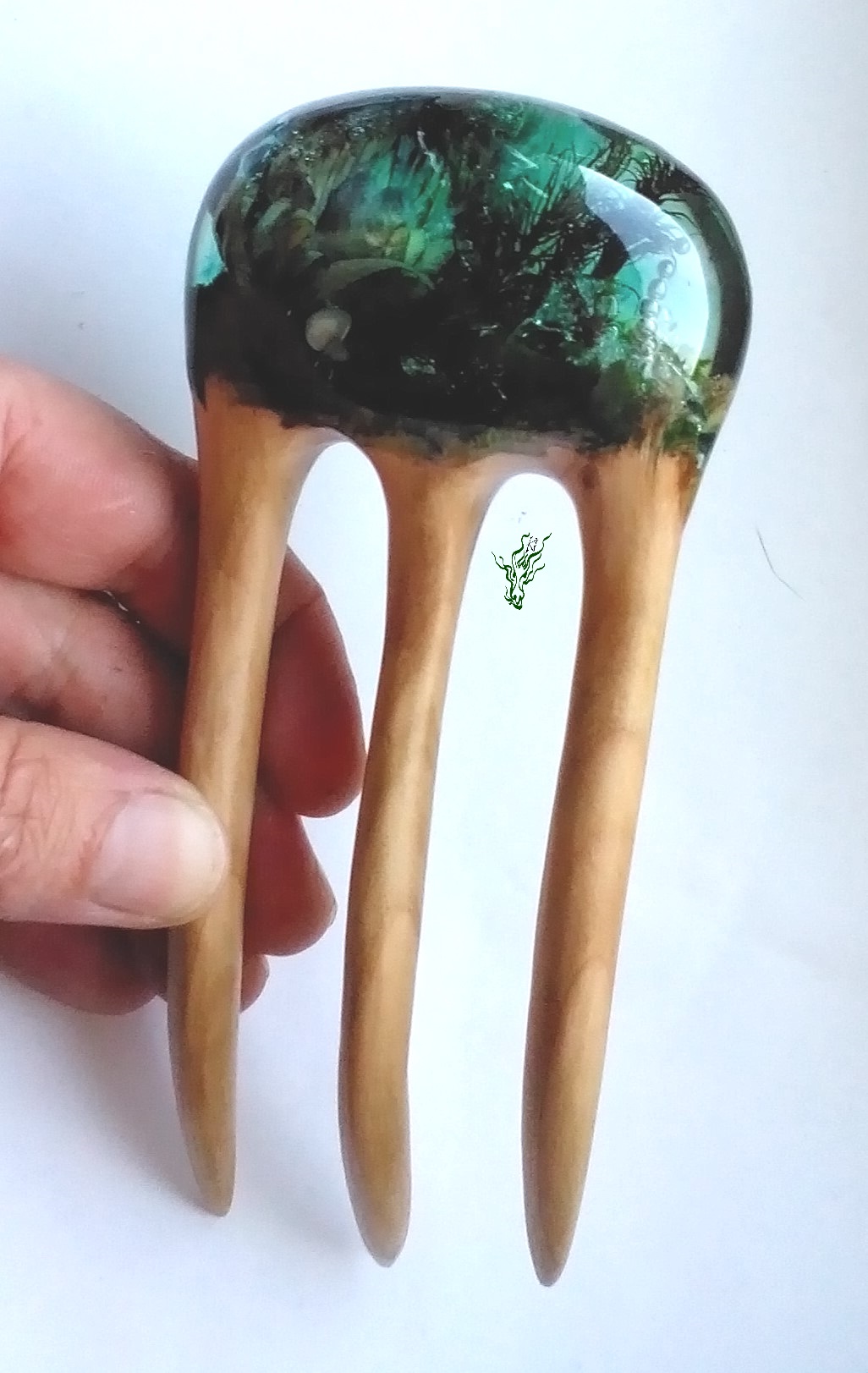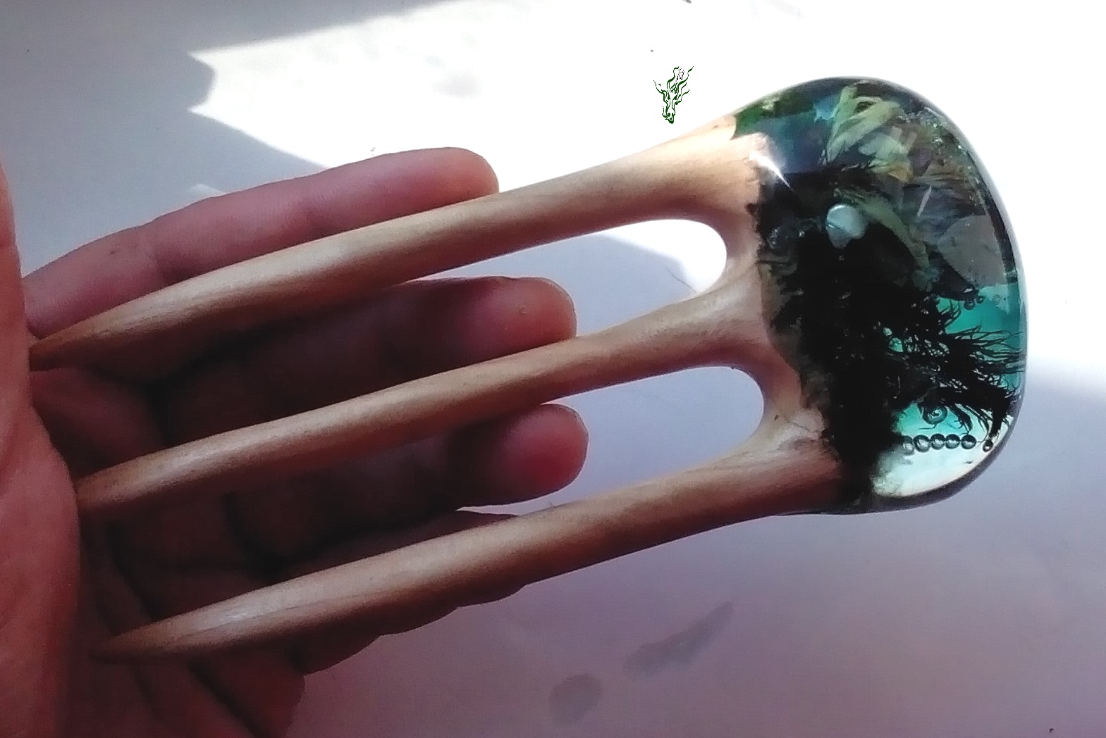 Geheimnisvolle Pflanzen umgeben von irisierenden Bläschen und entstanden ist eine kleine Welt, in der du versinken kannst. In einer smaragd- grünen, hochglänzenden Kuppel, die auf aufregendem Kirsch-Holz wohnt. Diese Gletscherforke verspricht Abenteuer.