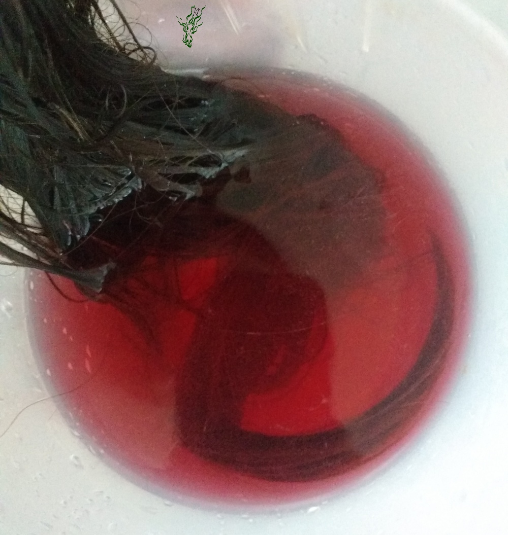 Ich tunke meine ausgespülten Haare hinein und gieße mir den Rest über den Kopf. Das wirkt dann ein, solange ich mich wasche und wird zuletzt mit kaltem Wasser ausgespült.