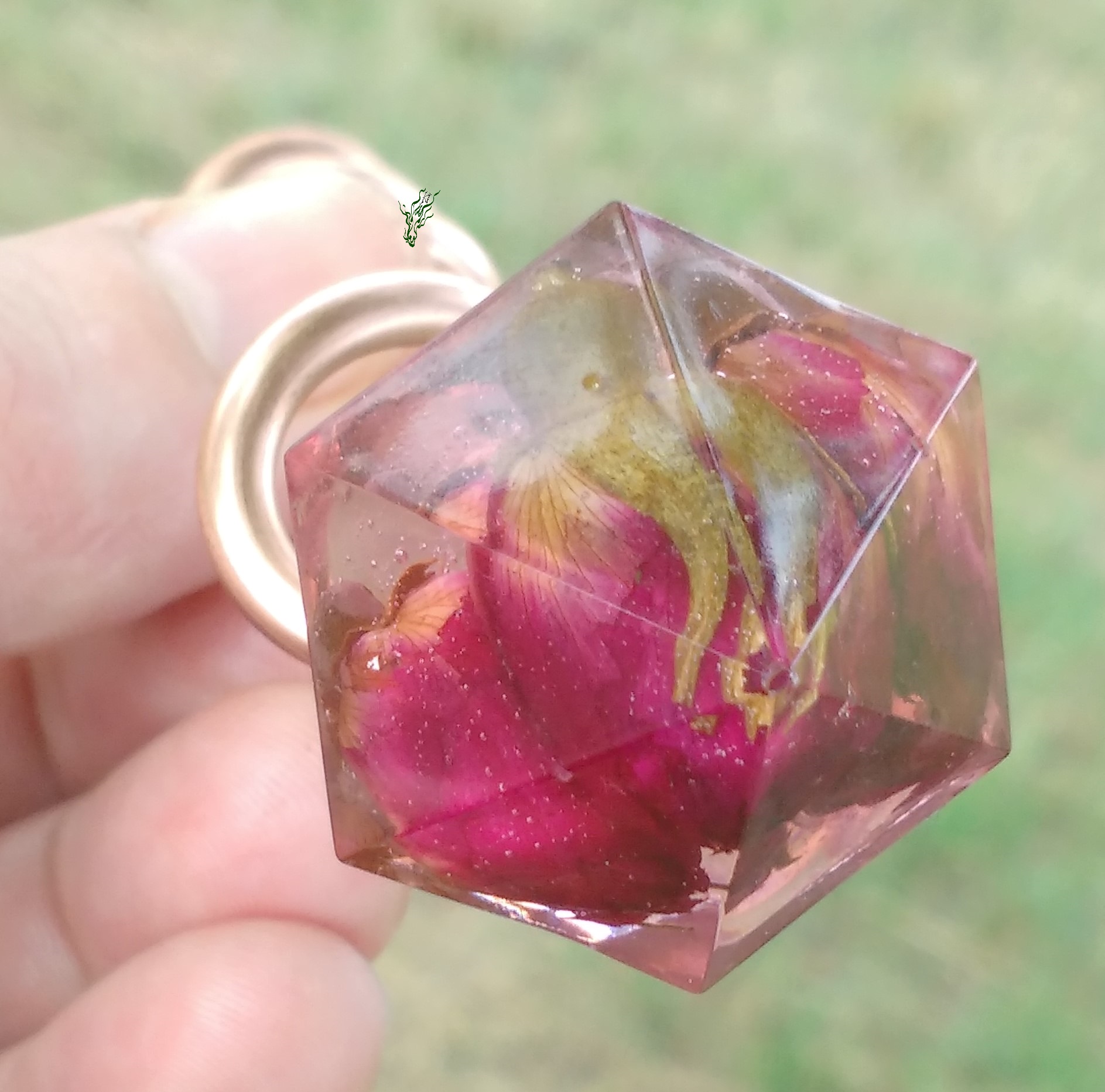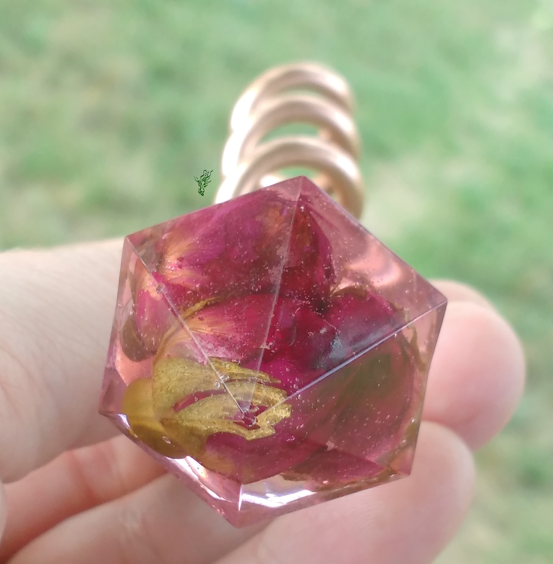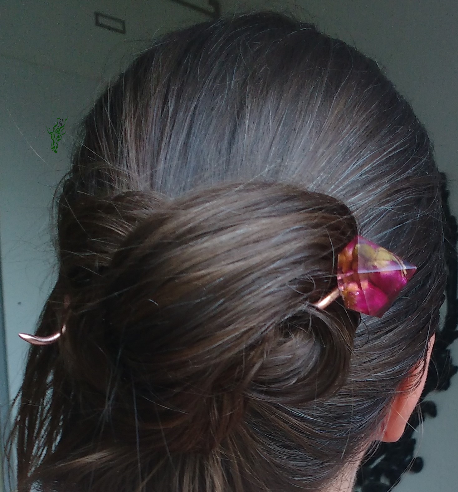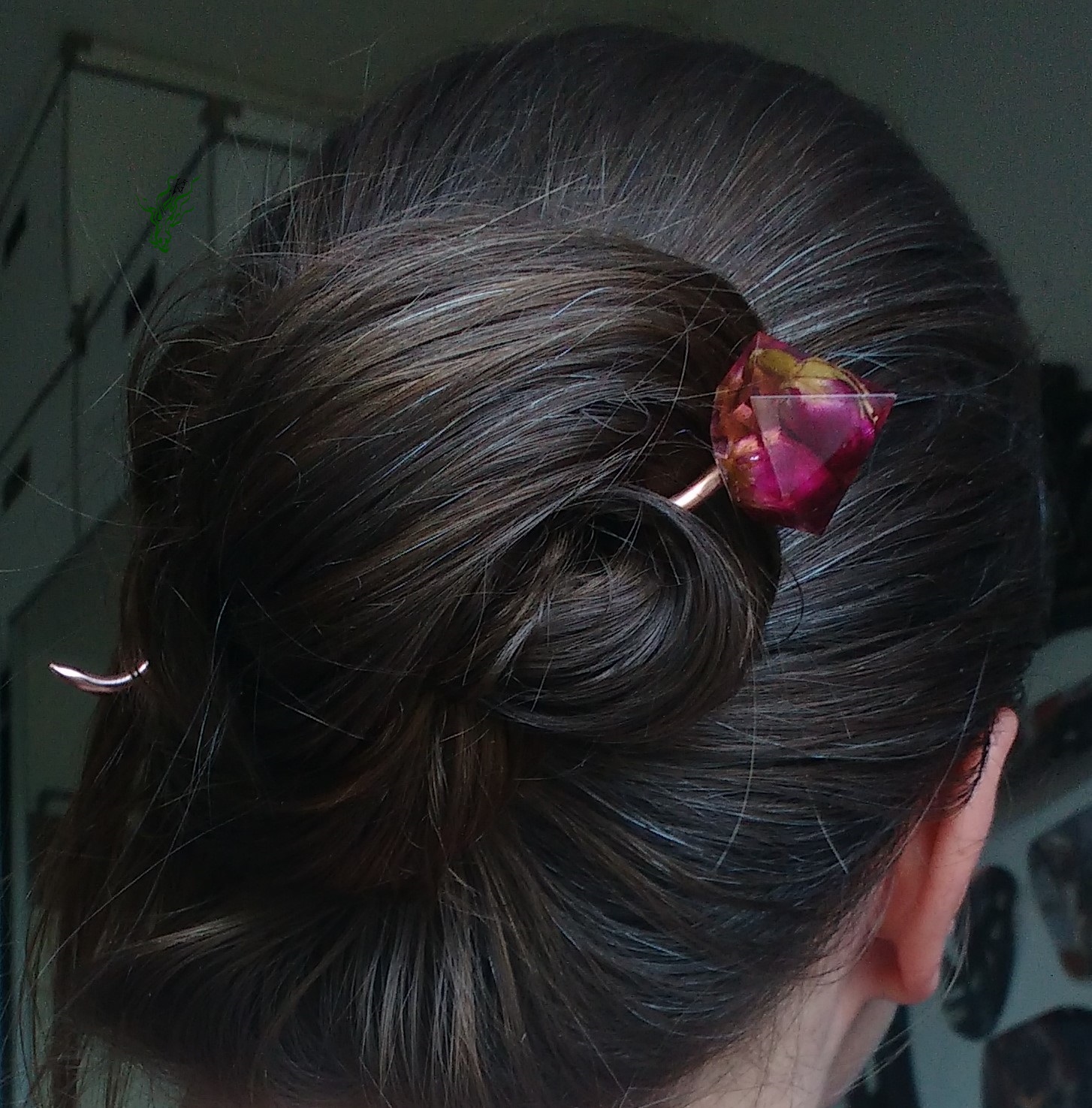 Rosenknospen, konserviert in einem rosa-klarem Diamant. Der Haarstab ist aus stabilem Kupfer. Den verbiegst du nicht so leicht. Die Spirale verteilt das Gewicht gut & wegen des geringen Volumens kannst du besonders eng wickeln.