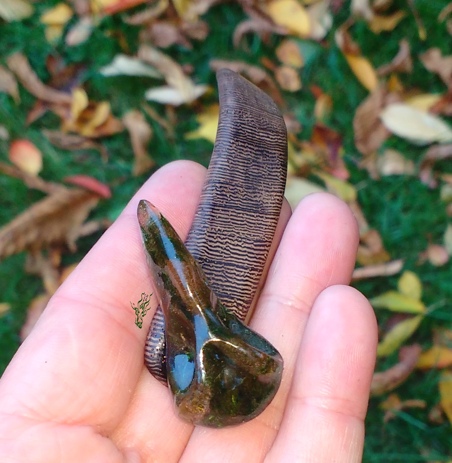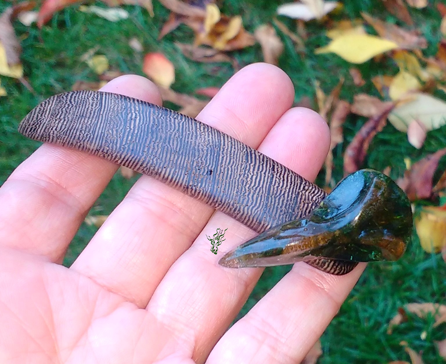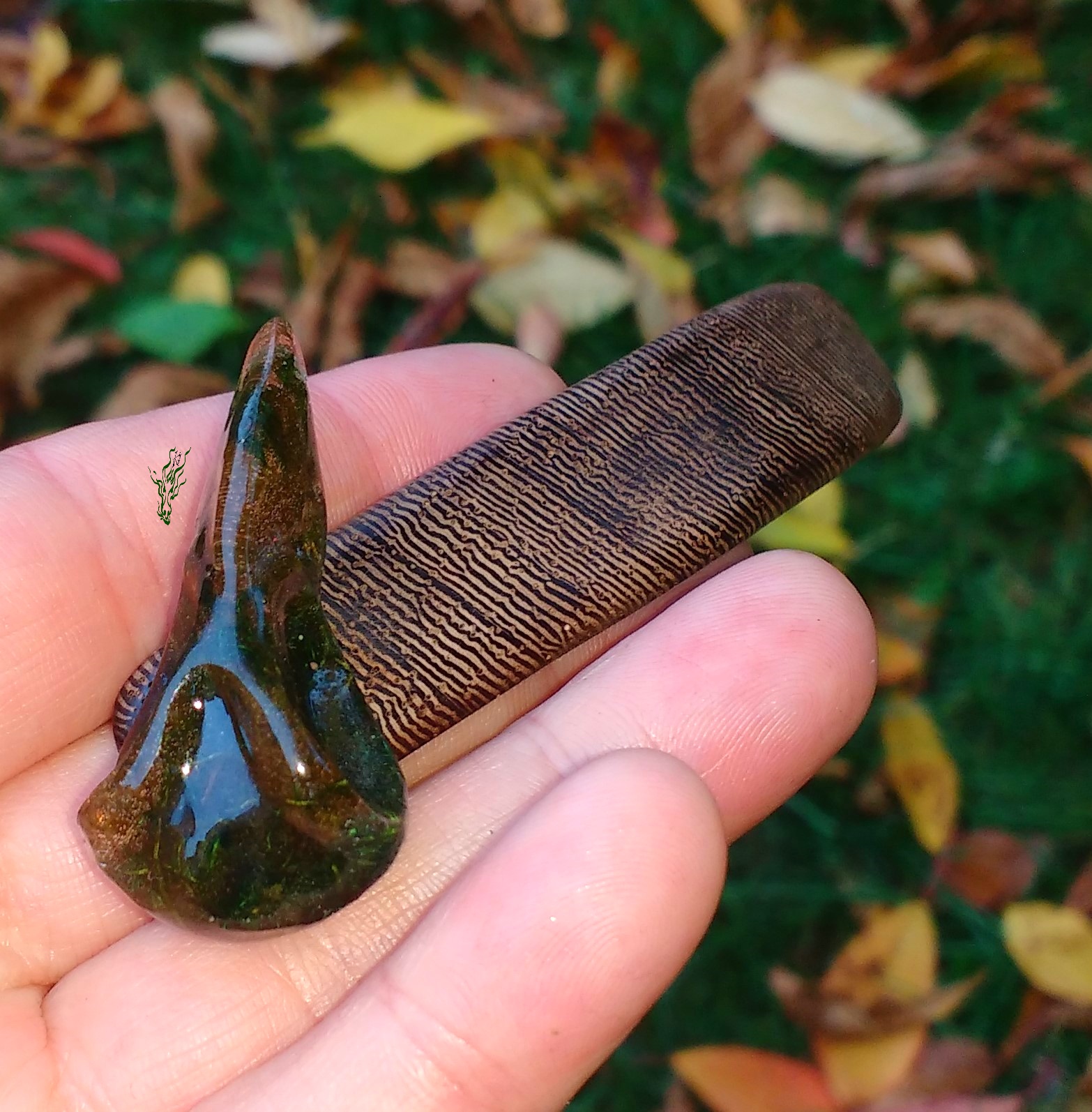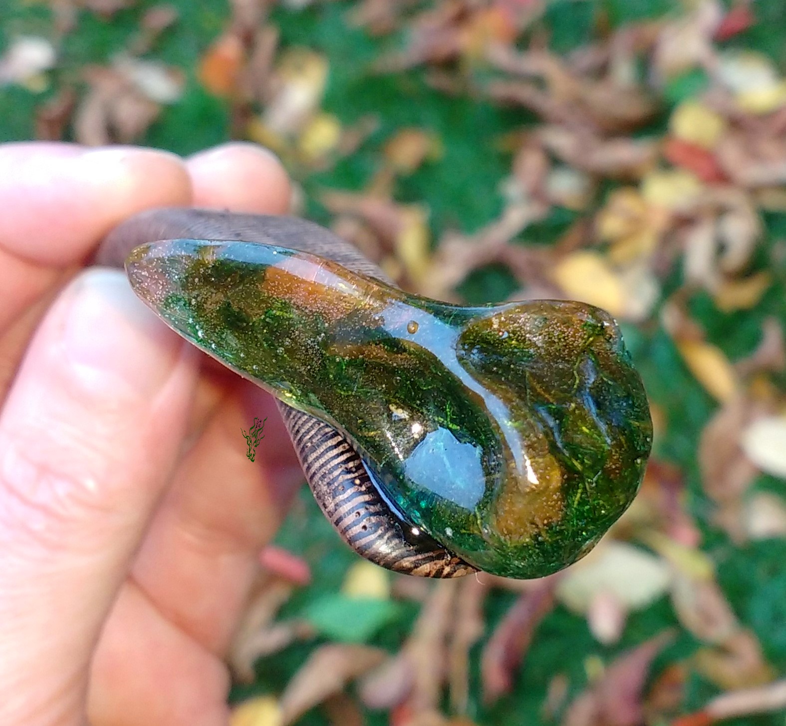 Breiter Gletscherstab , so bequem aus ringelstrumpfhos-igem Wengeholz. Der Gletscher- Ravenskull in Herbstfarben mit Moos. Ganz zart & leicht, für Feenhaar.