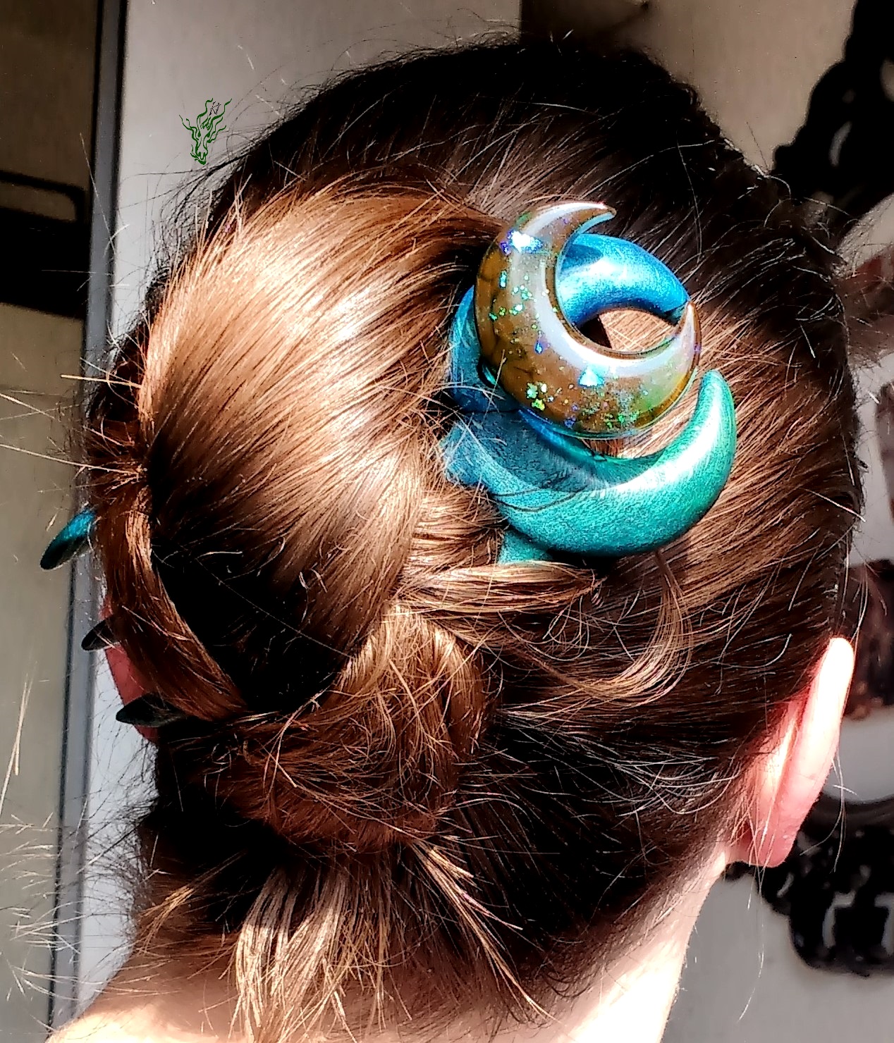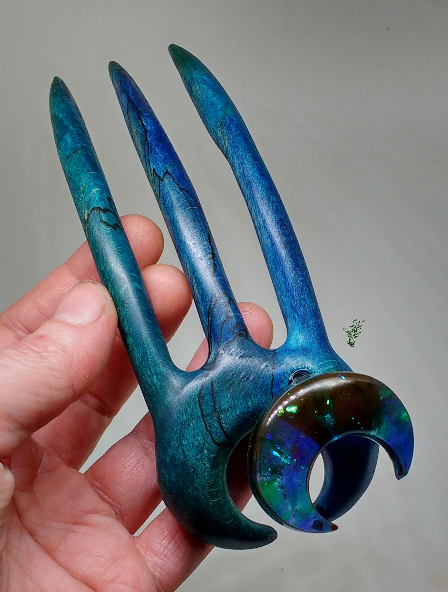 Pünktlich zum Blue- Moon- Monat ^^ Diese dreizinkige Haarforke hebt sich von der Masse ab: sei es durch die Basis aus gestocktem BuchenHolz mit herrlicher Zeichnung, sei es durch den Materialmix, durch den 3D MondTopper mit 2 Halbmonden oder das aufwändige Finish in Polarlichtfarben. Die Farbeffekte betonen die natürliche Maserung & Struktur des BuchenHolzes und finden sich im Resin- Mond wieder. Abgerundet mit irisierendem Flitter…