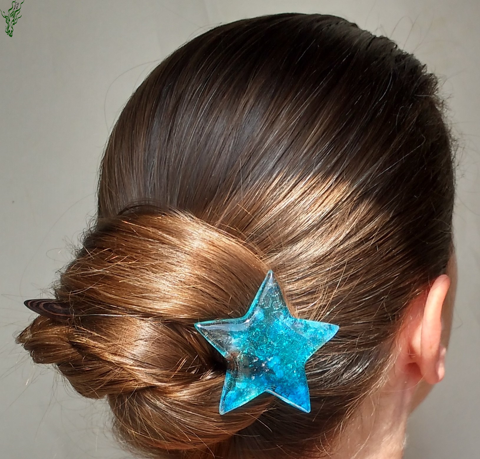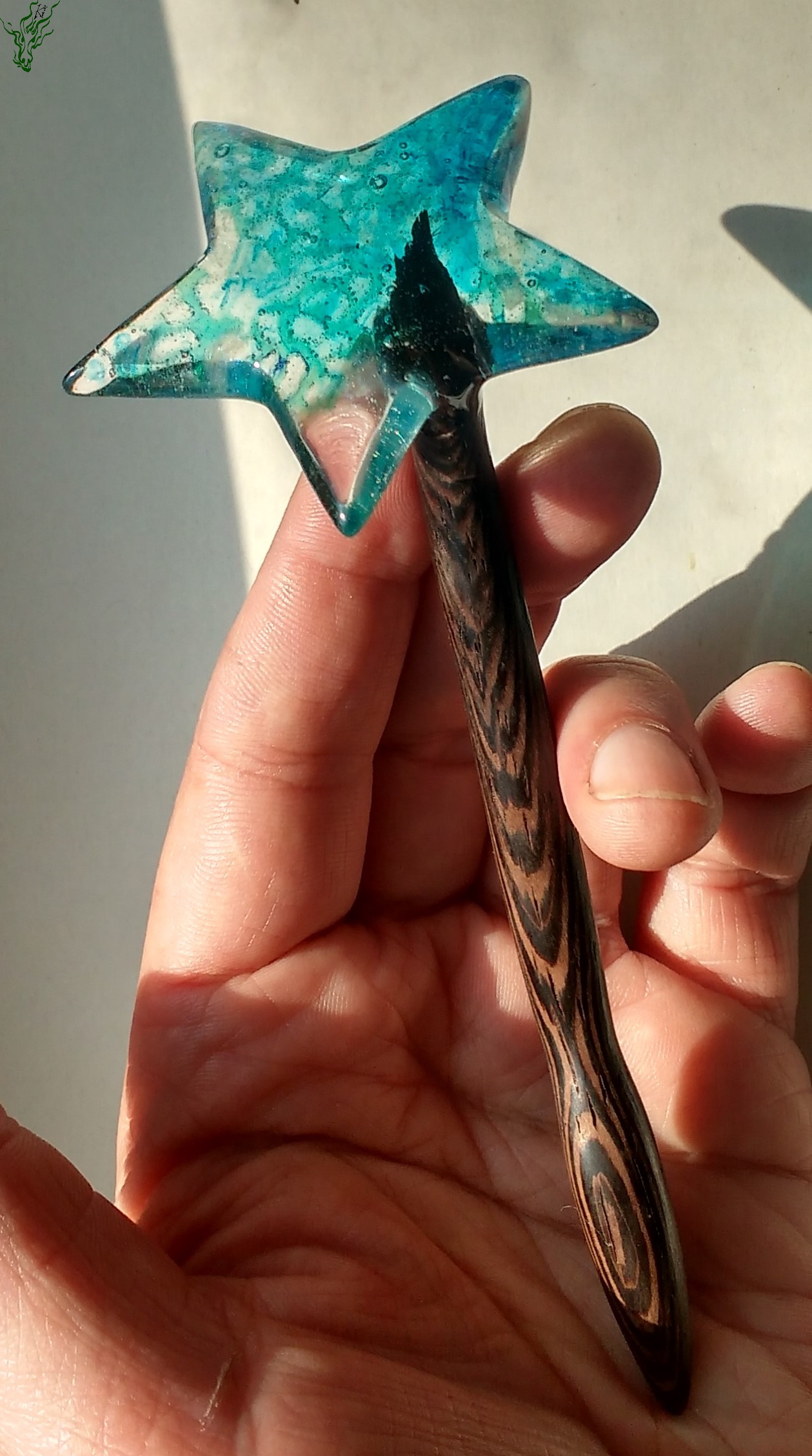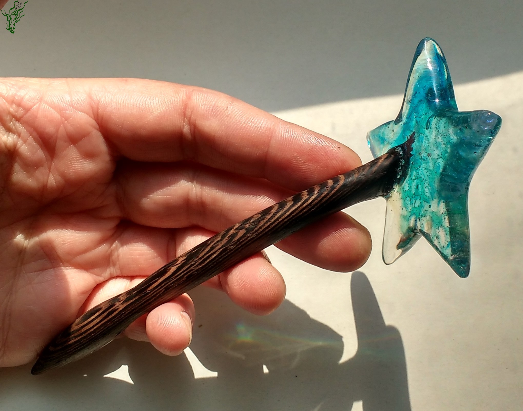 Dieser Gletscherstab präsentiert glänzendes Resin mit magischer Vielfalt auf  aufregendem, mehrfarbig gemustertem  WengeHolz. Die Farbwelt bewegt sich im türkis Bereich und hat eingebaute Bläschen und Leopardenmuster in grün. Mit kleinem Nöpsie für sicheren Halt, so konzipiert, dass sich der Stern an deinen Dutt anfügt  & gut ausbalanciert.