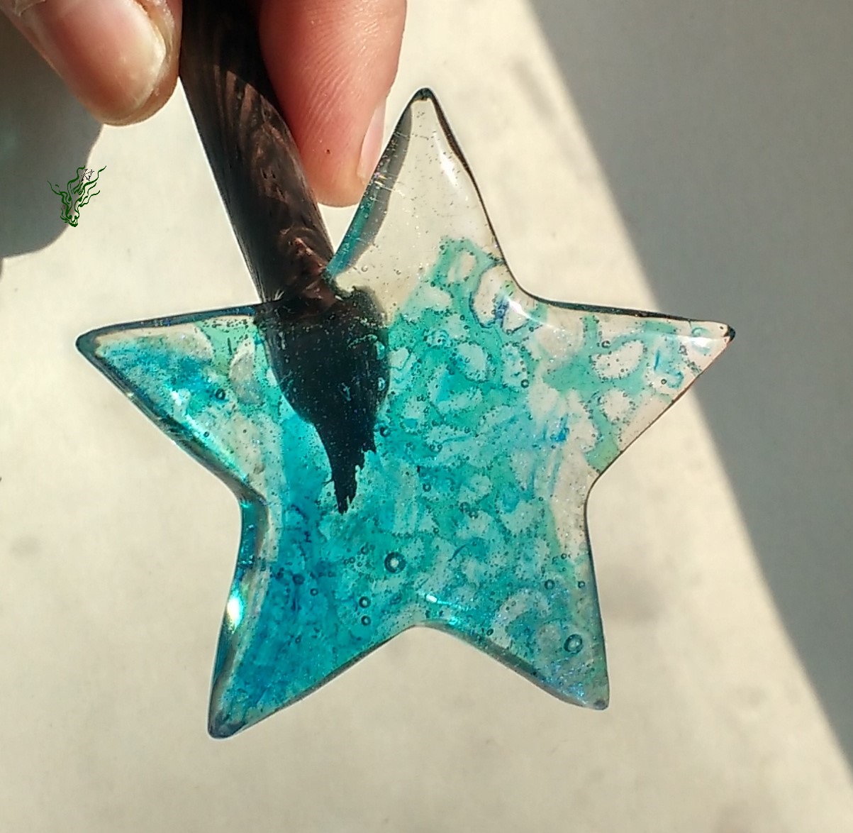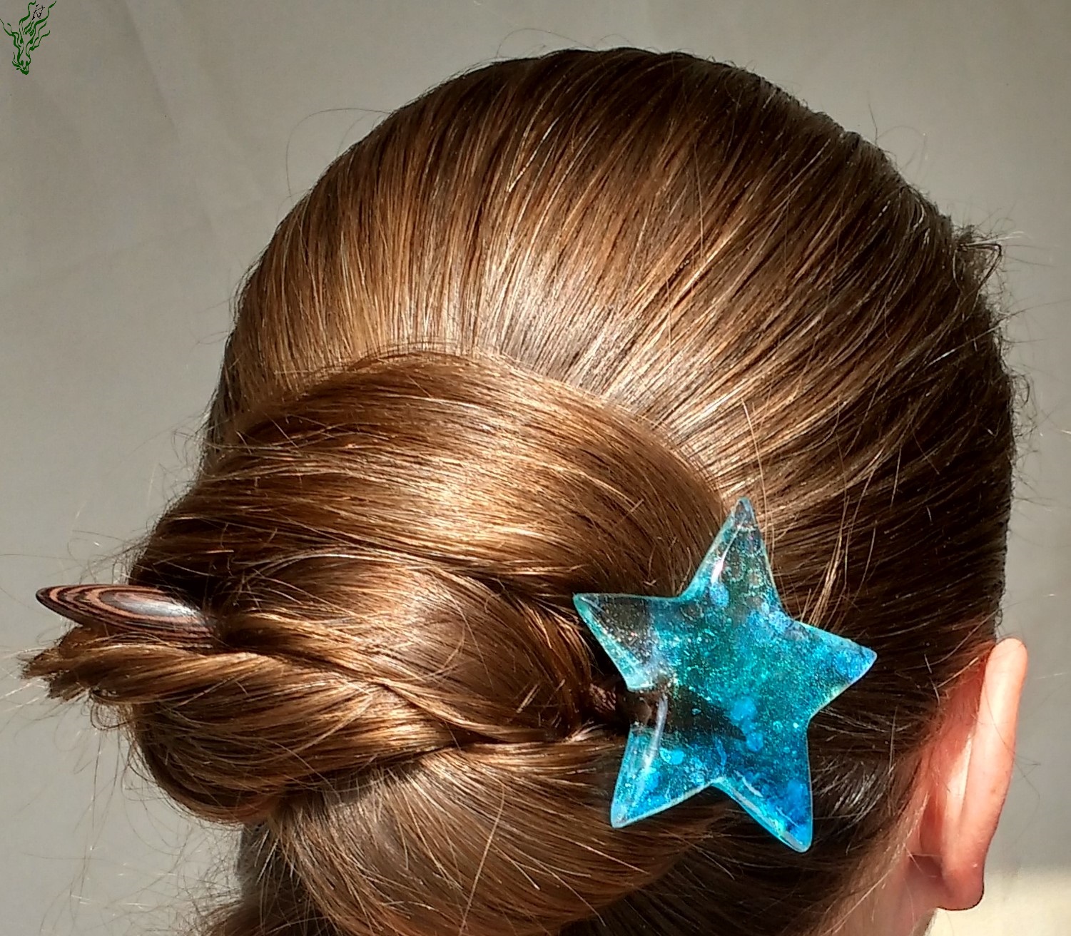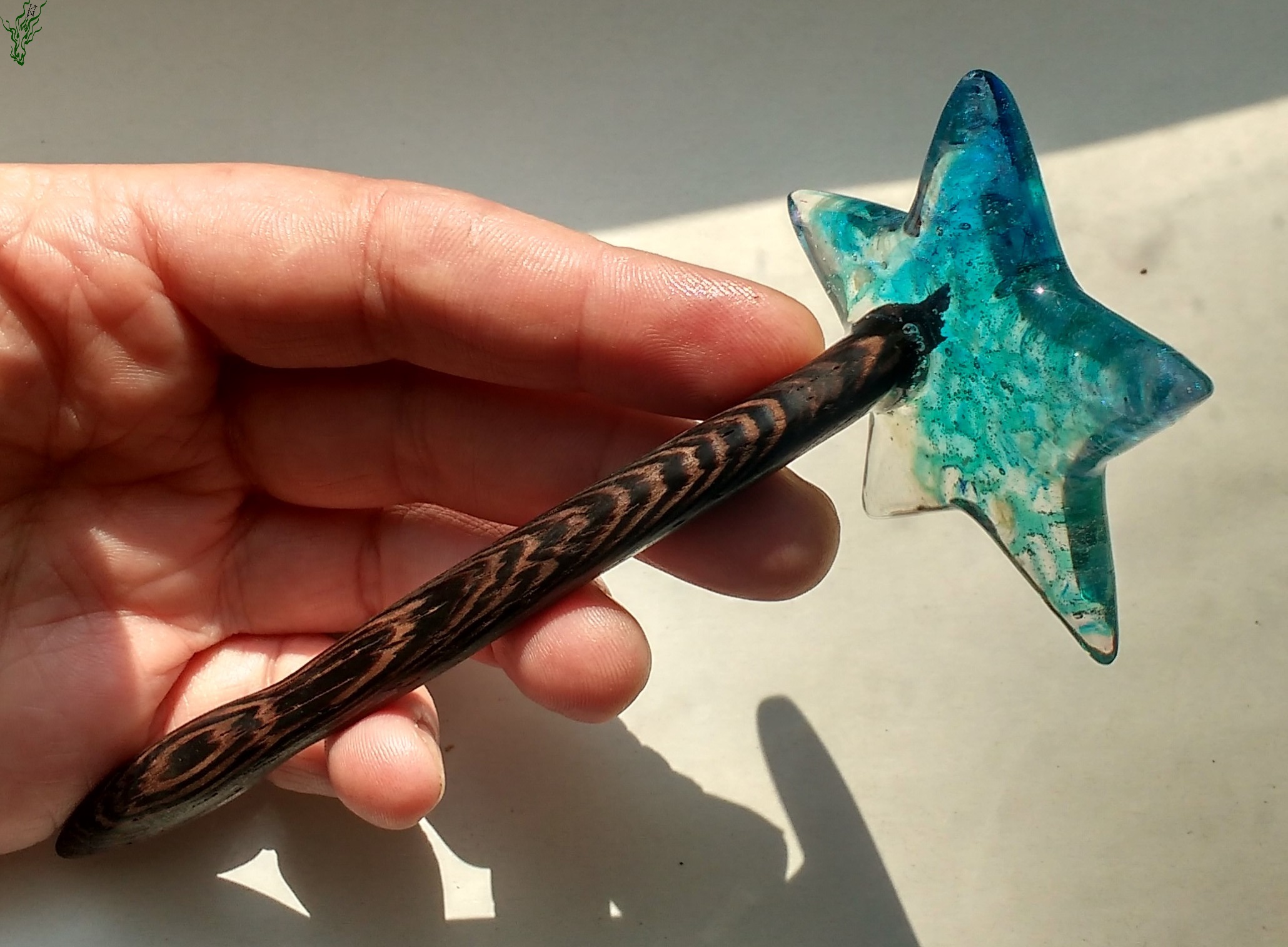 Dieser Gletscherstab präsentiert glänzendes Resin mit magischer Vielfalt auf  aufregendem, mehrfarbig gemustertem  WengeHolz. Die Farbwelt bewegt sich im türkis Bereich und hat eingebaute Bläschen und Leopardenmuster in grün. Mit kleinem Nöpsie für sicheren Halt, so konzipiert, dass sich der Stern an deinen Dutt anfügt  & gut ausbalanciert.