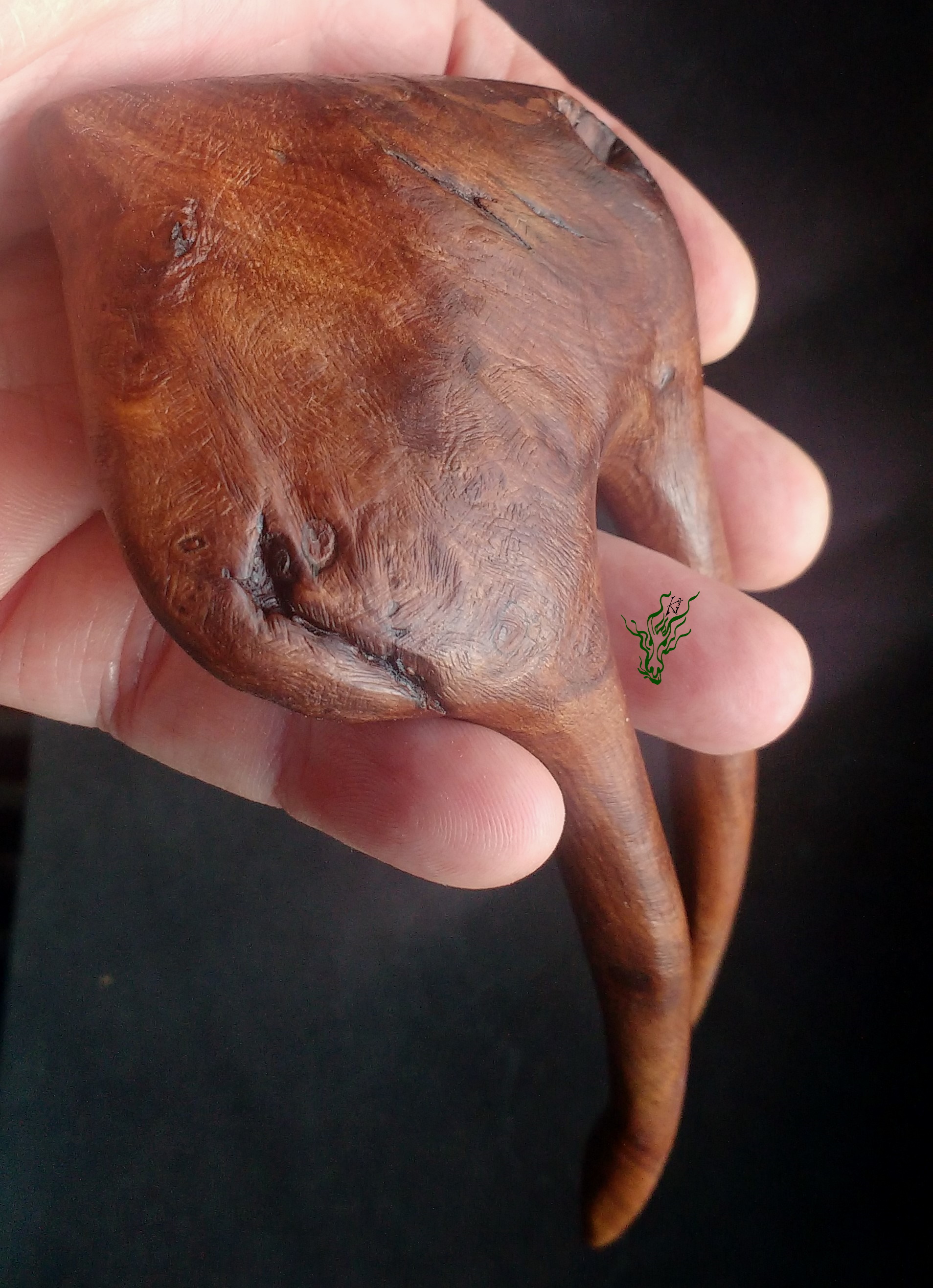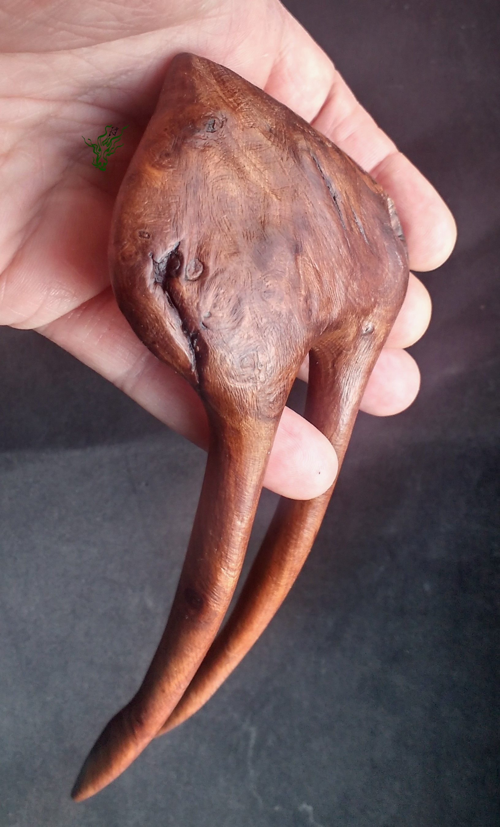 Wie du weißt, bin ich ein WacholderHolz Fan. Es ist nicht nur selten in dieser Größe zu bekommen, weil Wacholder sehr langsam wächst. Das spannende Holz hat auch mit seinen Farben & seinem Duft damals den Jadedrachen geweckt. Frisch erstrahlt es in wahnsinnigen Rottönen und an dieser Haarforke siehst du, wie wunderschön es altert. Du weißt, unter den schokoladigen Tönen schläft sein dunkelrotes Herz. Ich habe ein verwachsenes Stück gewählt, in dem sich ein paar besonders wilde Wachstumsjahre spiegeln. Es ist unberechenbar verknorkelt, so entstanden die Verwirbelungen der einzelnen Jahresringe. Und so viel Wildheit muss an einigen Stellen mit Epoxy stabilisiert werden. So konnte ich auch die abgefahrensten Muster im Holz erhalten & seine ganze natürliche Schönheit sichtbar machen. Deshalb habe ich auch ein bisschen Naturkante dran gelassen.