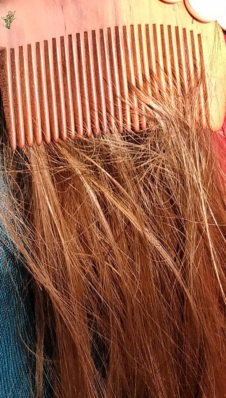 Ich verwende übrigens immer noch meinen alten, abgebrochenen Pfirsichholz- Kamm – natürlich streichelsanft geschliffen. Irgendwie mag mein Haar genau dieses Holz ^^
