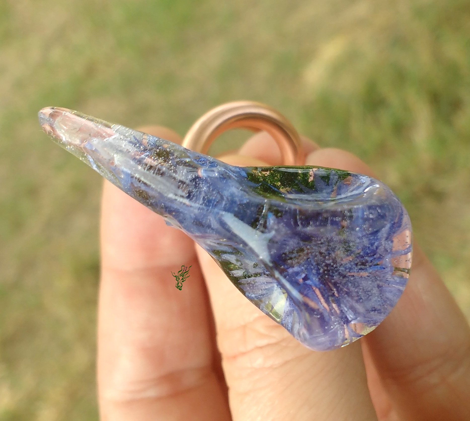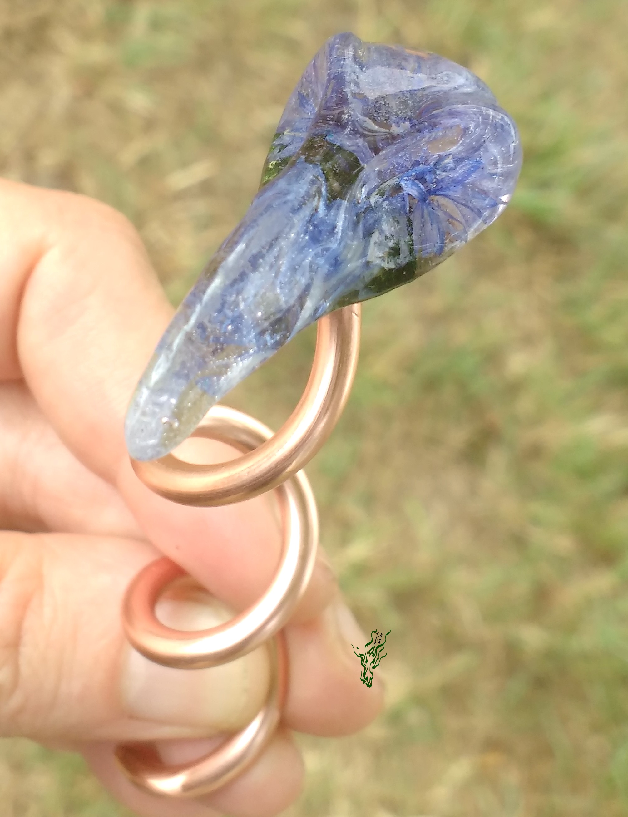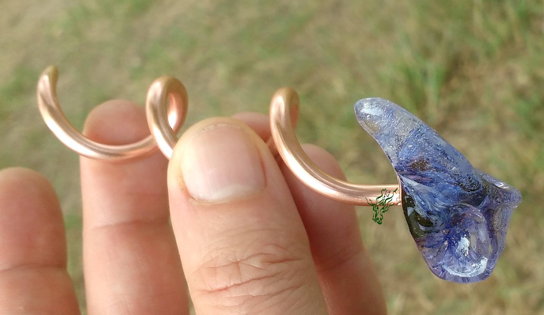 Blaue Wiesenblumenblüten, konserviert in einem kühl-klarem Rabenschädel. Der Haarstab ist aus stabilem Kupfer. Den verbiegst du nicht so leicht. Die Spirale verteilt das Gewicht gut & wegen des geringen Volumens kannst du besonders eng wickeln.