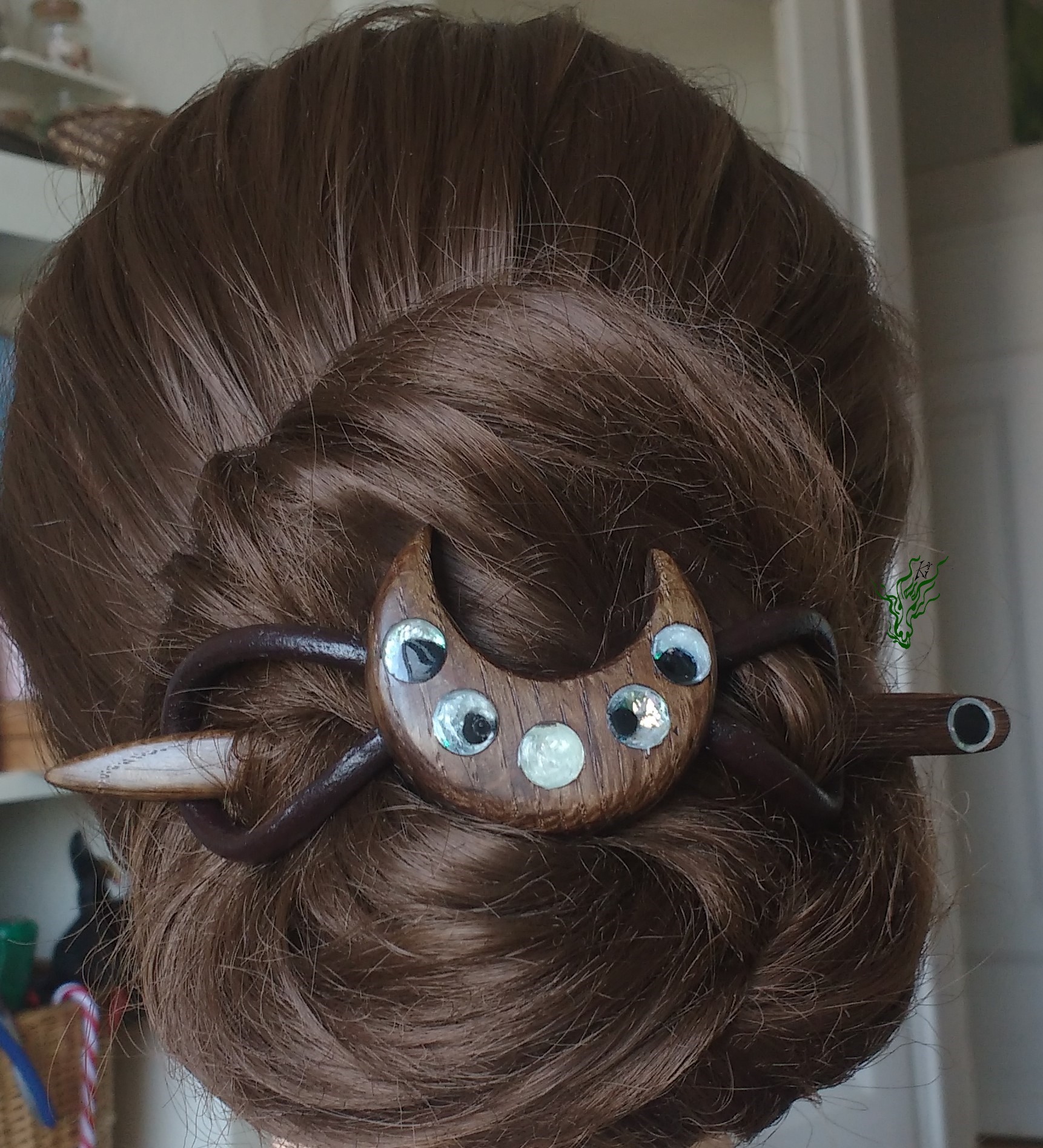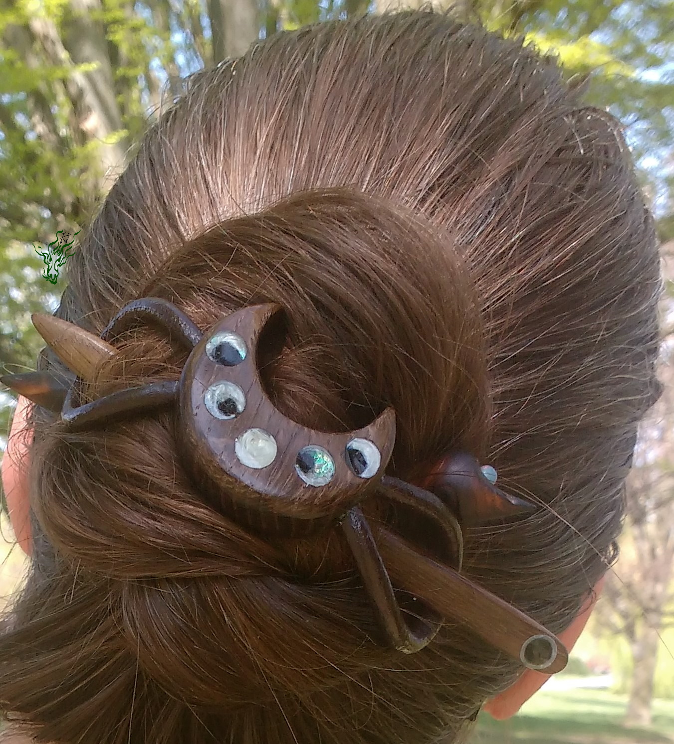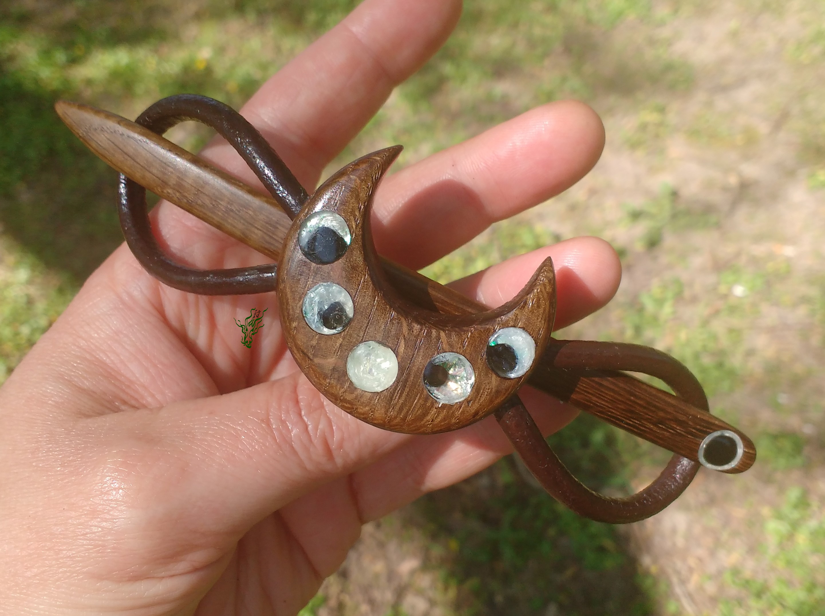 Haarspange aus Räuchereiche, Resin, Schimmerpigmenten & antikem Leder. Ich liebe die schroffe Struktur, die geheimnisvollen Muster, die wunderschöne Maserung & besonderen Farben, die durch den Räucherungsprozess des Holzes hervor gehoben werden. Der sanfte Schimmer der Mondphasen gibt einen mystischen Kontrast – Haarschmuck wie ein Amulett.