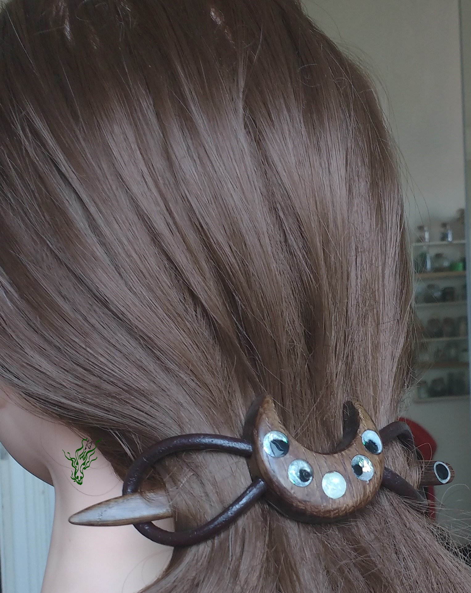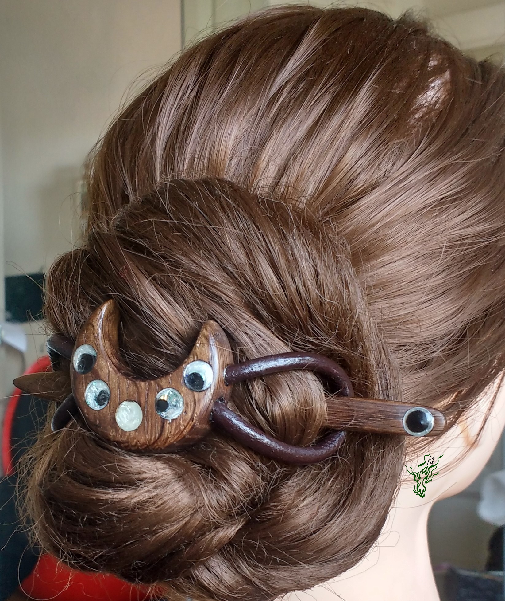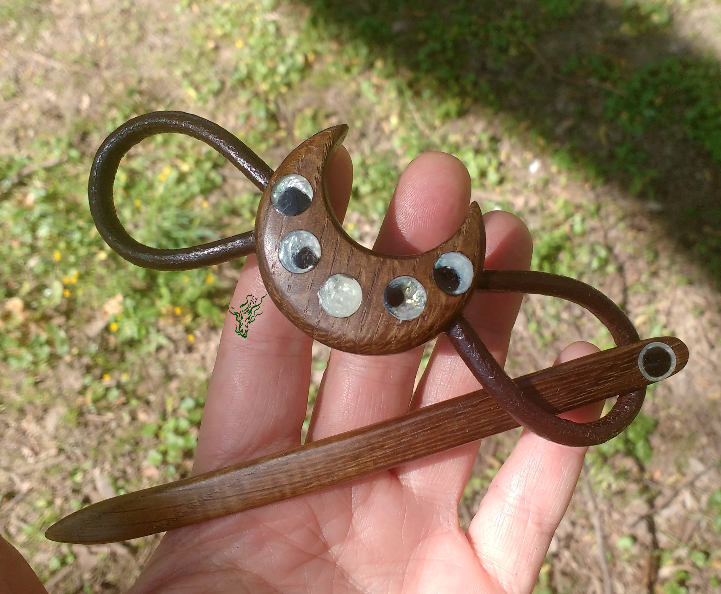 Haarspange aus Räuchereiche, Resin, Schimmerpigmenten & antikem Leder. Ich liebe die schroffe Struktur, die geheimnisvollen Muster, die wunderschöne Maserung & besonderen Farben, die durch den Räucherungsprozess des Holzes hervor gehoben werden. Der sanfte Schimmer der Mondphasen gibt einen mystischen Kontrast – Haarschmuck wie ein Amulett.