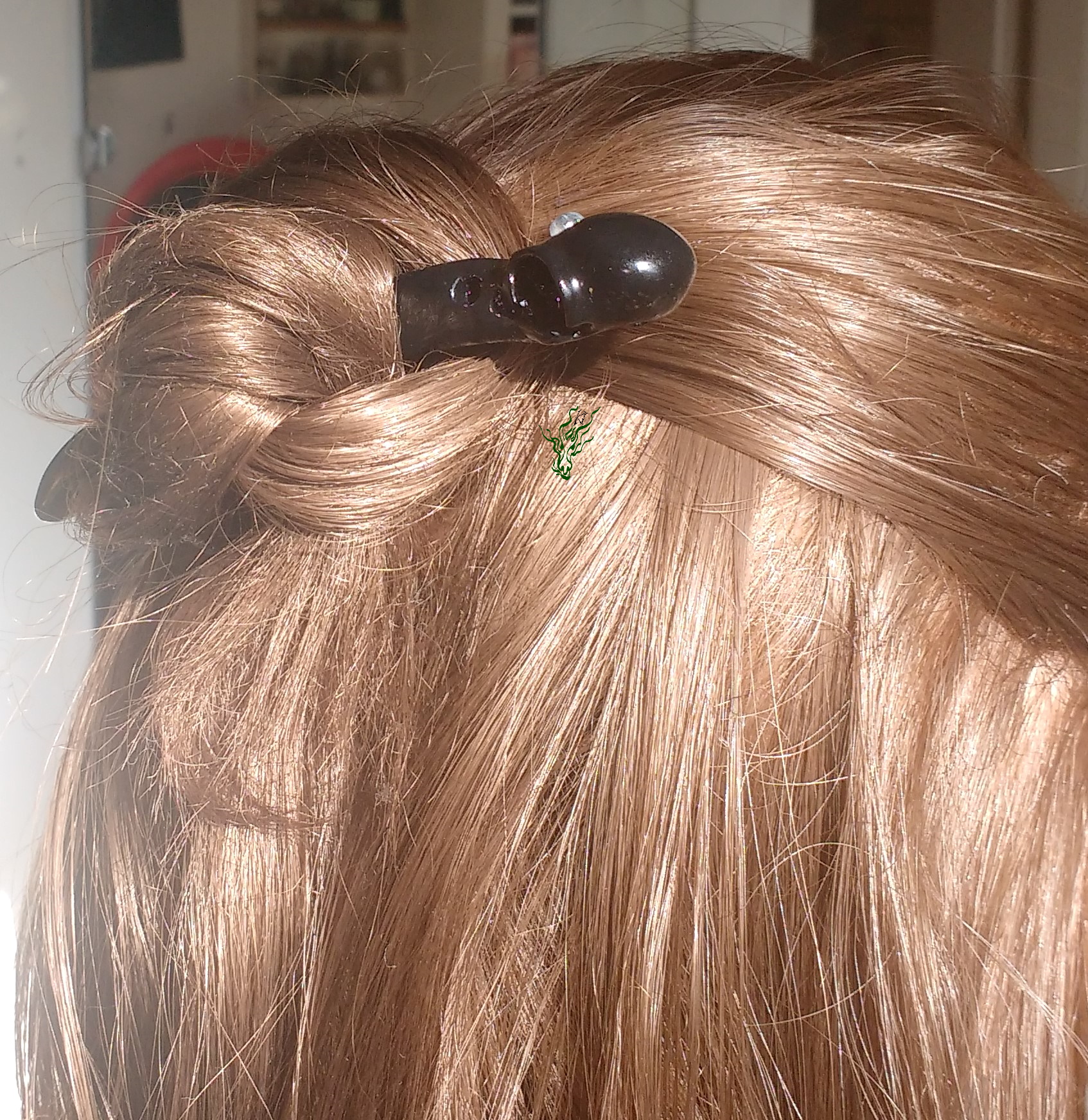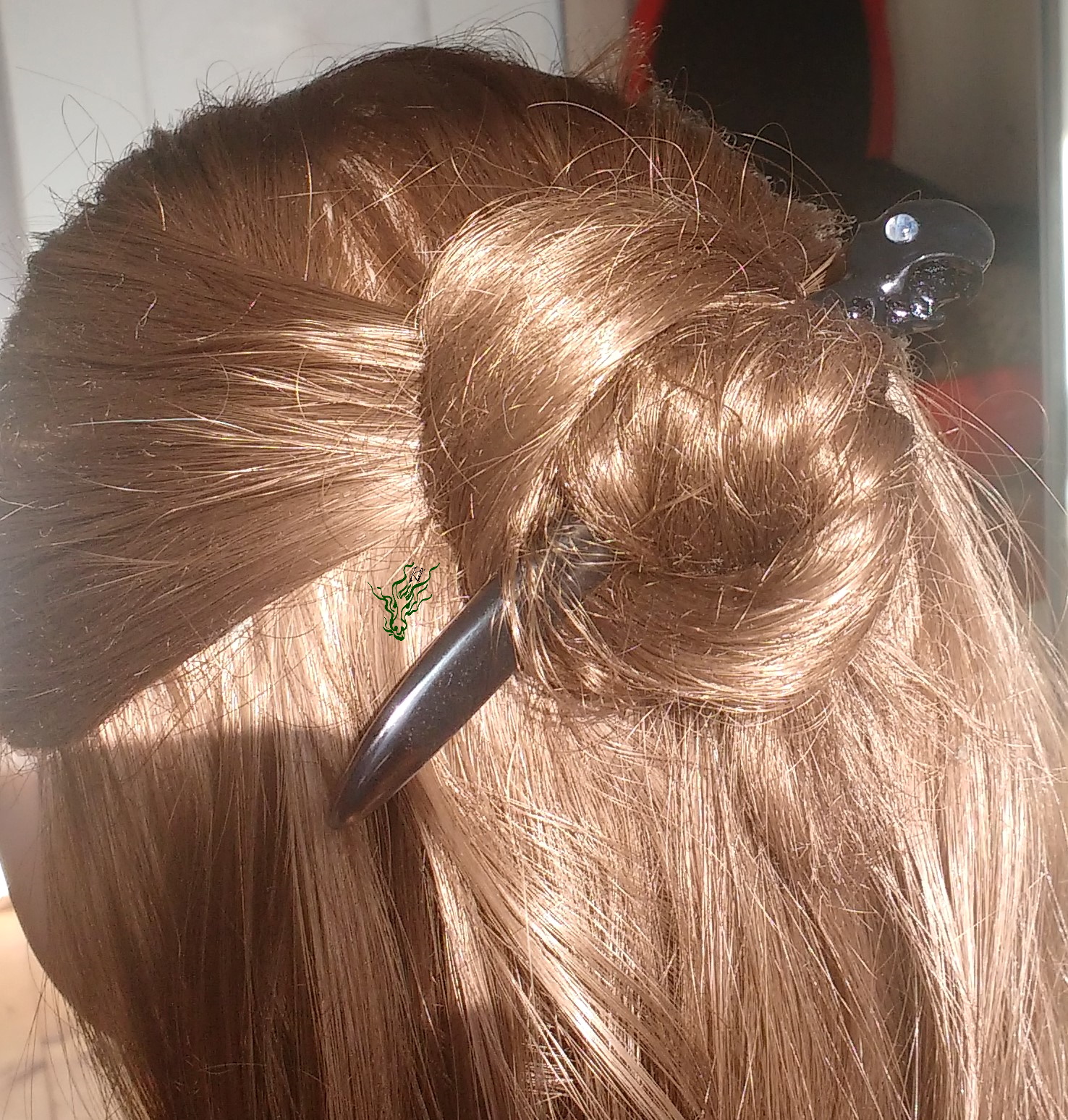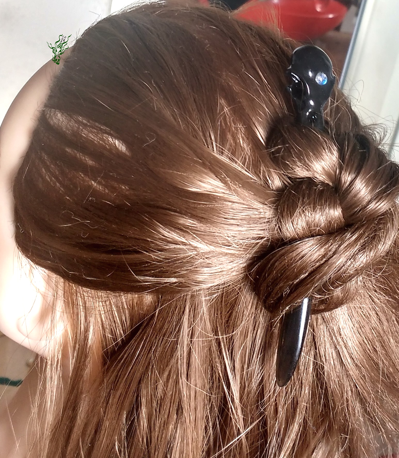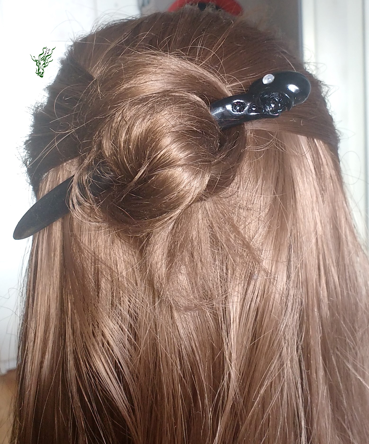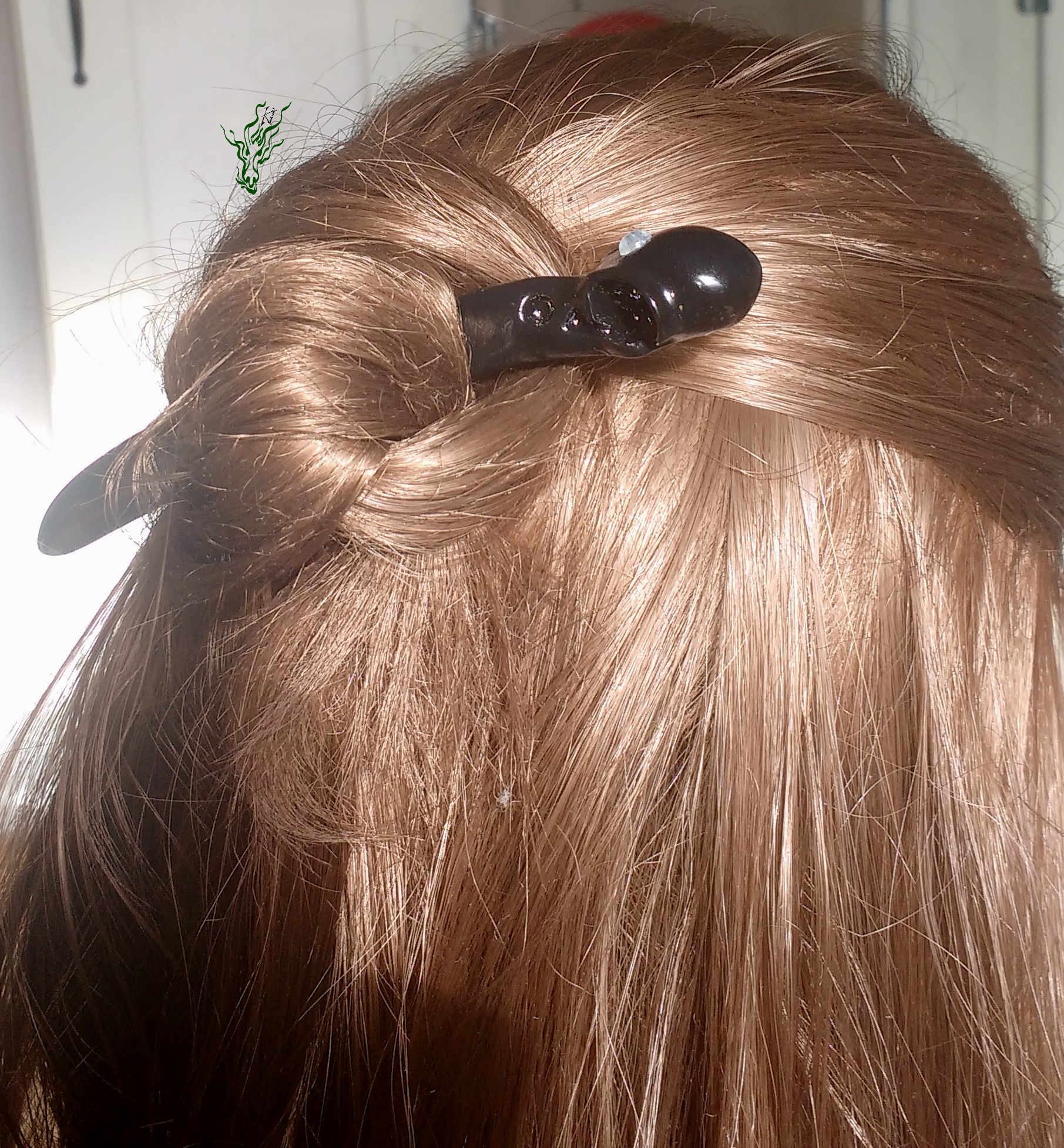 Du siehst, wie sich der Haarstab durch seine Kopfformbiegung in deine Frisur schmiegt. Guter Anfänger Haarschmuck . Seidenglatt & superleicht.