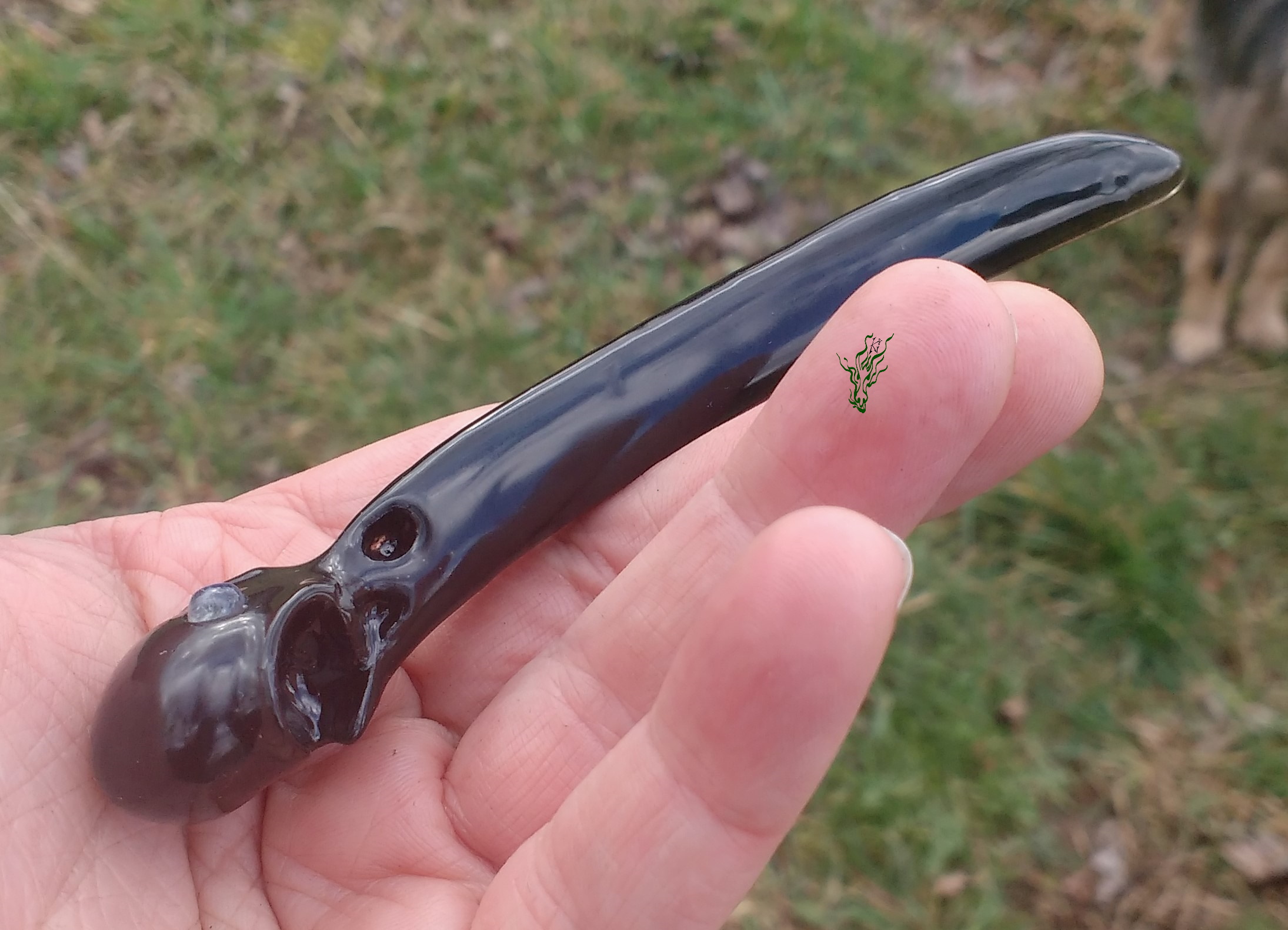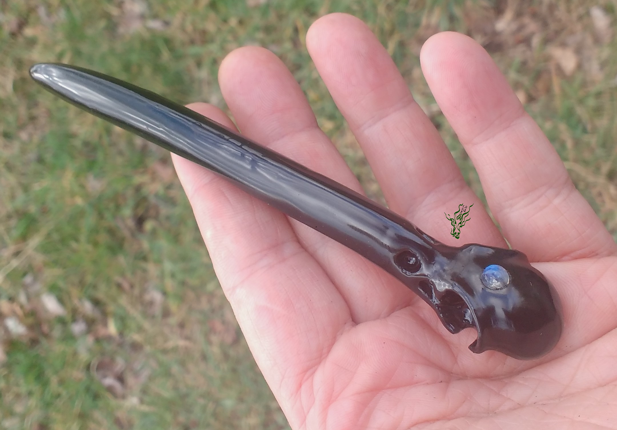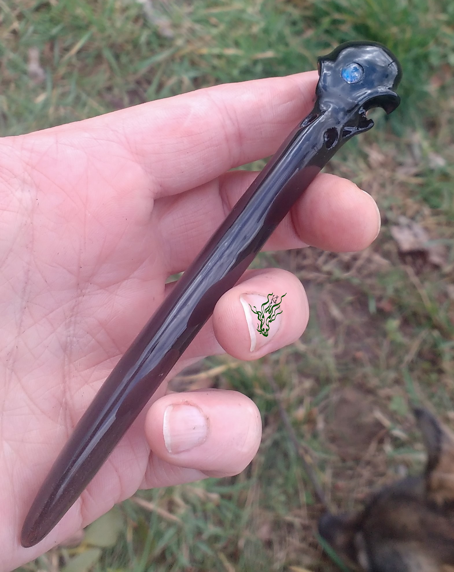 Lieber Rabenfan, dein neuer Haarstab ist ein Rabenschädel aus schwarzem Resin. Detailliert von Hand geschnitzt geschnitzt, innovativ & bequem. Morbide & schön. Mit einem echten Mondstein, der bläulich schimmert.