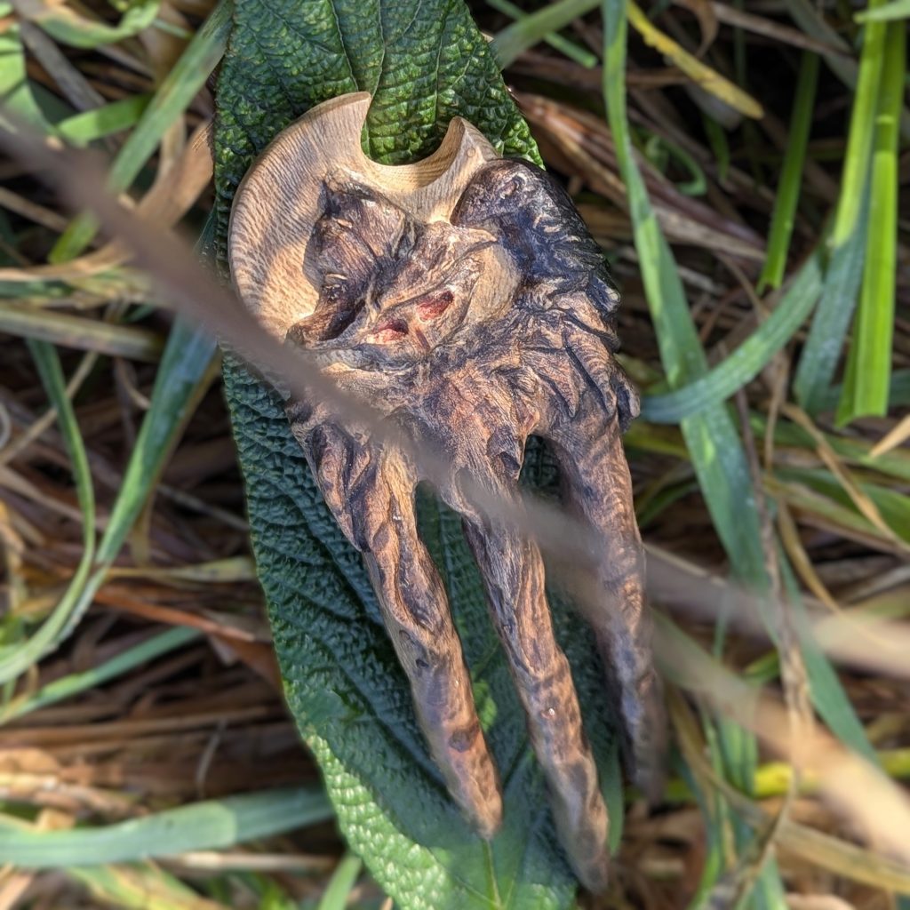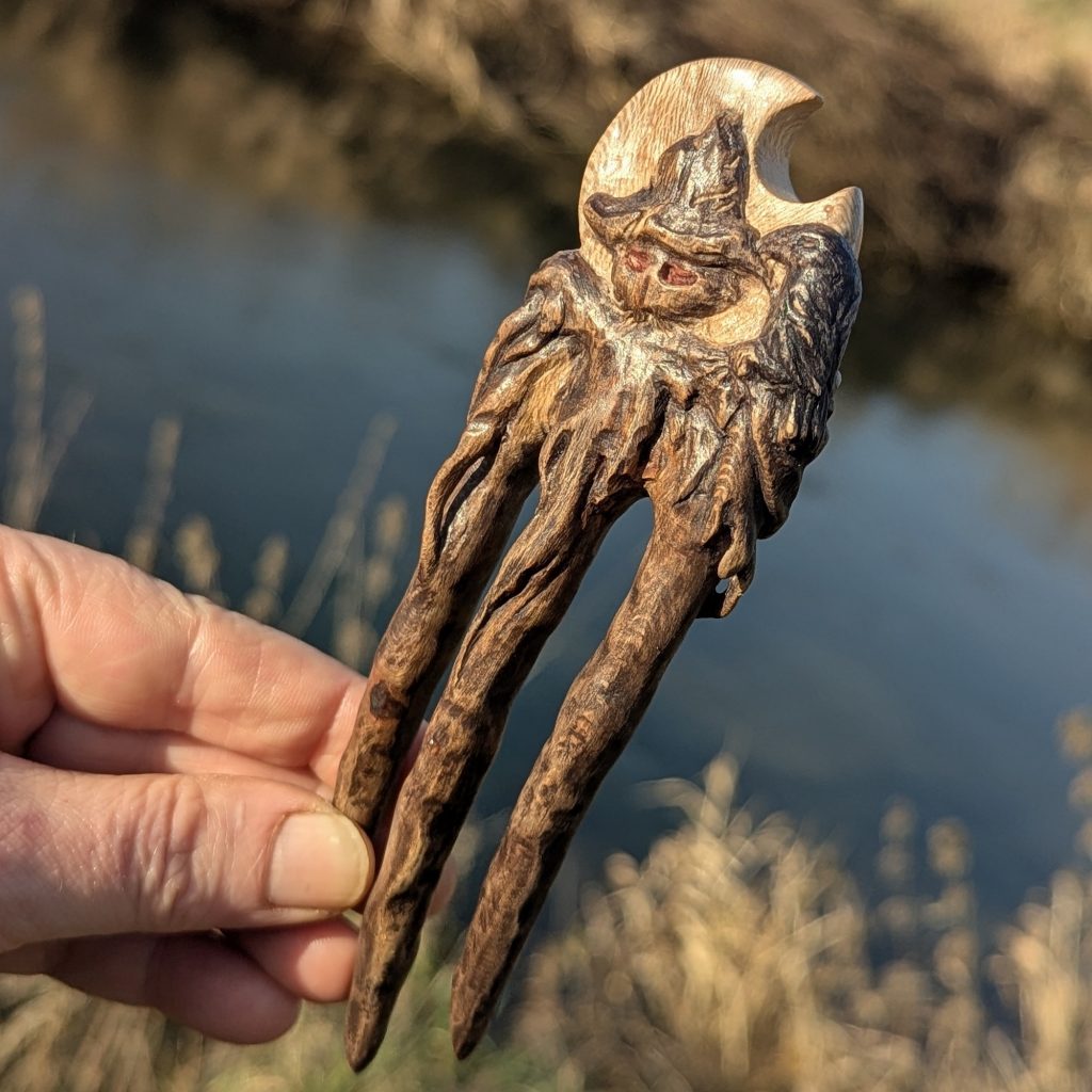 Haarforke aus Platanenholz: „Haunted Best Friends“ – Handgeschnitztes Unikat