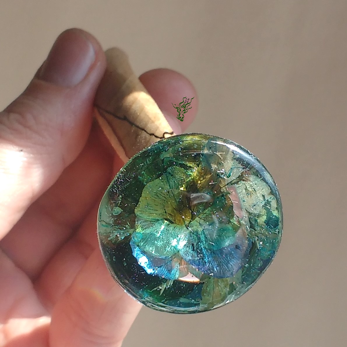 Aaaaah, ihr seht schon, ich bin neuerdings den breiten Haarstäben verfallen & natürlich muss es die auch als Gletscherstab geben. Sie sind so bequem und auch größere Topper kommen schön harmonisch mit einer breiteren Basis. Die ist aus wunderbar gemasertem spalted beech wood (gestockte Buche), ich vergöttere die interessanten schwarzen Streifen. Und was brauchen wir bei dieser Hitze mehr als eine *Abkühlung*? In herrlichen Swimmingpool- Farben und mit einem gelb-blauen Stiefmütterchen auf Wiese und irisierenden Blässchen.