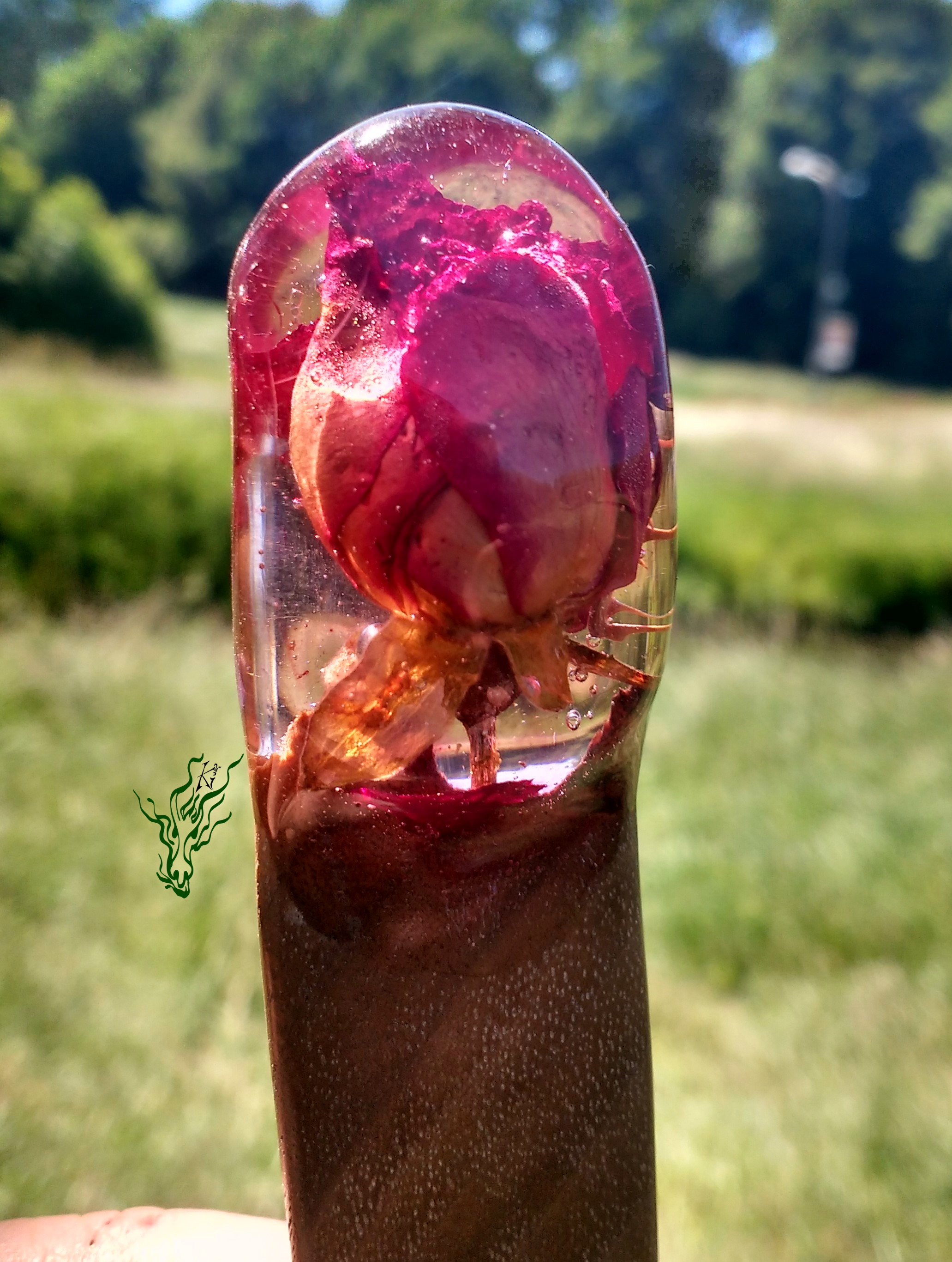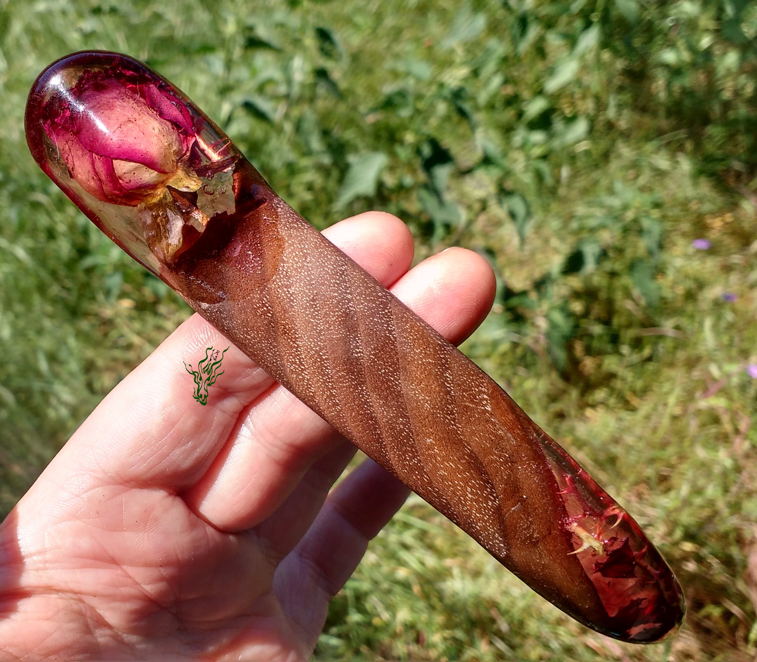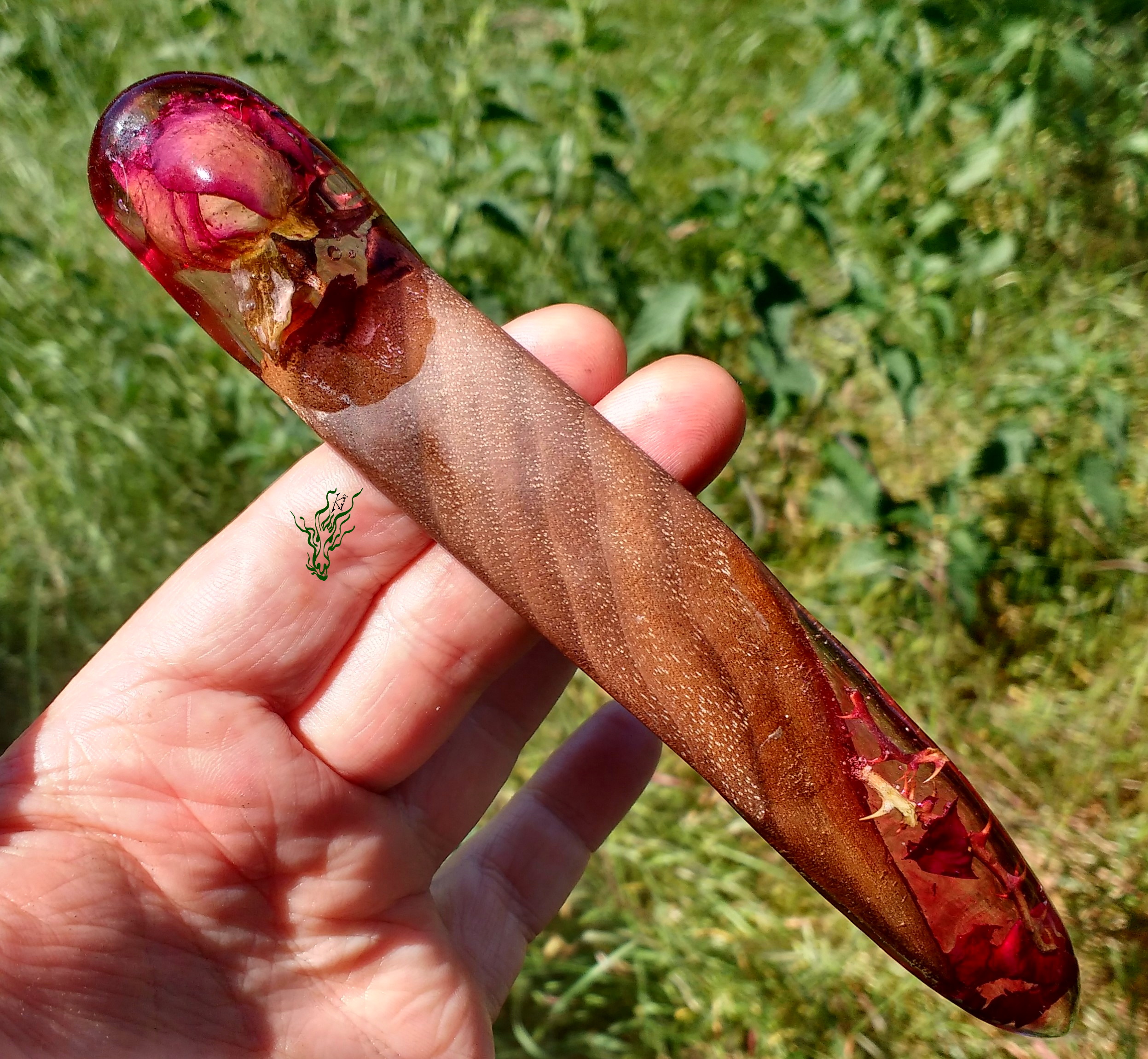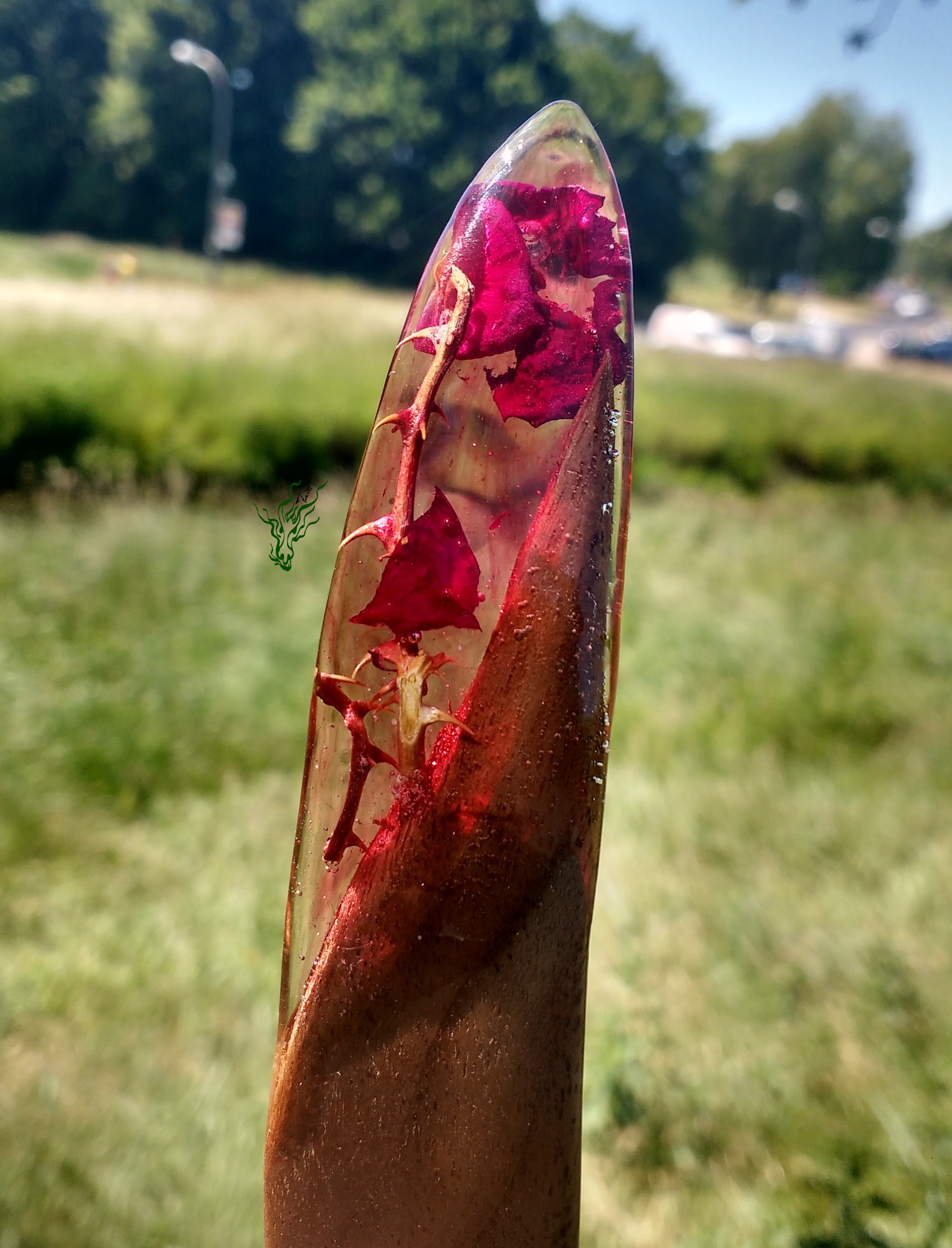 „Die Dornen, mein Kind, sind wie die Blüte Teil von mir. Und danke, dass deine Liebkosung so vorsichtig ist. Wir alle sind zart und dornig, und deshalb zeig ich dir: Dein Blut – rot wie ich – fliesst, weil dein Herz verletzlich ist.“ *** Breiter Gletscherstab , so bequem aus wunderschönem WalnussHolz. Mit Rose & Rosenblättern & Dornen – für Schönheit auf beiden Seiten deines Dutts.