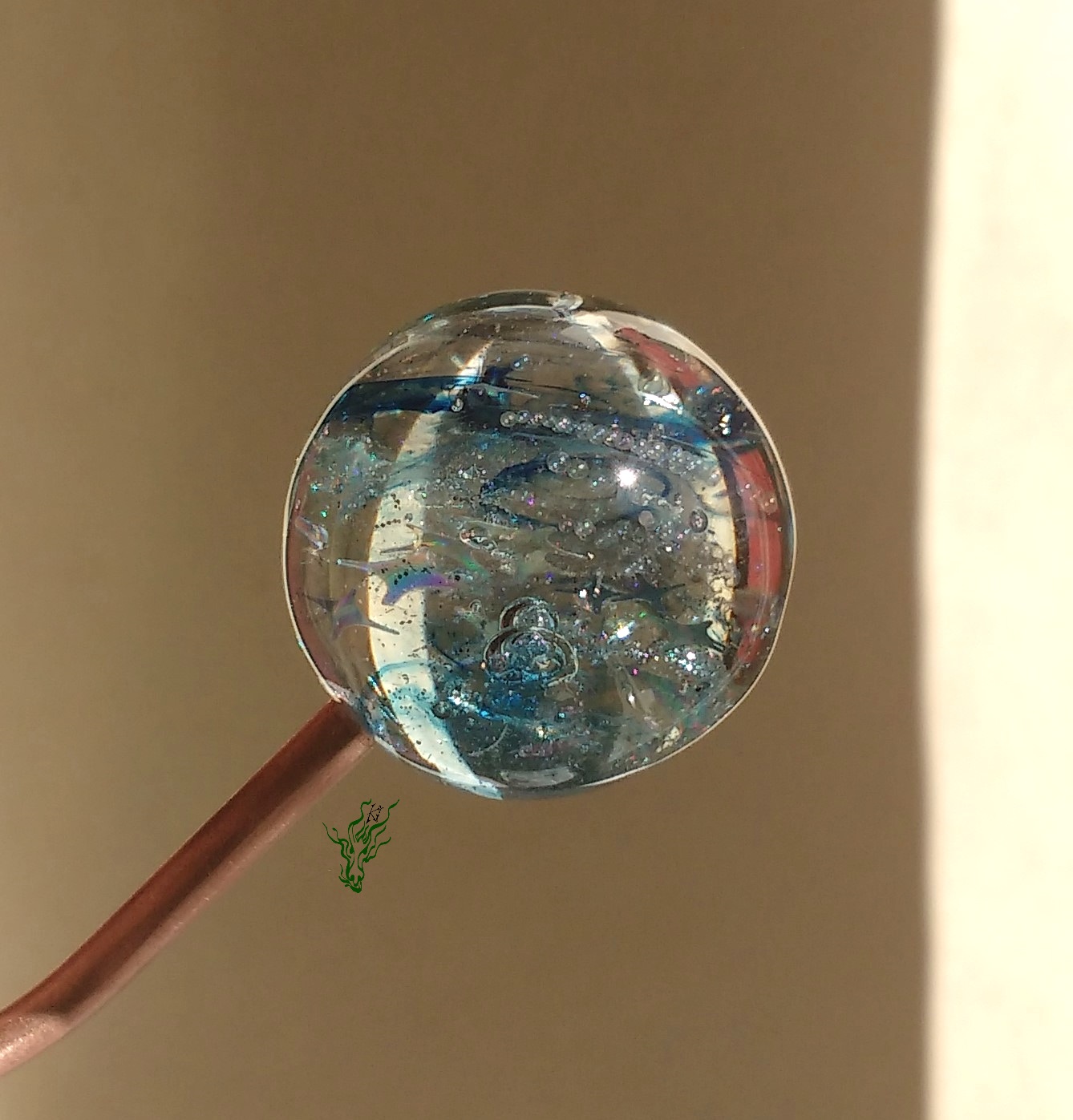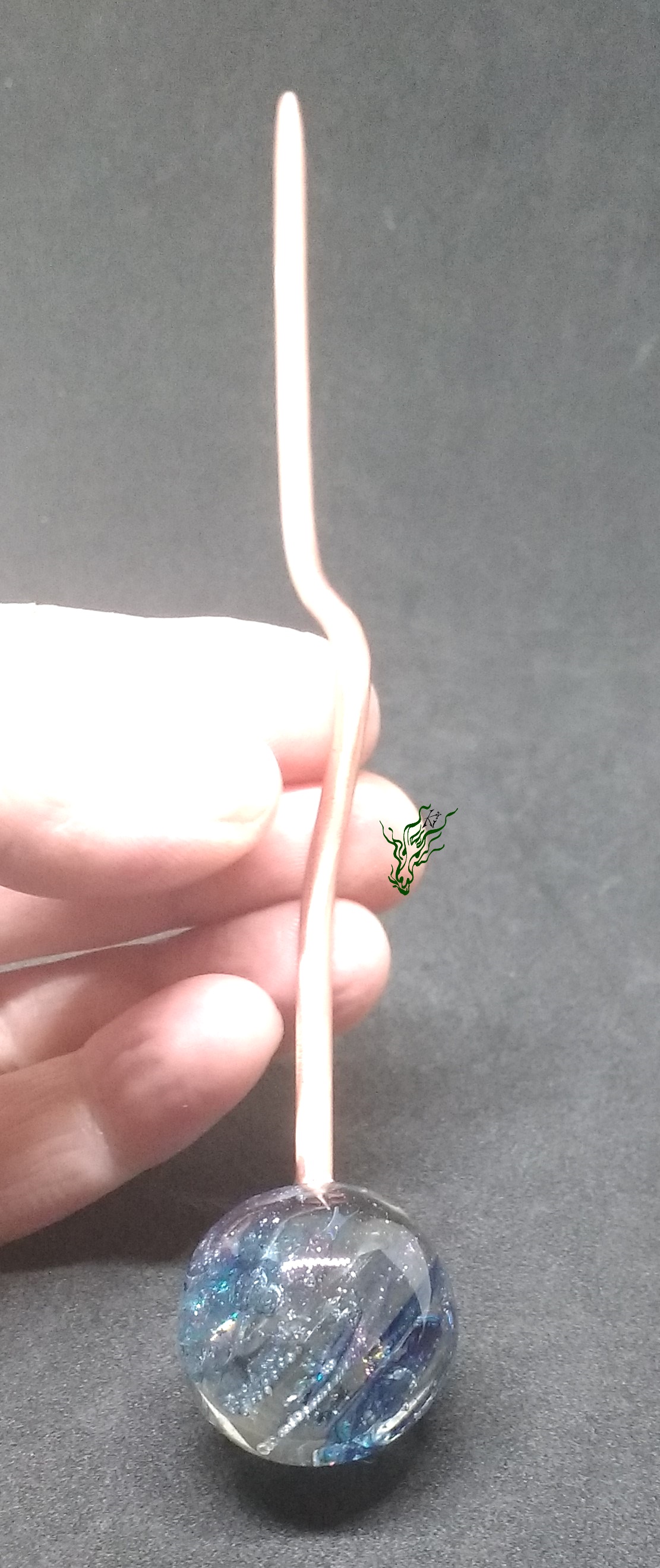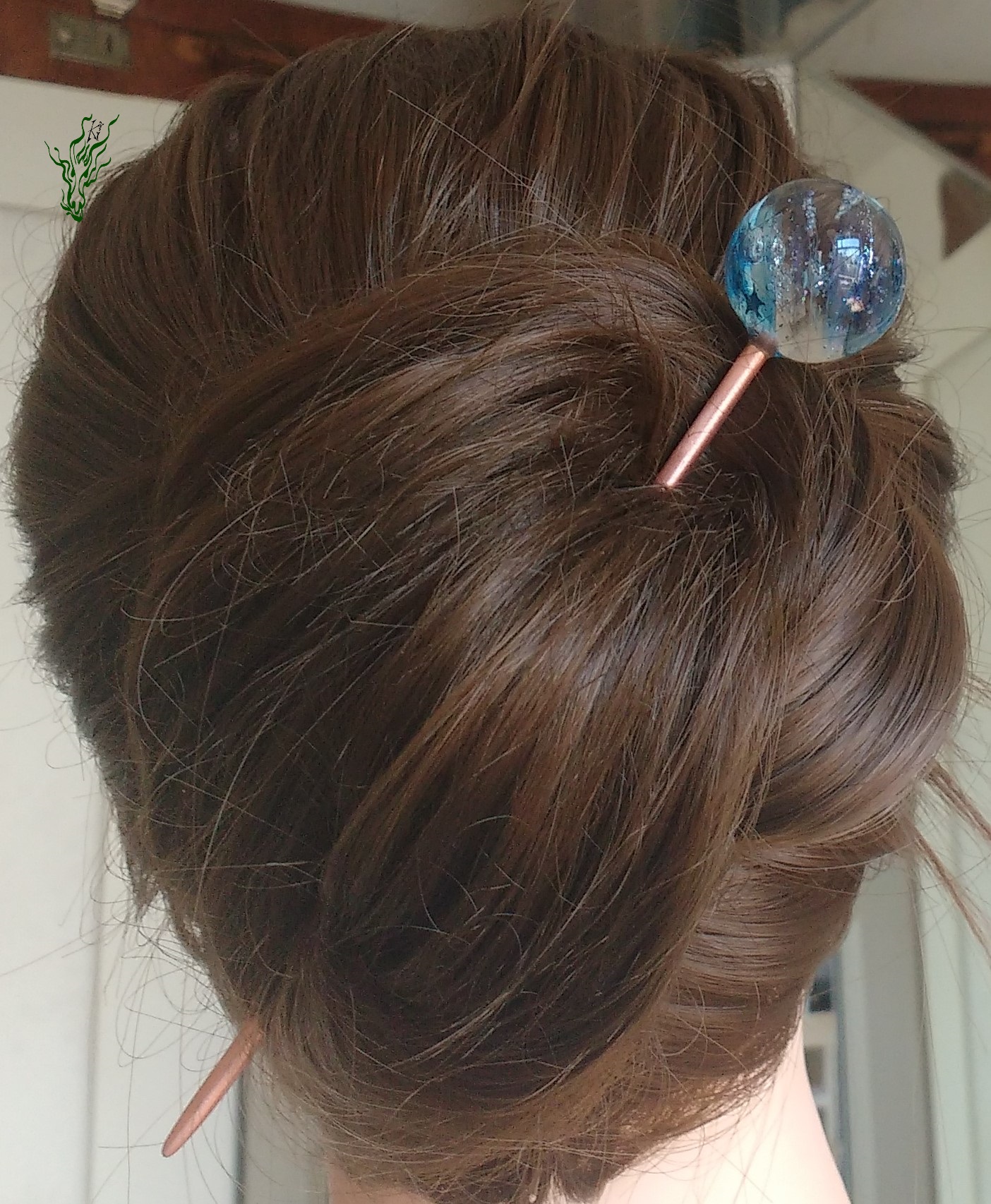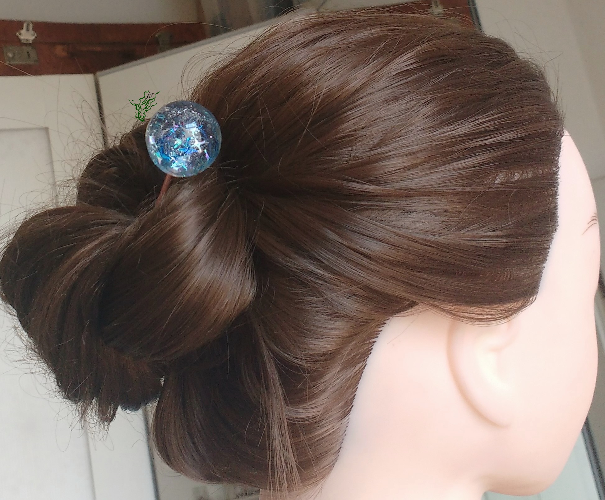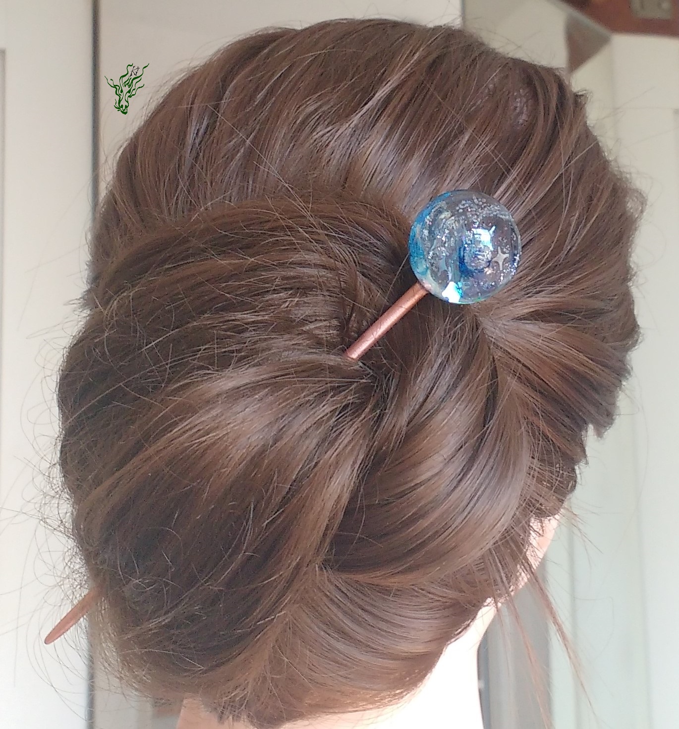 Ein klassischer Kugel- Haarstab – neu und innovativ interpretiert. Ein Kugeltopper wie ein kleines Universum mit Sternen, die je nach Licht silber- regenbogenbunt schimmern. Die Kugel ist massiv – durch die Form des Haarstabs jedoch gut ausbalanciert und hält perfekt im Haar