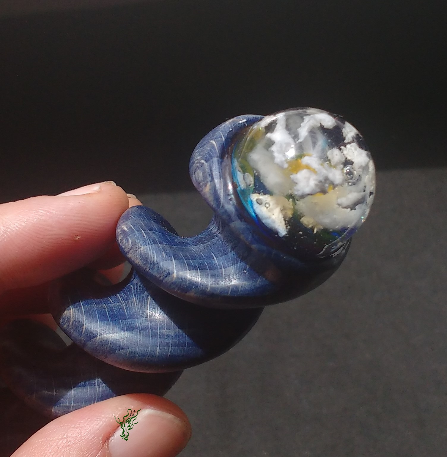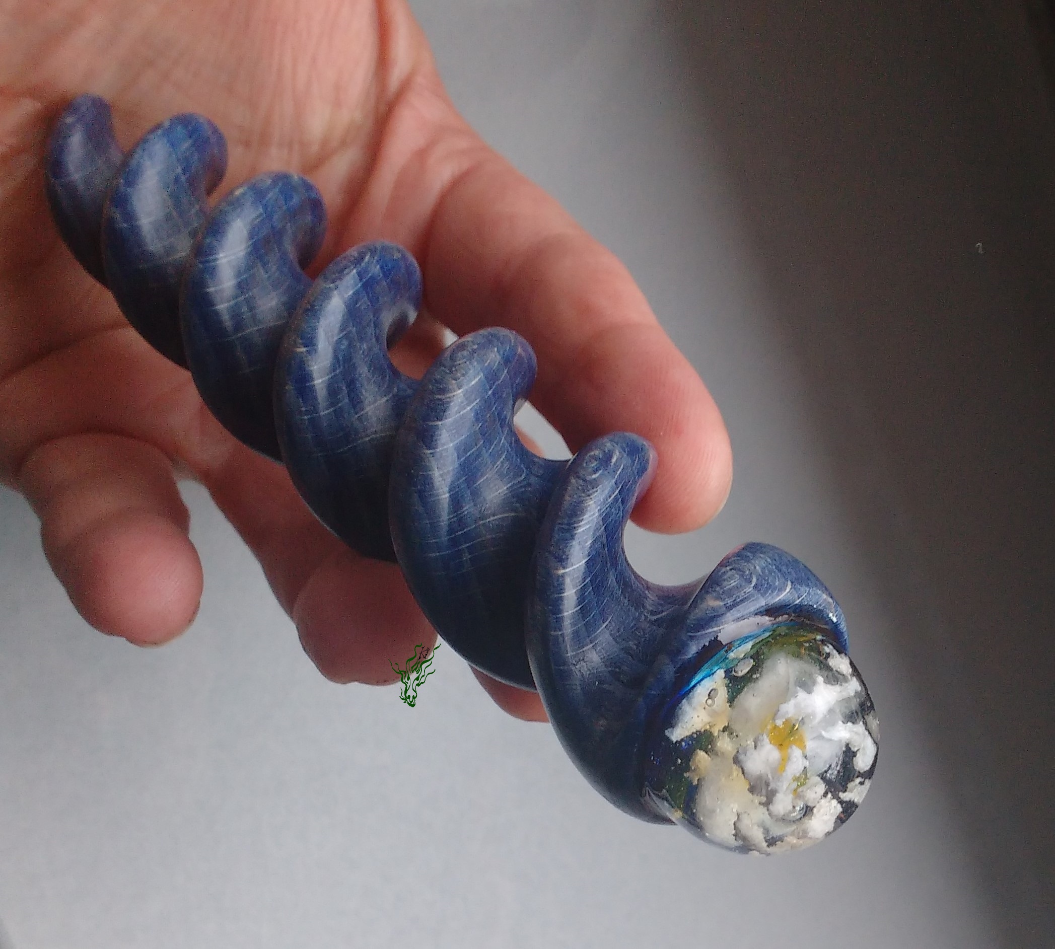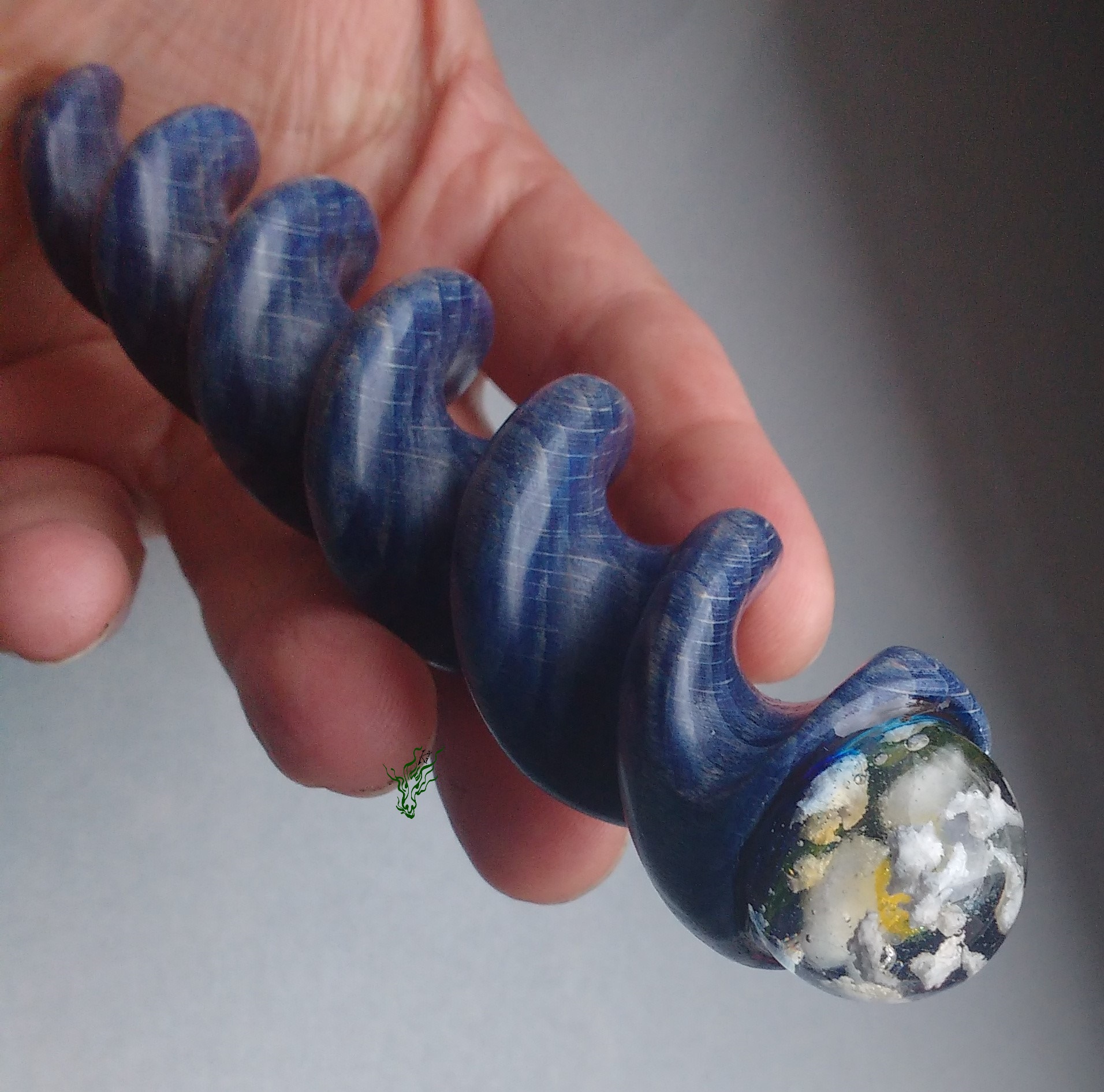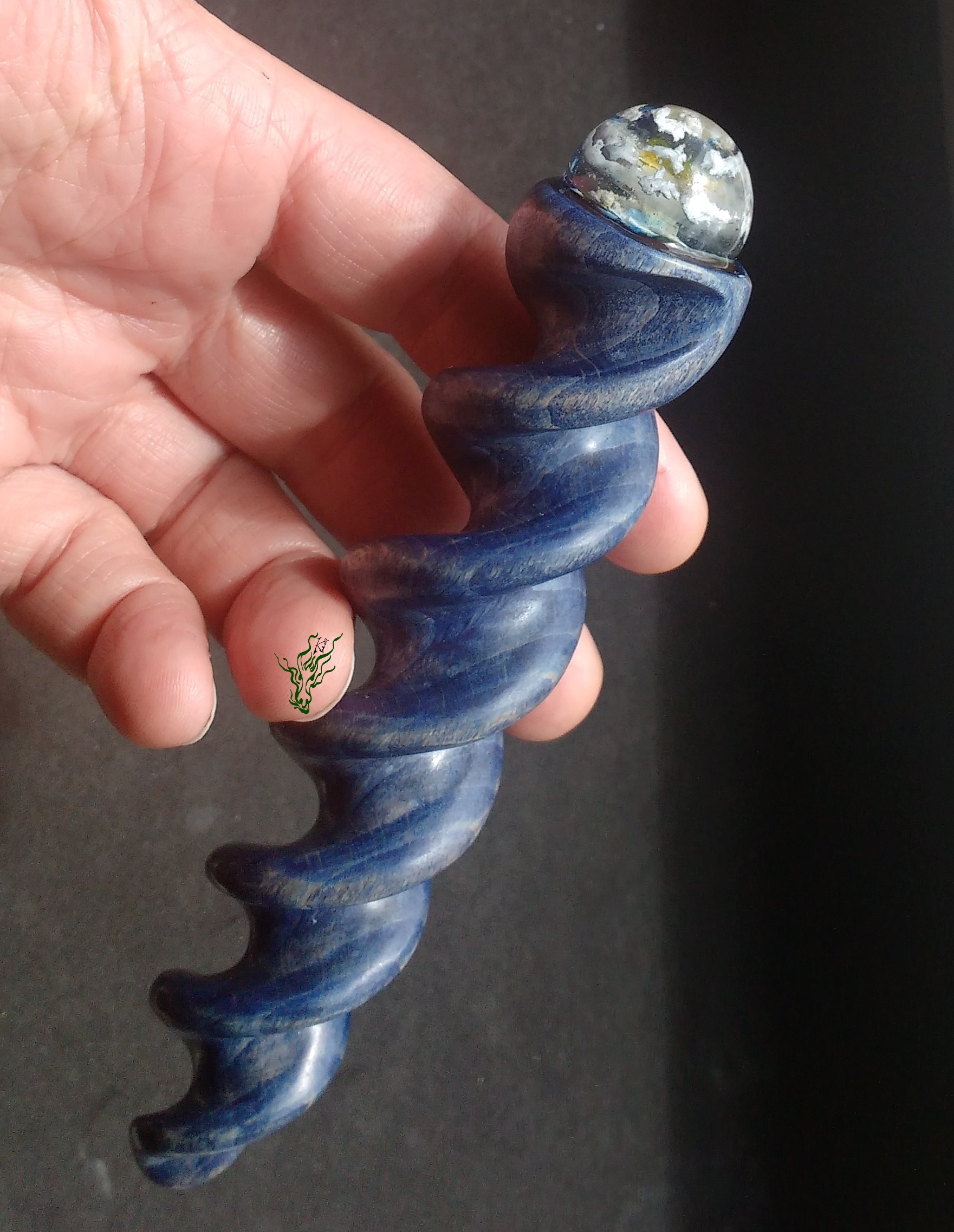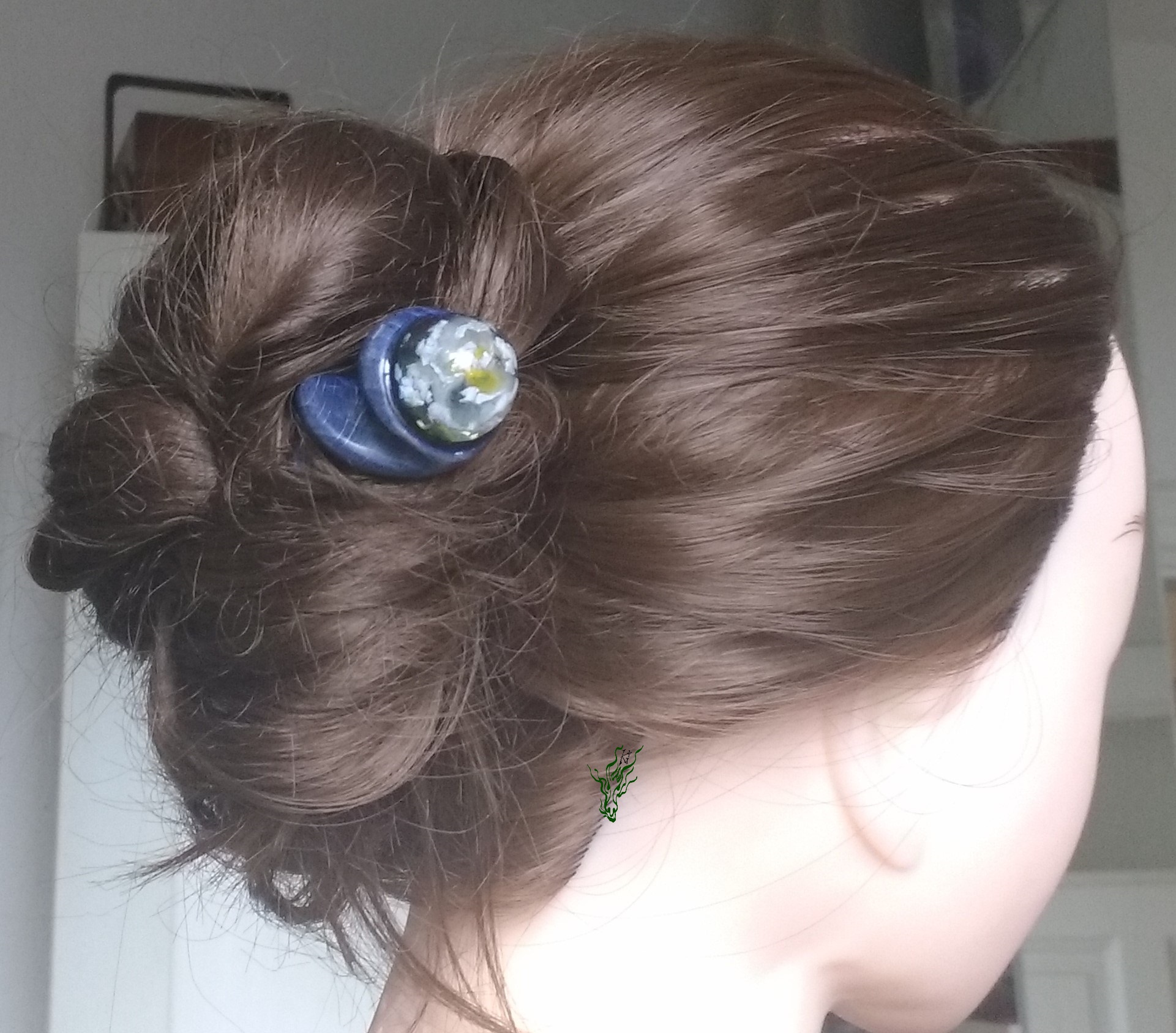 Den Haarstab selbst habe ich von Hand aus einem  Stück  BuchenHolz geschnitzt &  königsblau  gebeizt. Die  Maserung kommt im  kühlen  blau  wunderschön  zur  Geltung. Spiralformen  mag ich am liebsten, wie du weißt – sie halten so gut.
