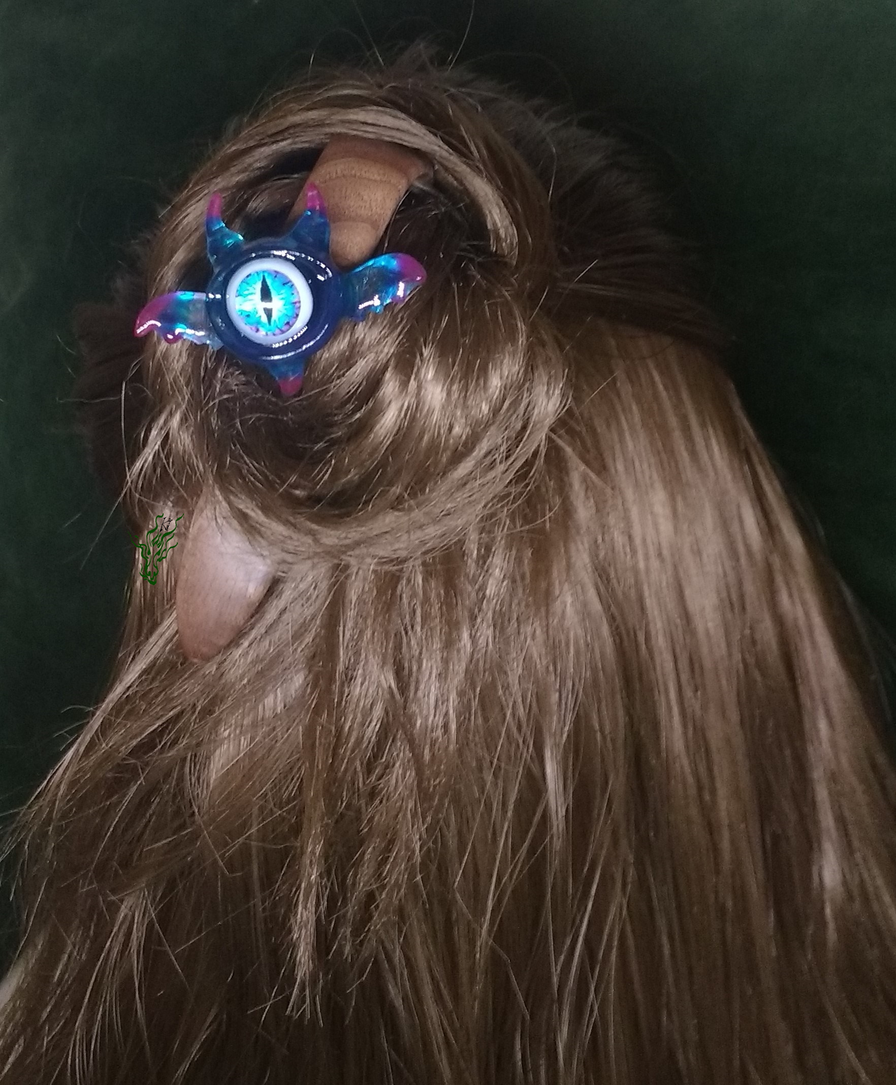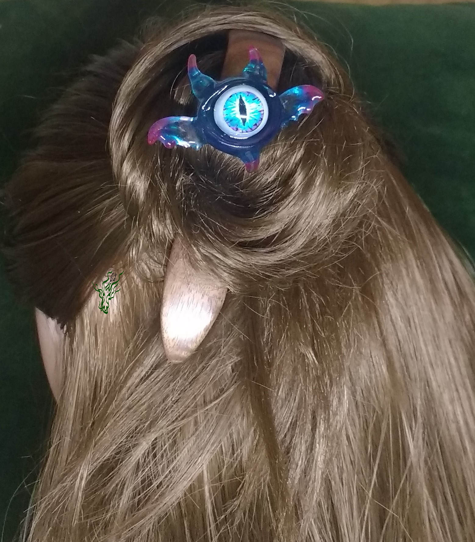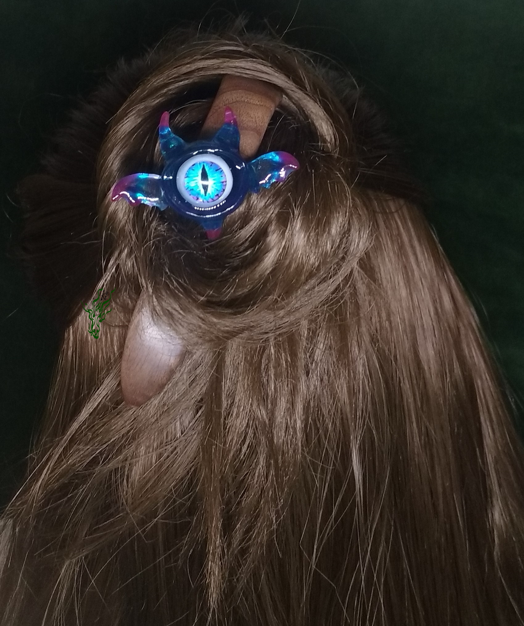 Gehörntes  geflügeltes Auge in RegenbogenFarben (grün-blau-rosa) auf  herrlichem WalnussHolz.  Flacher Haarstab mit  gebogenem evil eye- Topper, der sich dekorativ  über  deinen Dutt  legt. Federleicht und Feenhaar- tauglich.