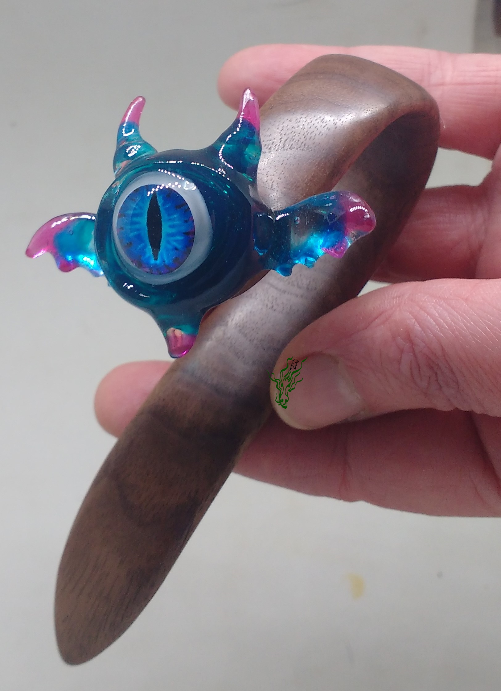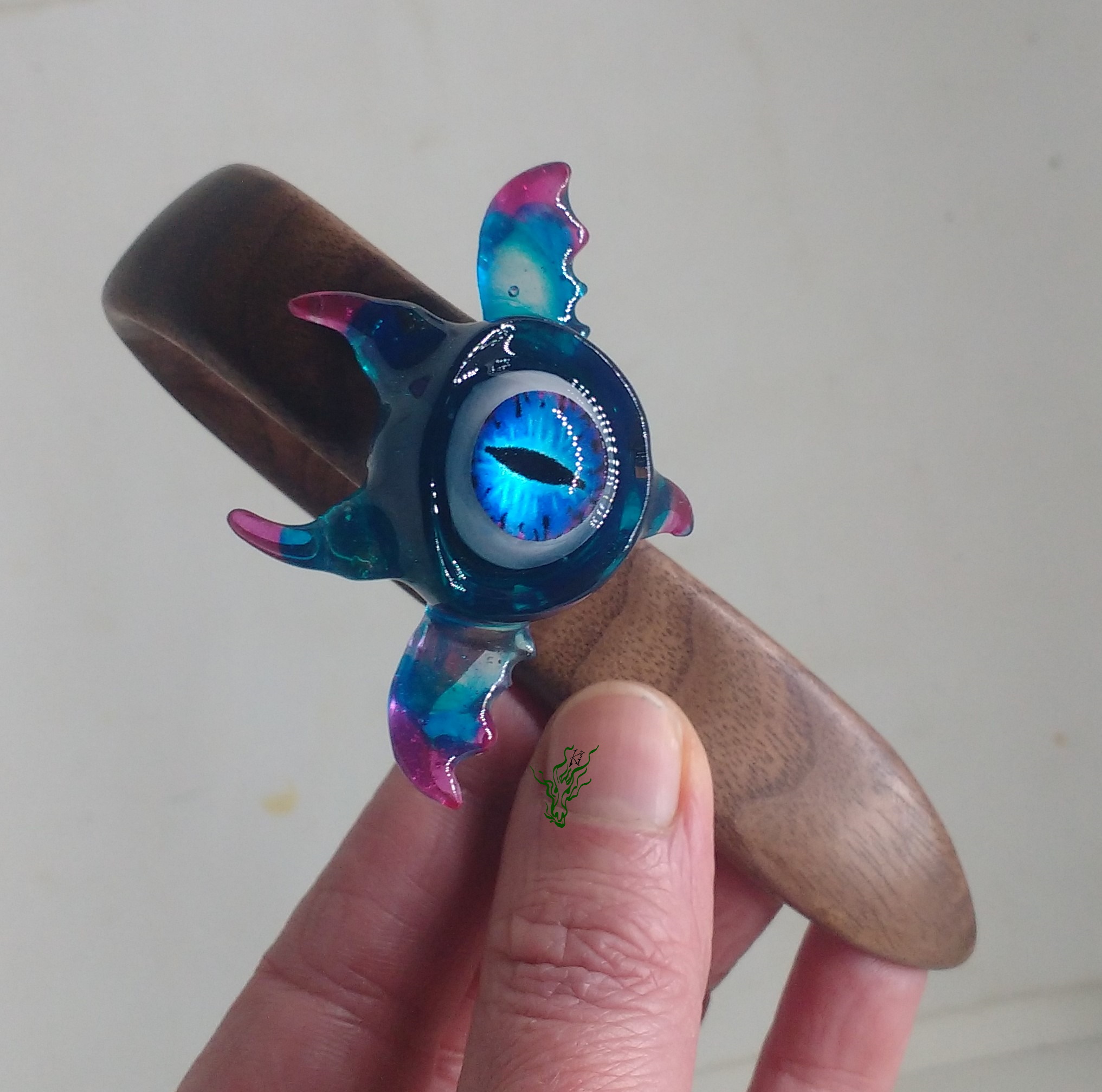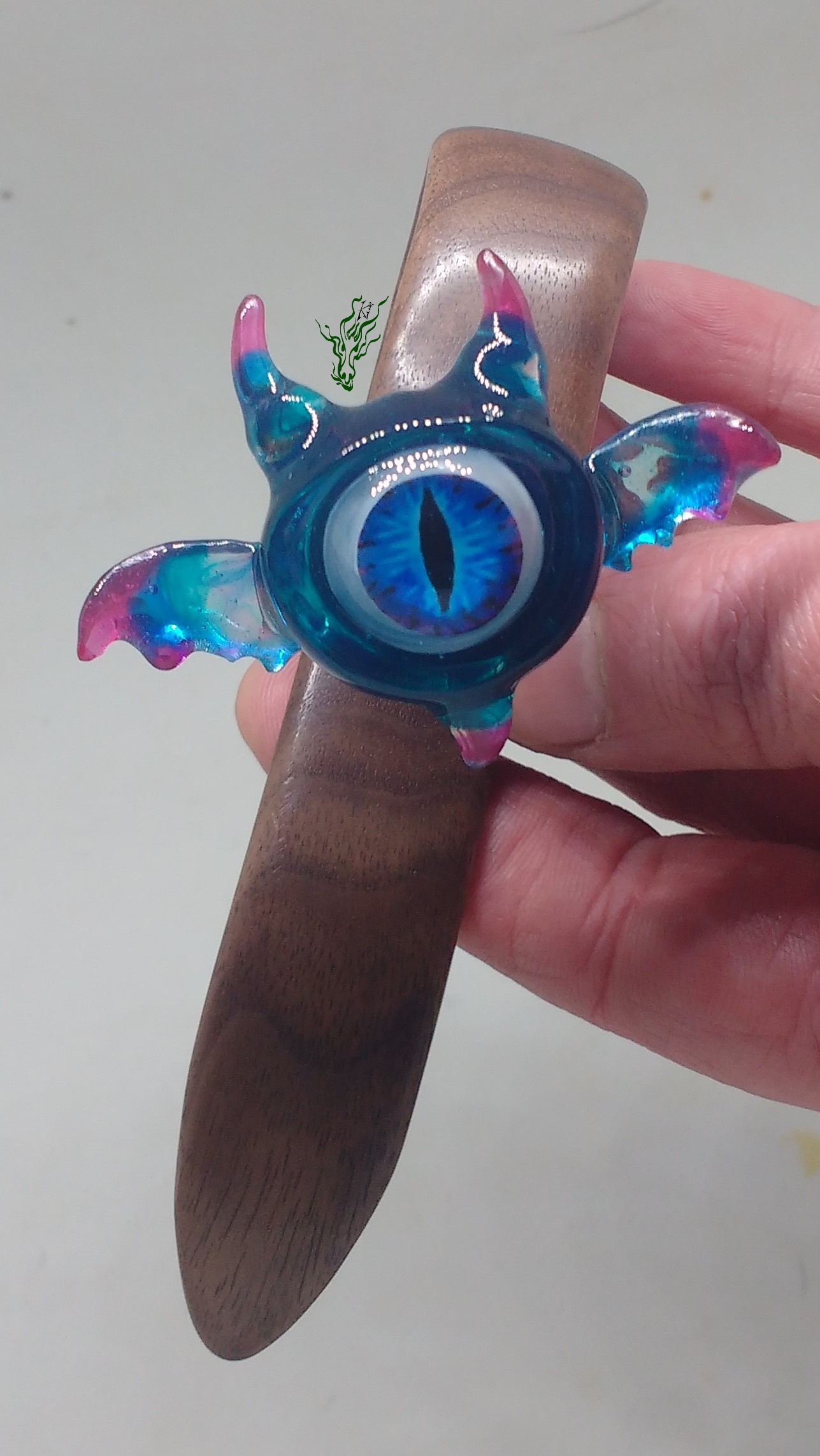 Gehörntes  geflügeltes Auge in RegenbogenFarben (grün-blau-rosa) auf  herrlichem WalnussHolz.  Flacher Haarstab mit  gebogenem evil eye- Topper, der sich dekorativ  über  deinen Dutt  legt. Federleicht und Feenhaar- tauglich.