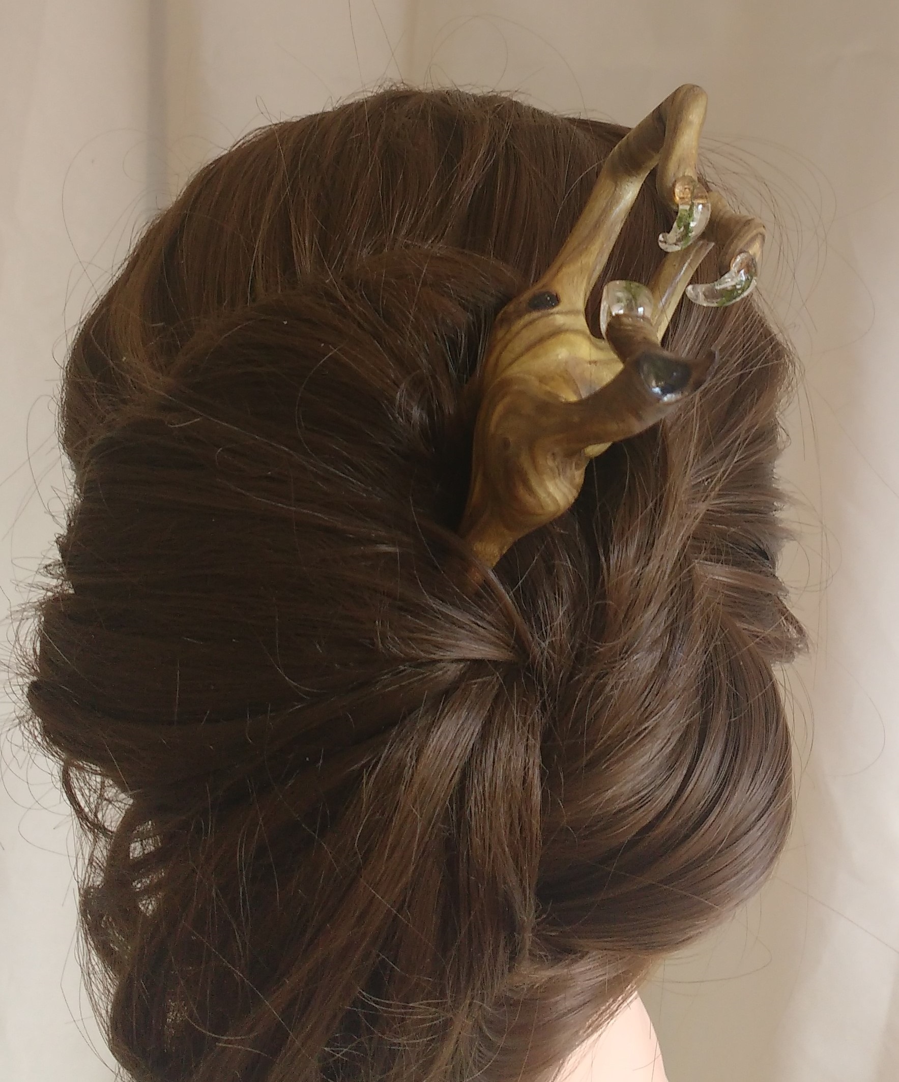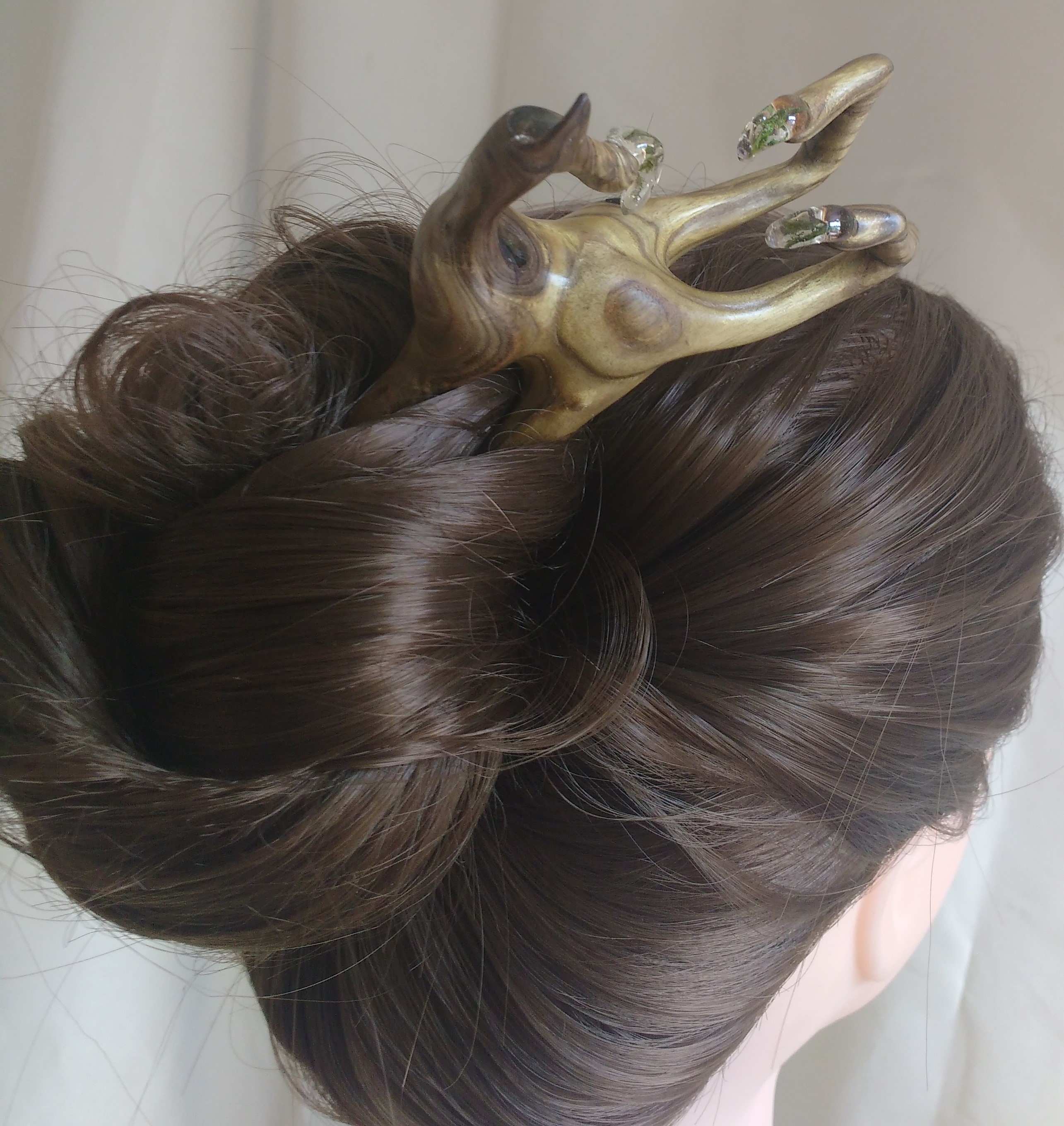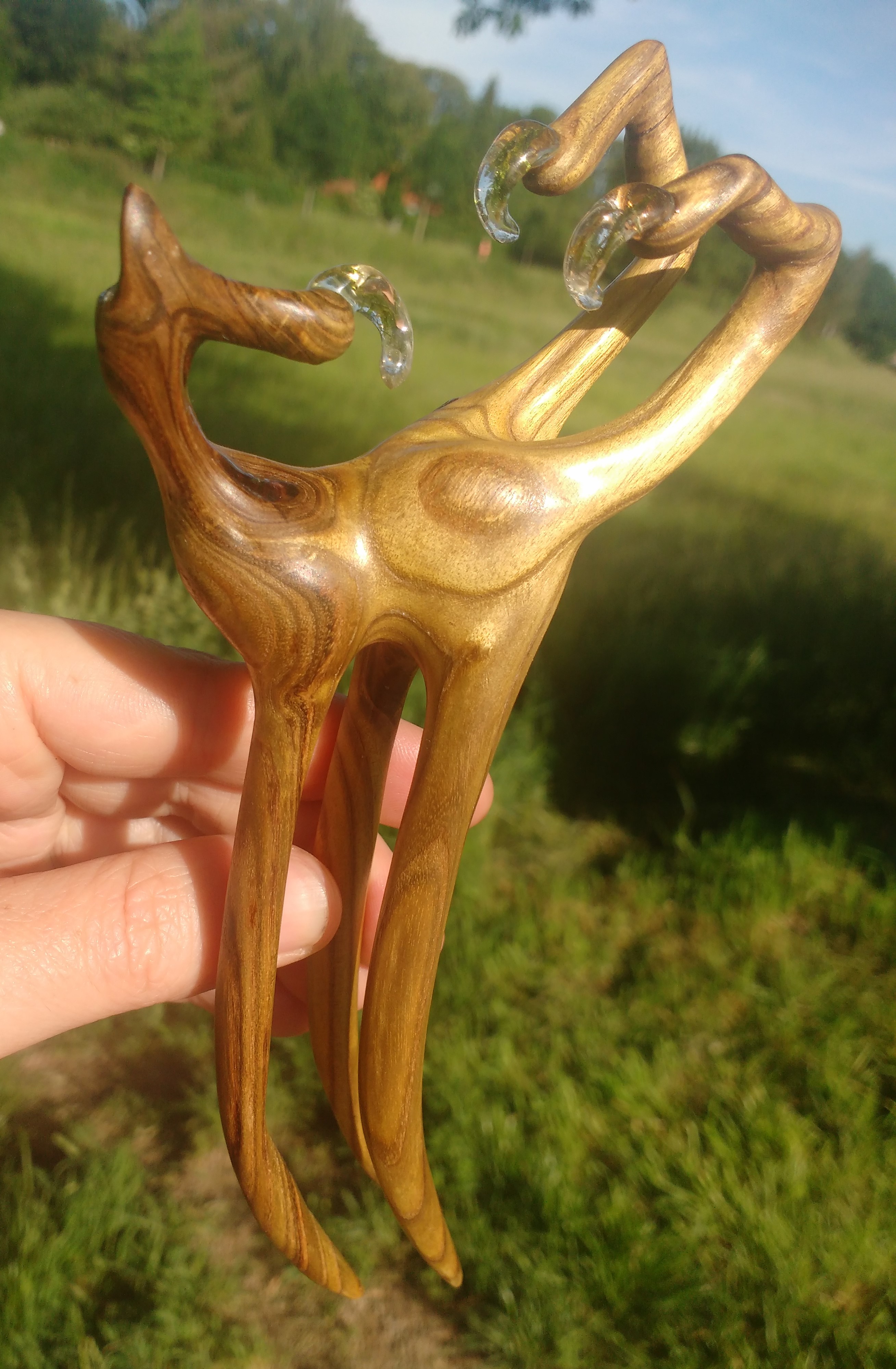 Diese 3D Haarforke ist aus sensationell gemasertem, grünlichen EssigbaumHolz geschnitzt. Eine Holzrarität. Mit Resin stabilisiert, um die Holzmacken herrlich zu betonen. Das Kunstwerk ist geschützt durch meine Wachs- Öl- Mischung.
