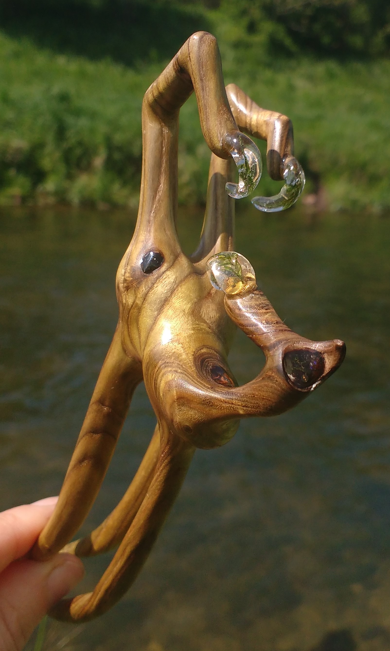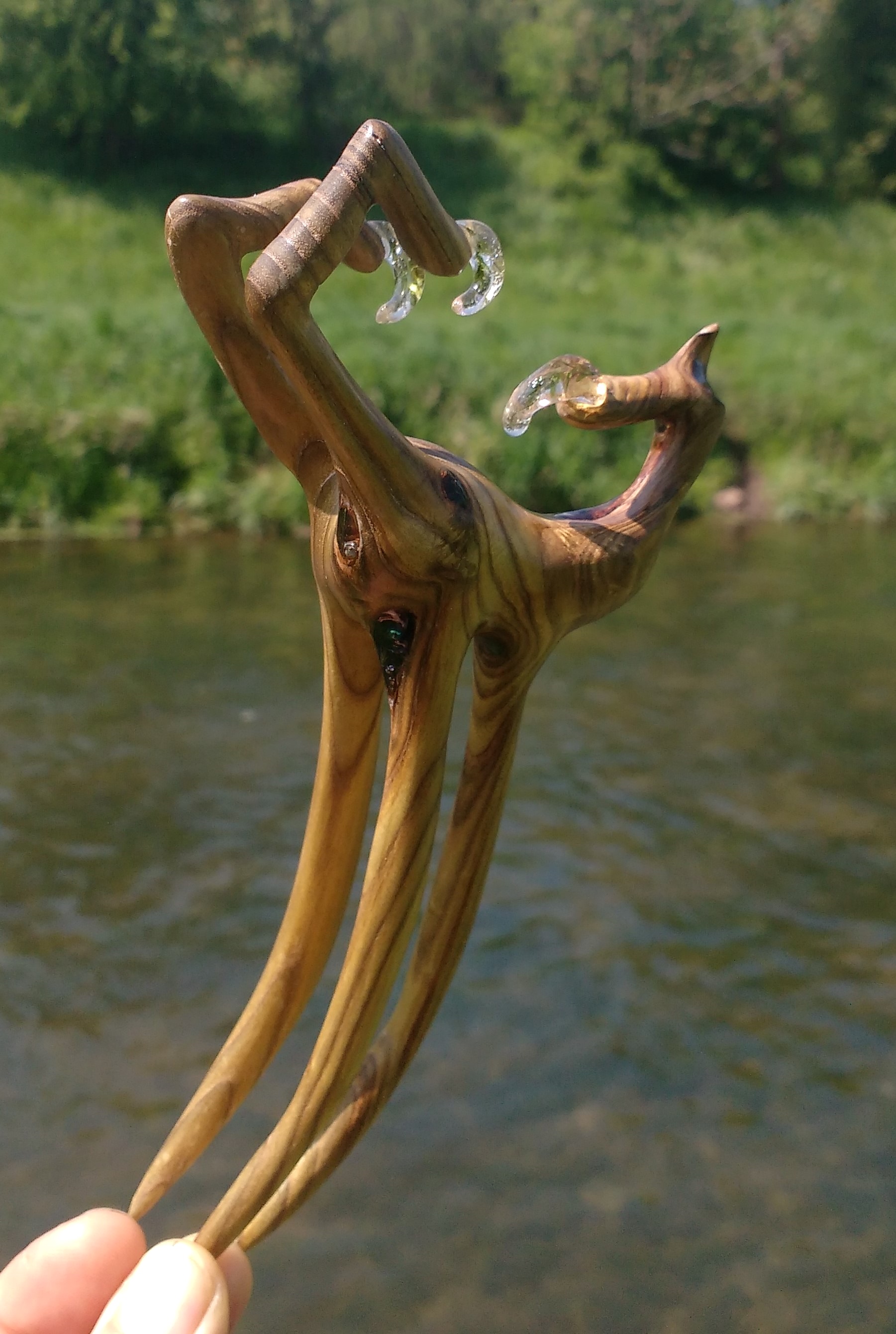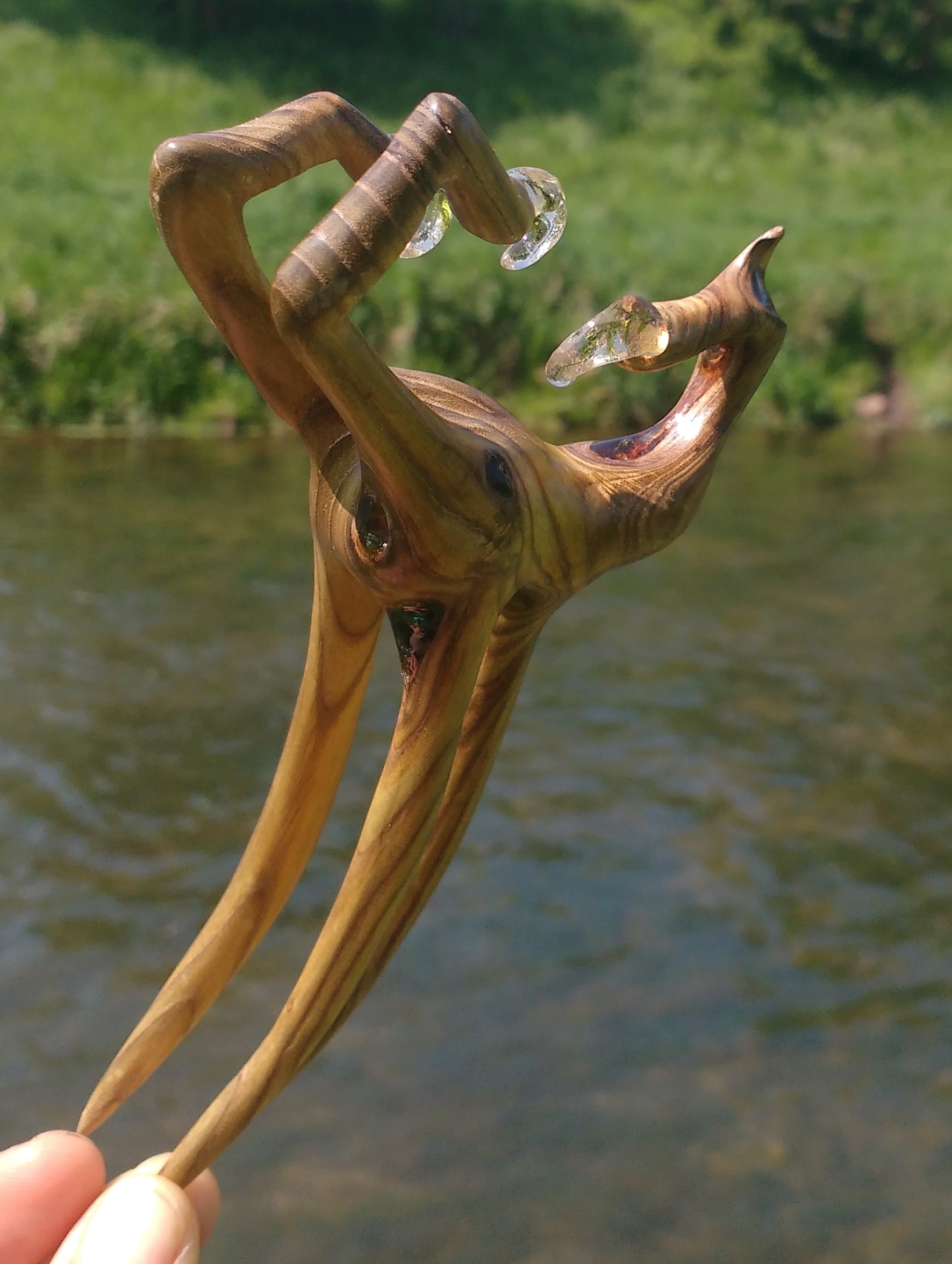 Diese 3D Haarforke ist aus sensationell gemasertem, grünlichen EssigbaumHolz geschnitzt. Eine Holzrarität. Mit Resin stabilisiert, um die Holzmacken herrlich zu betonen. Das Kunstwerk ist geschützt durch meine Wachs- Öl- Mischung.