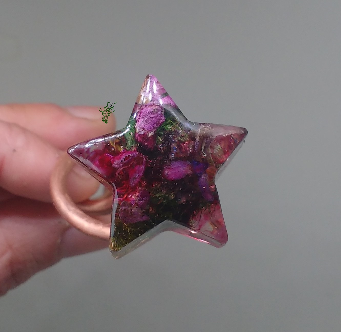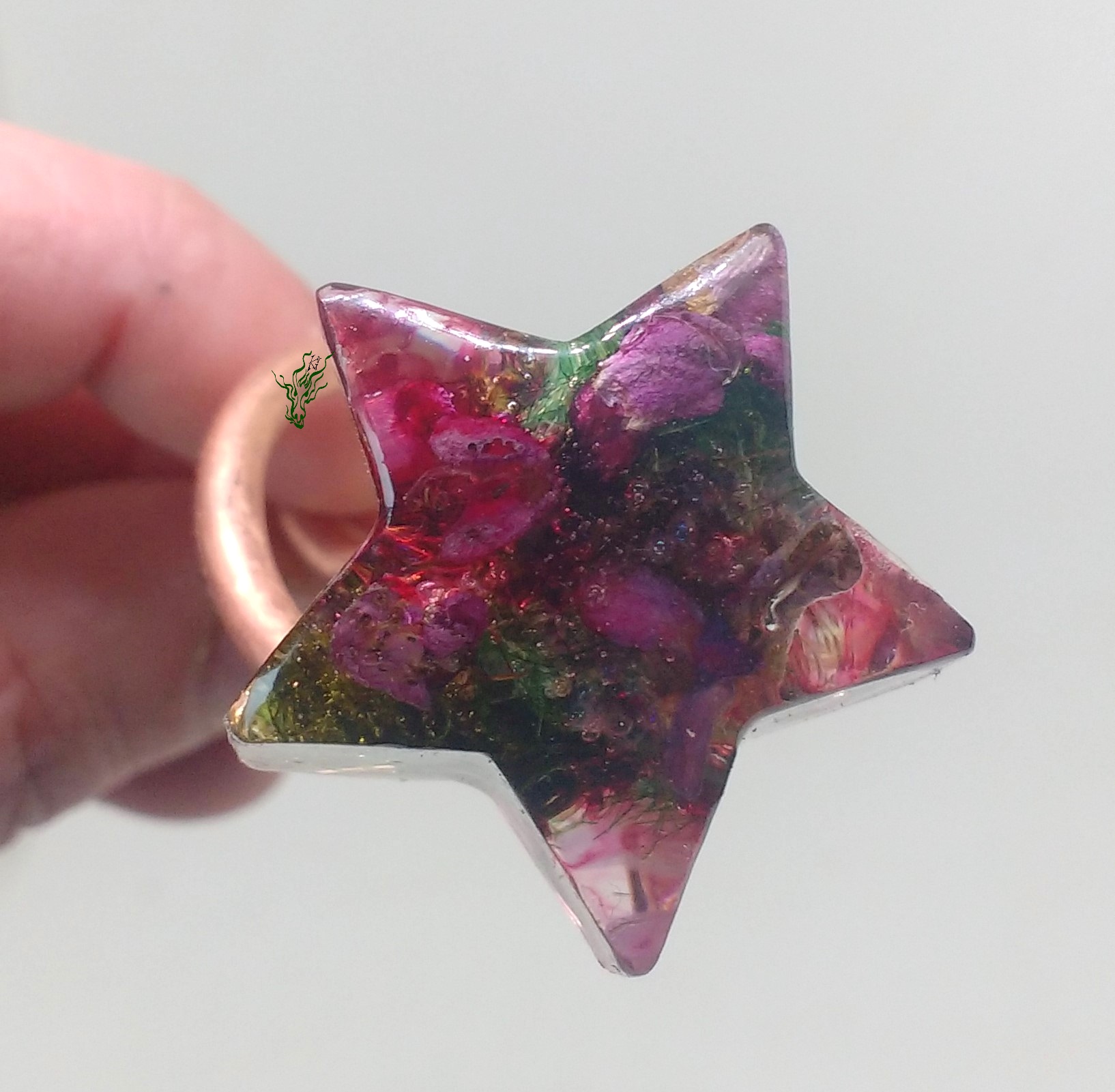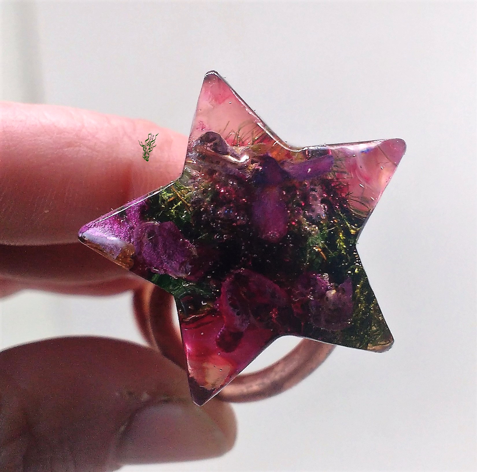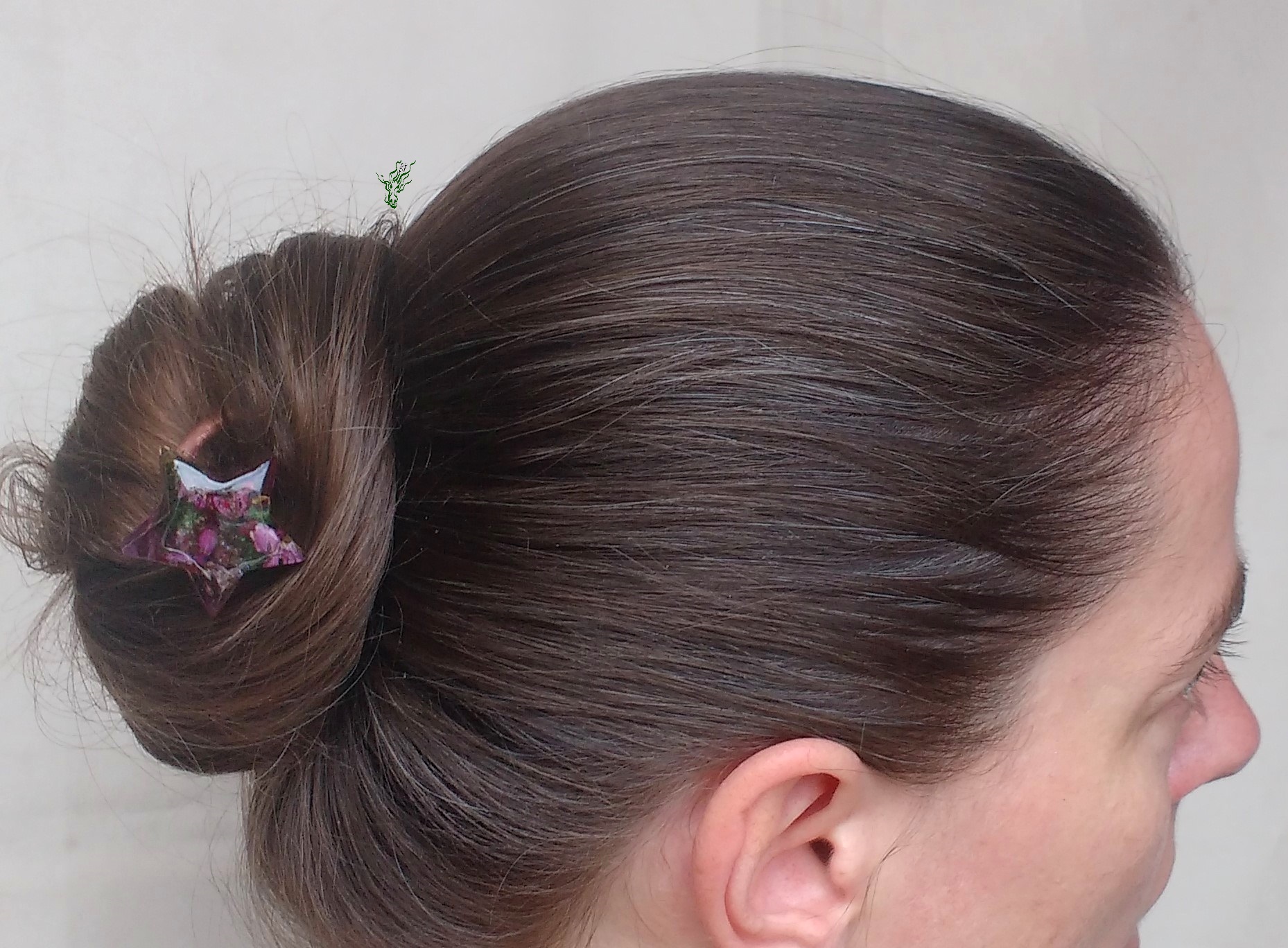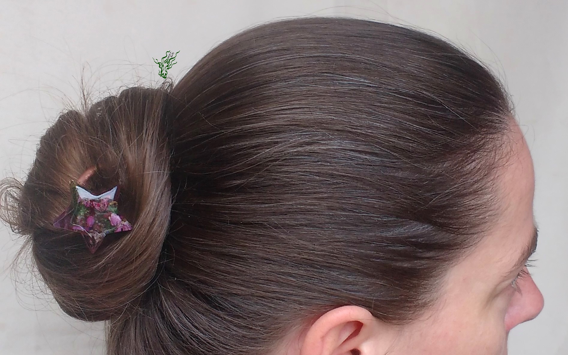 Zarte, pink farbene Blüten. Eingebettet auf Moos in eine Kuppel aus kühlem, zarten Rot. Mit lila- irisierenden Wolken und Blässchen. Die Haarforke ist so konzipiert, dass sich der Stern an deinen Dutt anfügt & perfekt ausbalanciert ist.