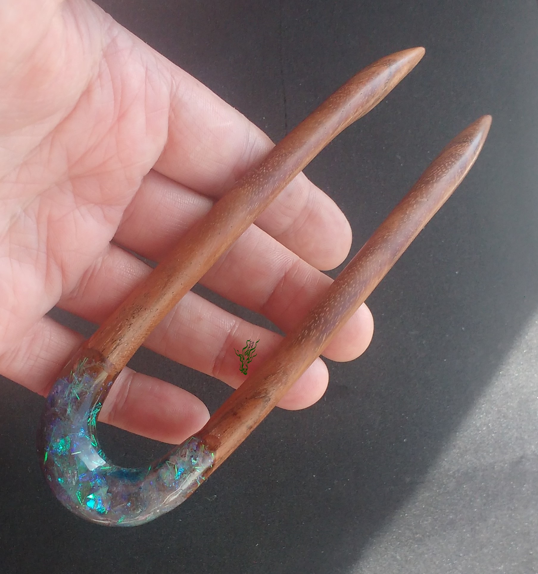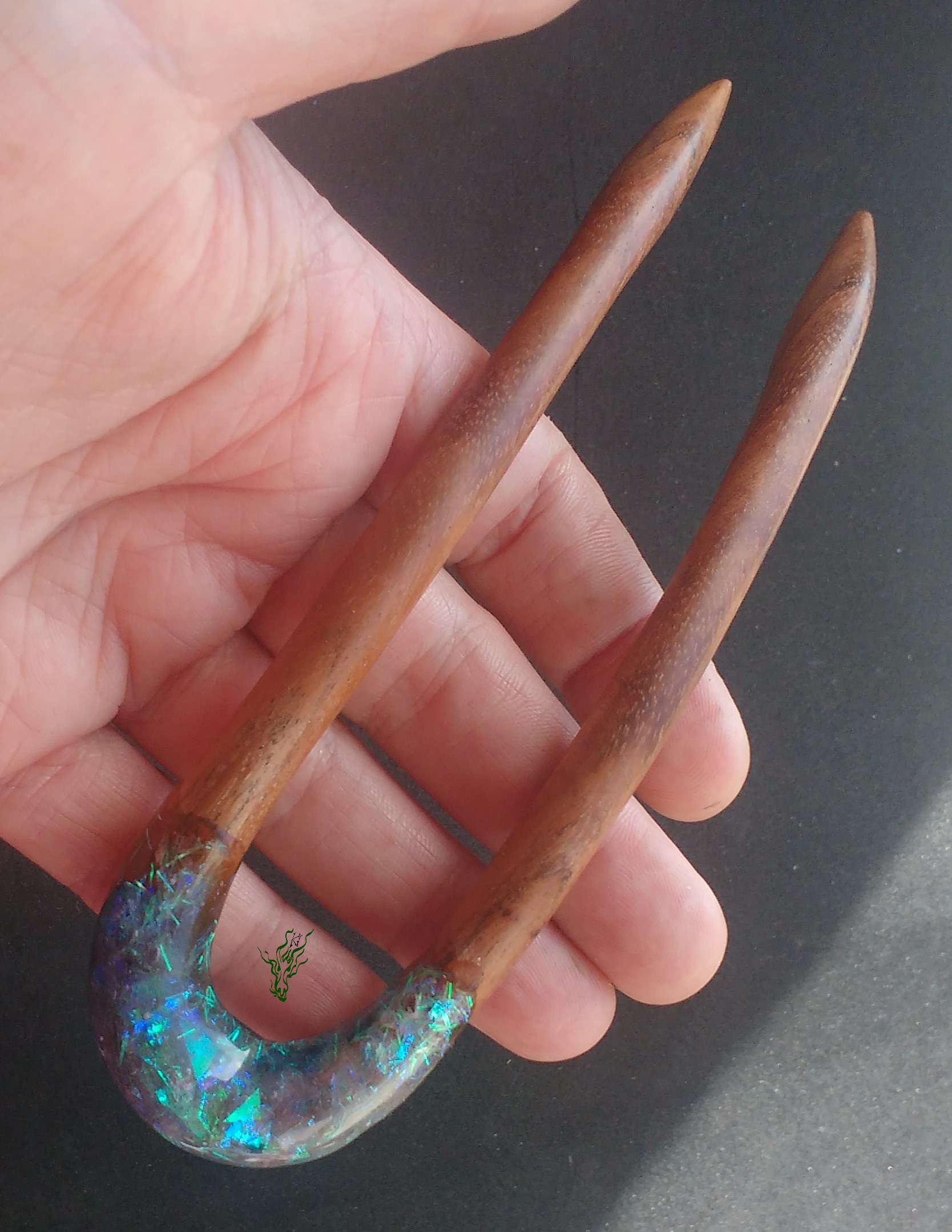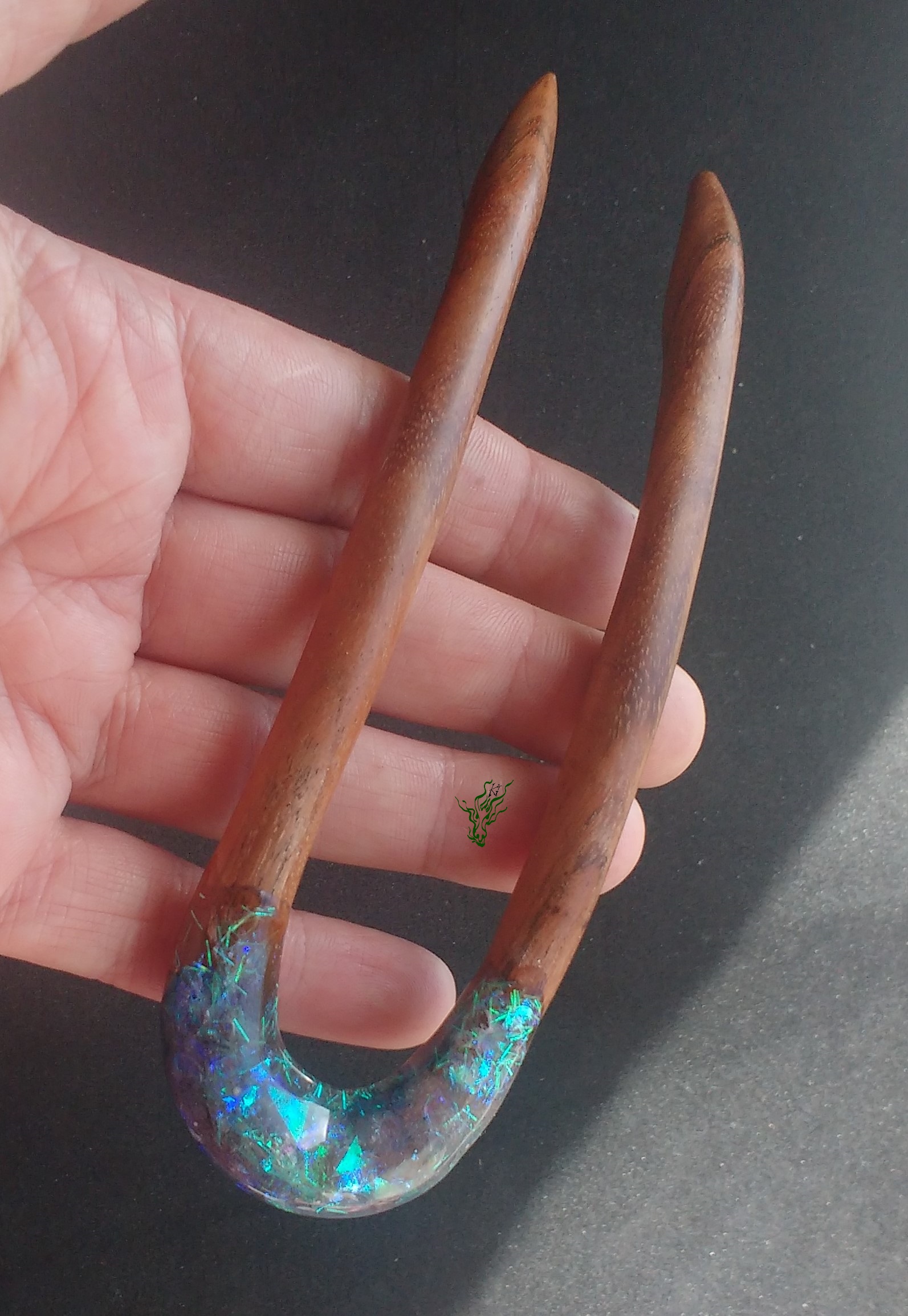 Und das Ganze auf Edelholz, wieder ein Upcycling.  Die Muster im dunkelbraunen Holz sind wunderschön.
