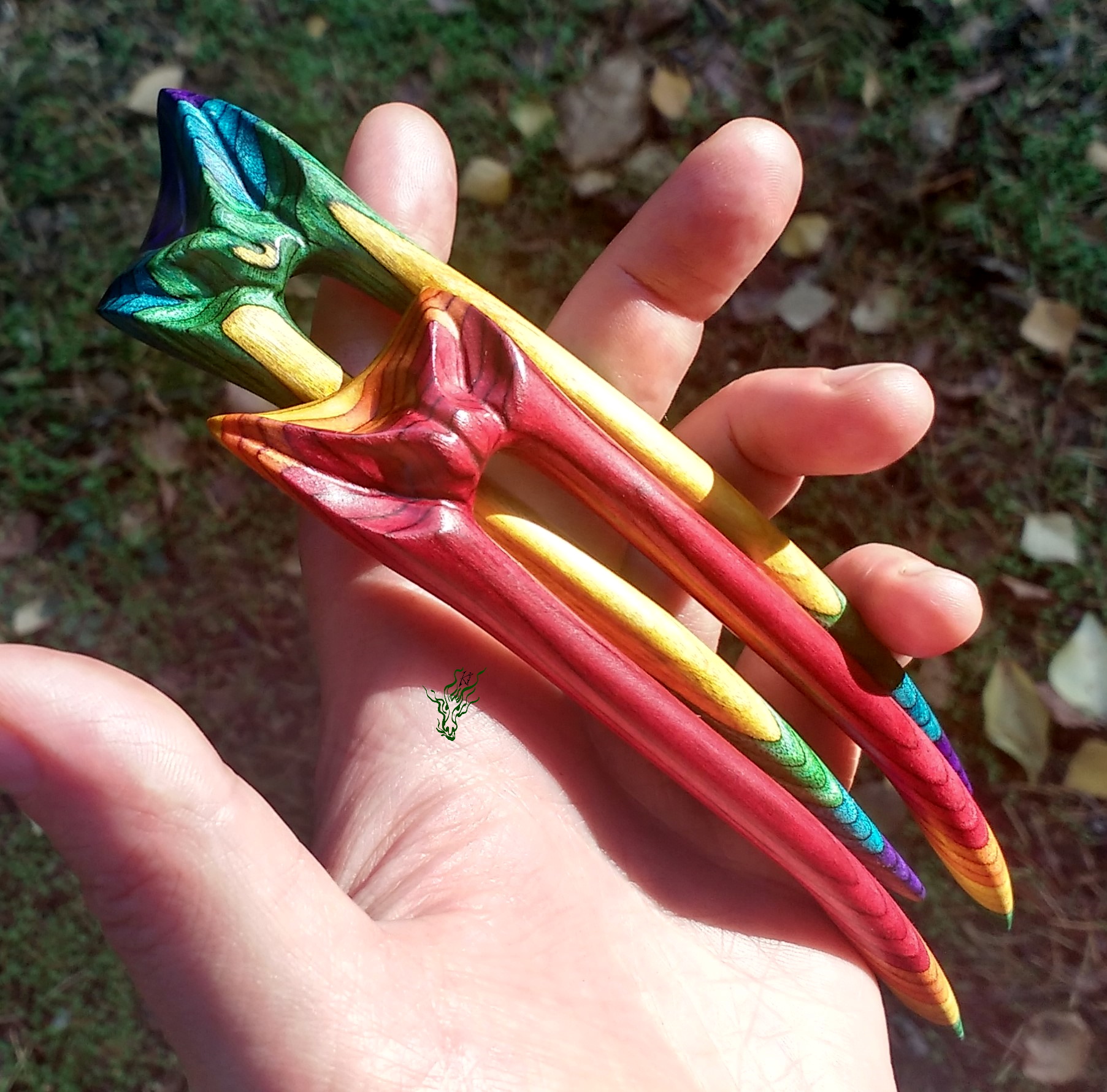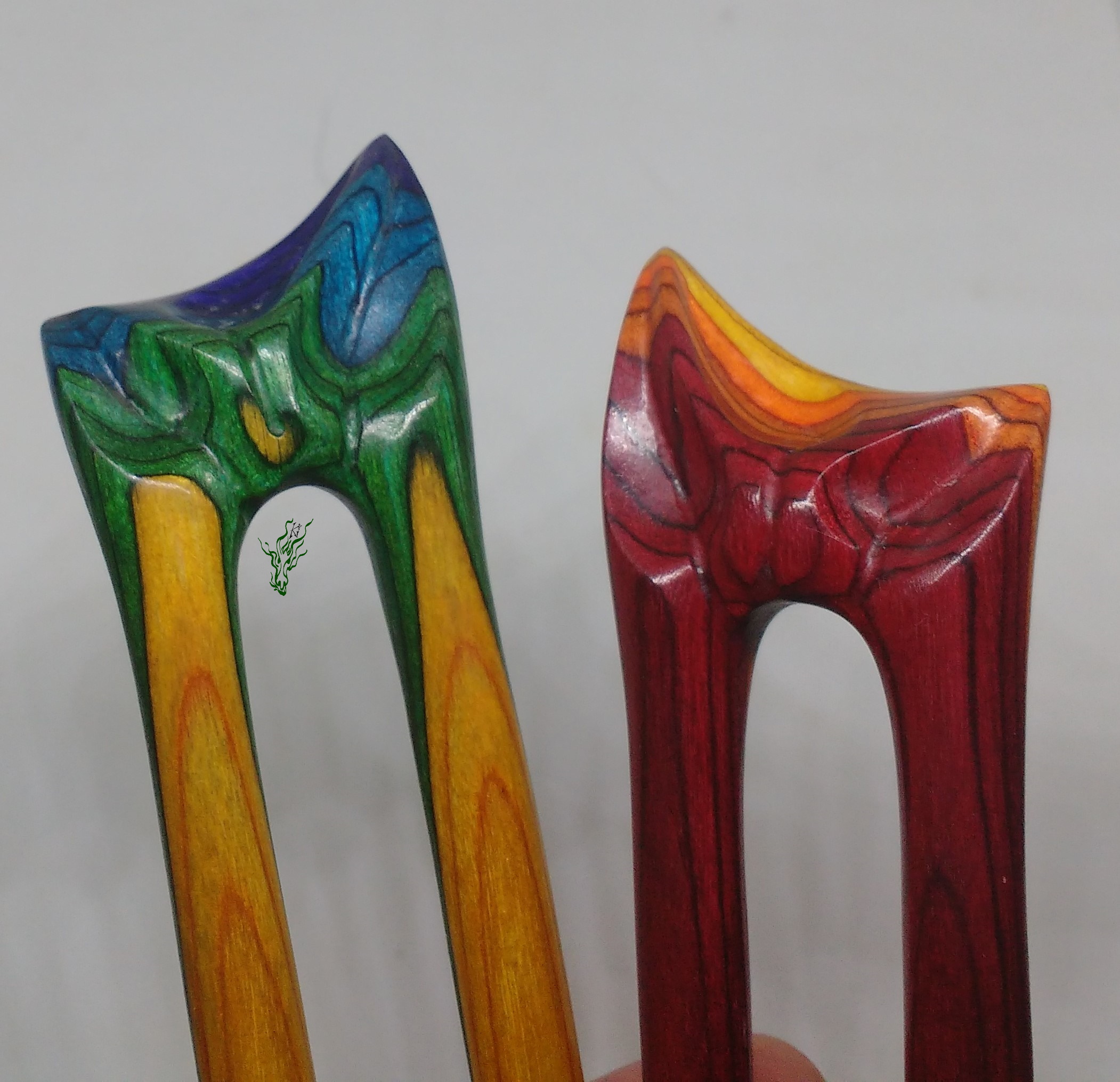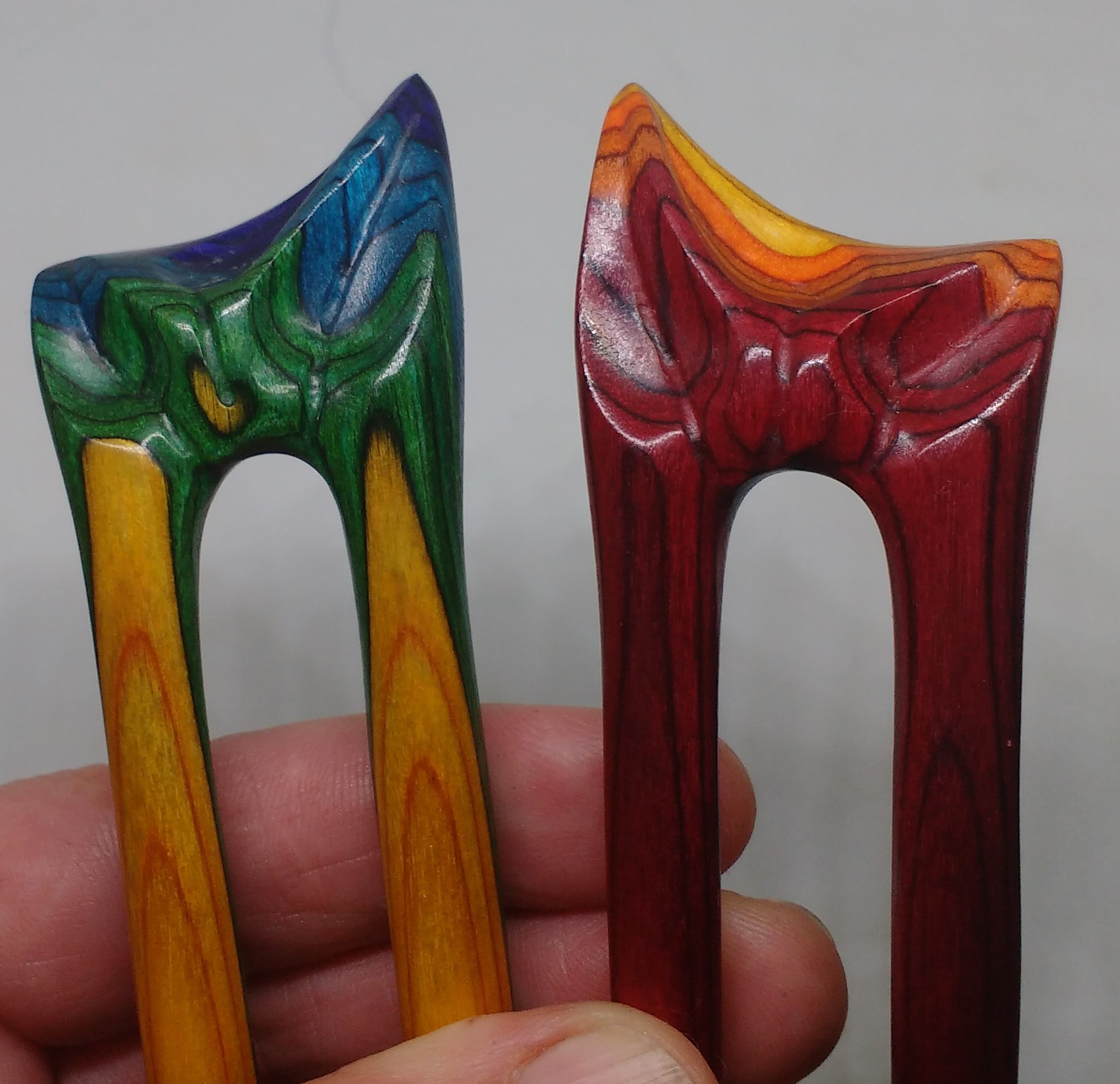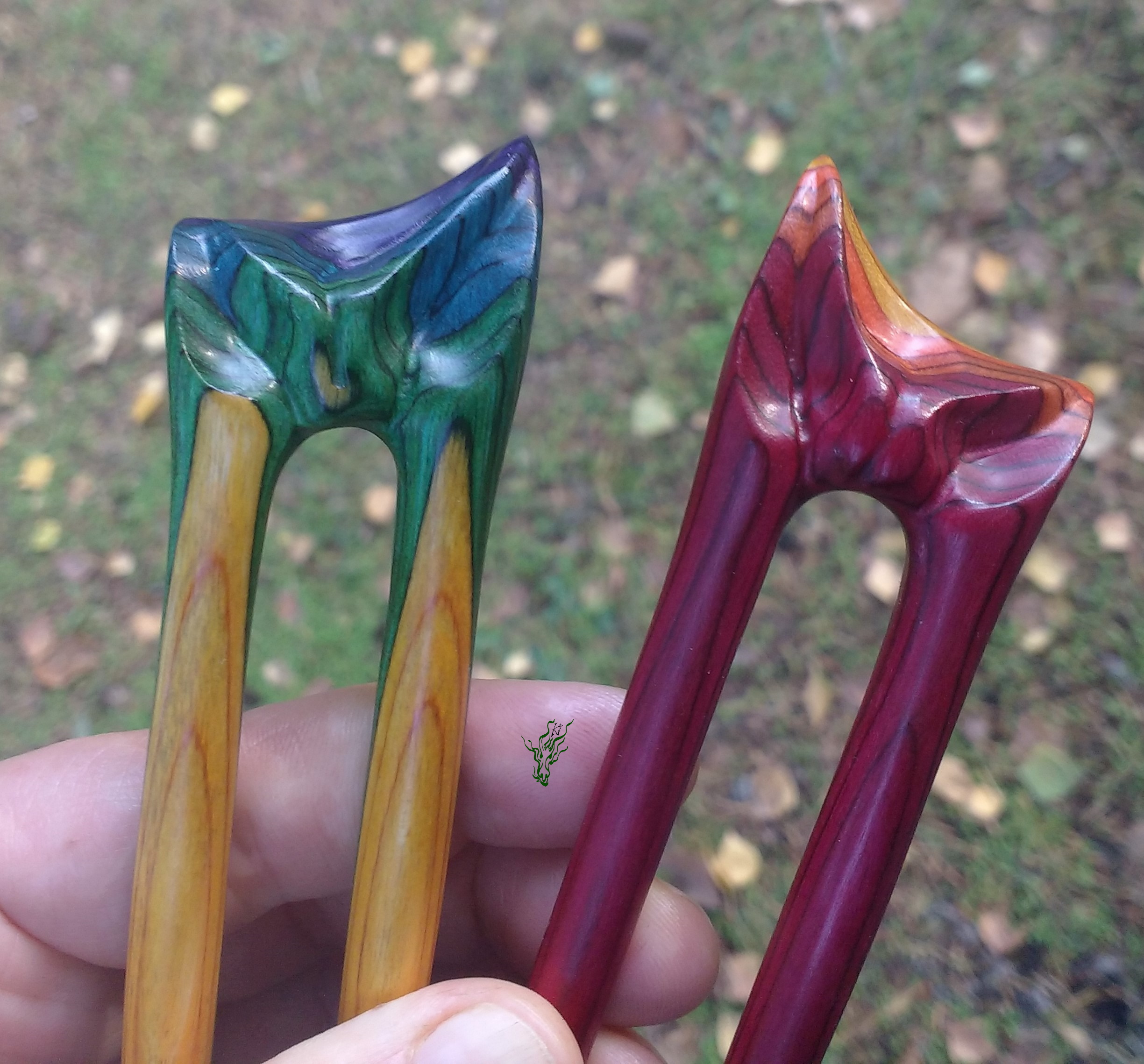 Zusammen ein Regenbogen. 2 zusammen passende Haarforken mit Blattschnitzerei. *Bunte Blätter feurig* zeigt im Topper Rot, Gelb & Orange & *Bunte Blätter kühl* schimmert in Grün, Blau & Lila mit Gelb. Am Schönsten zusammen, aber auch einzeln adoptierbar.
