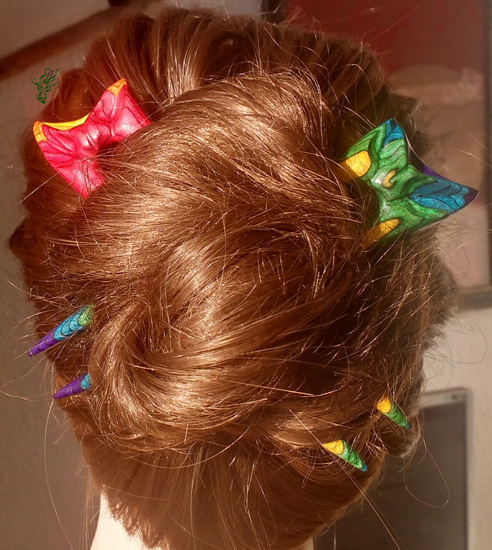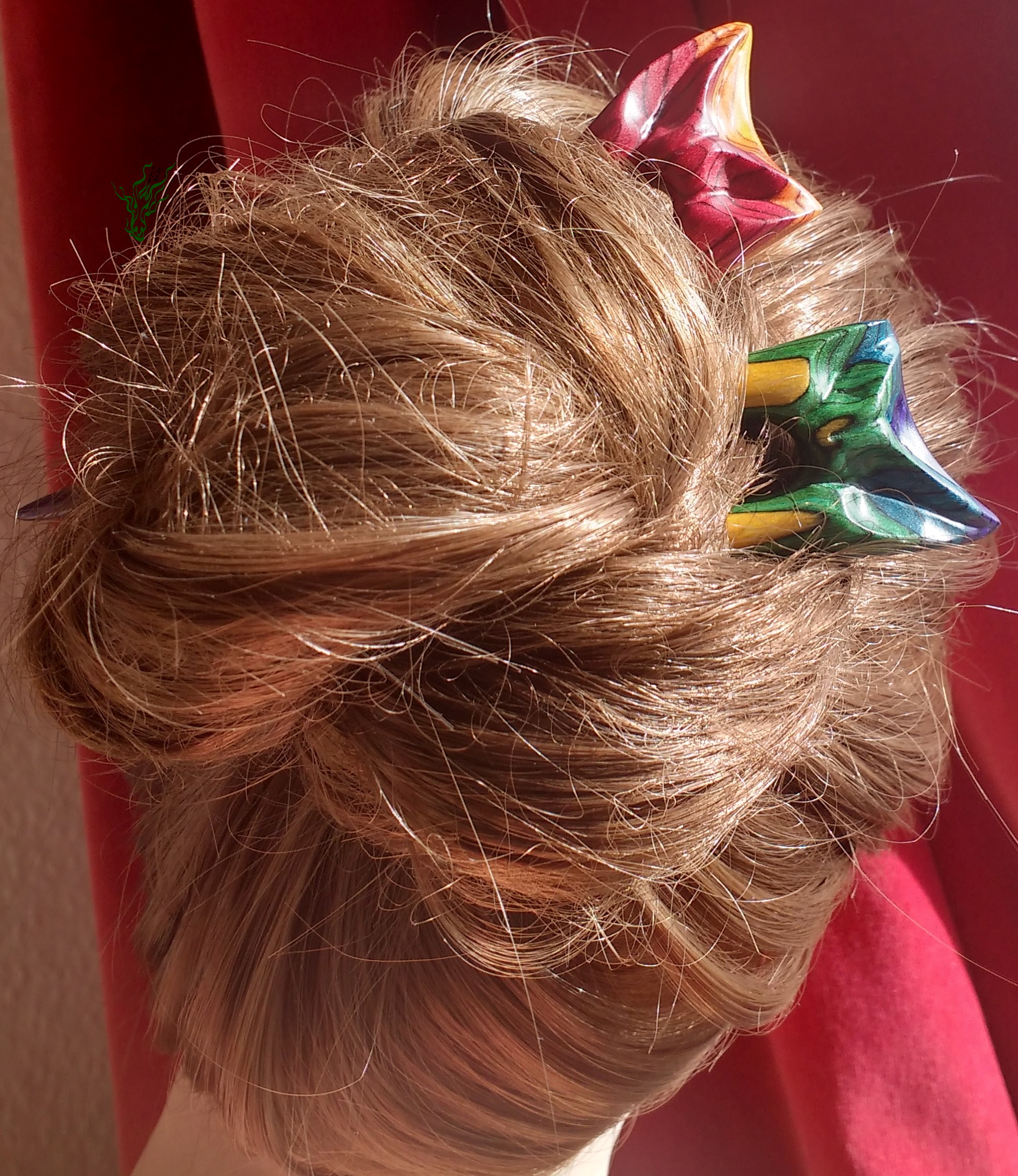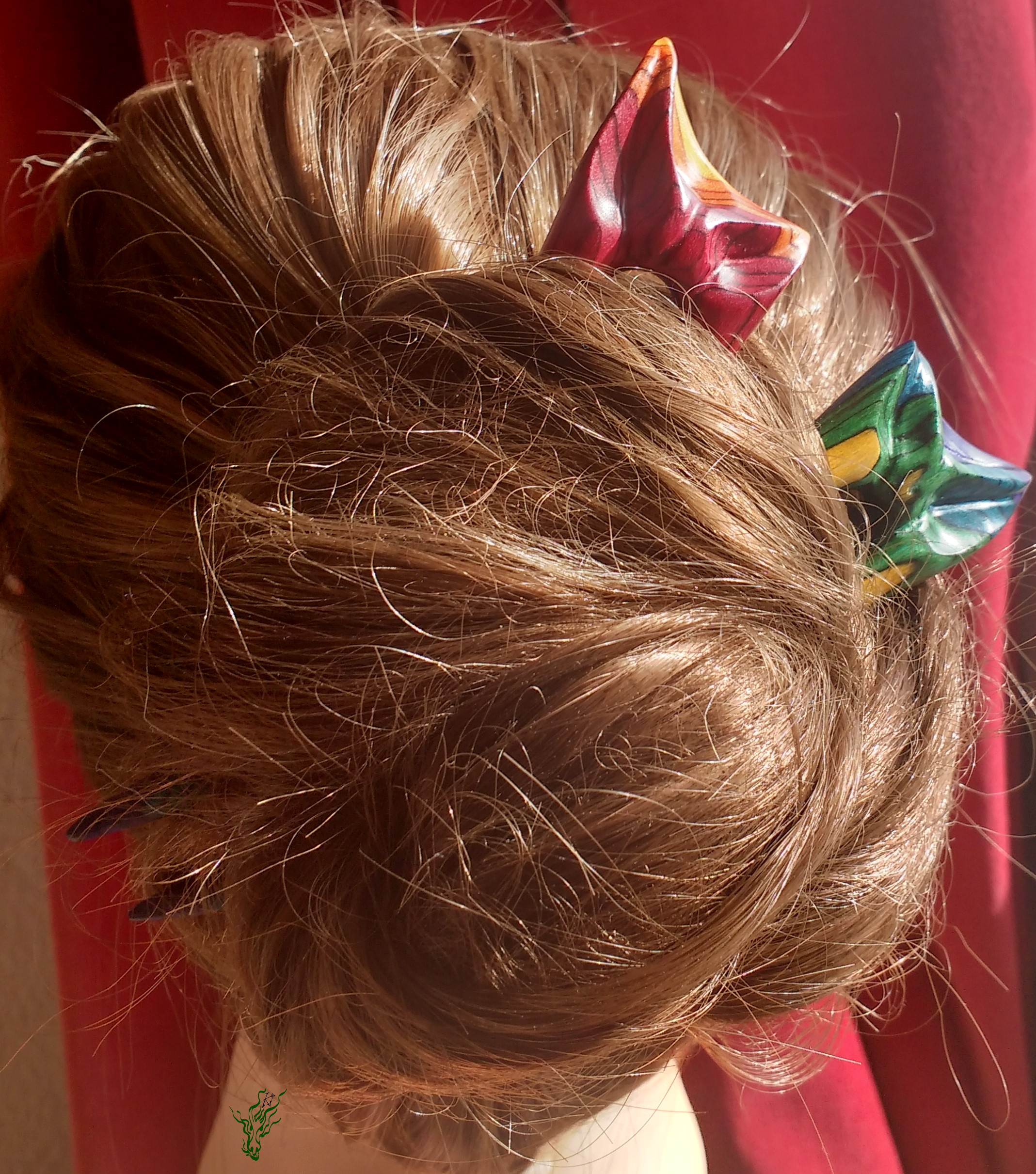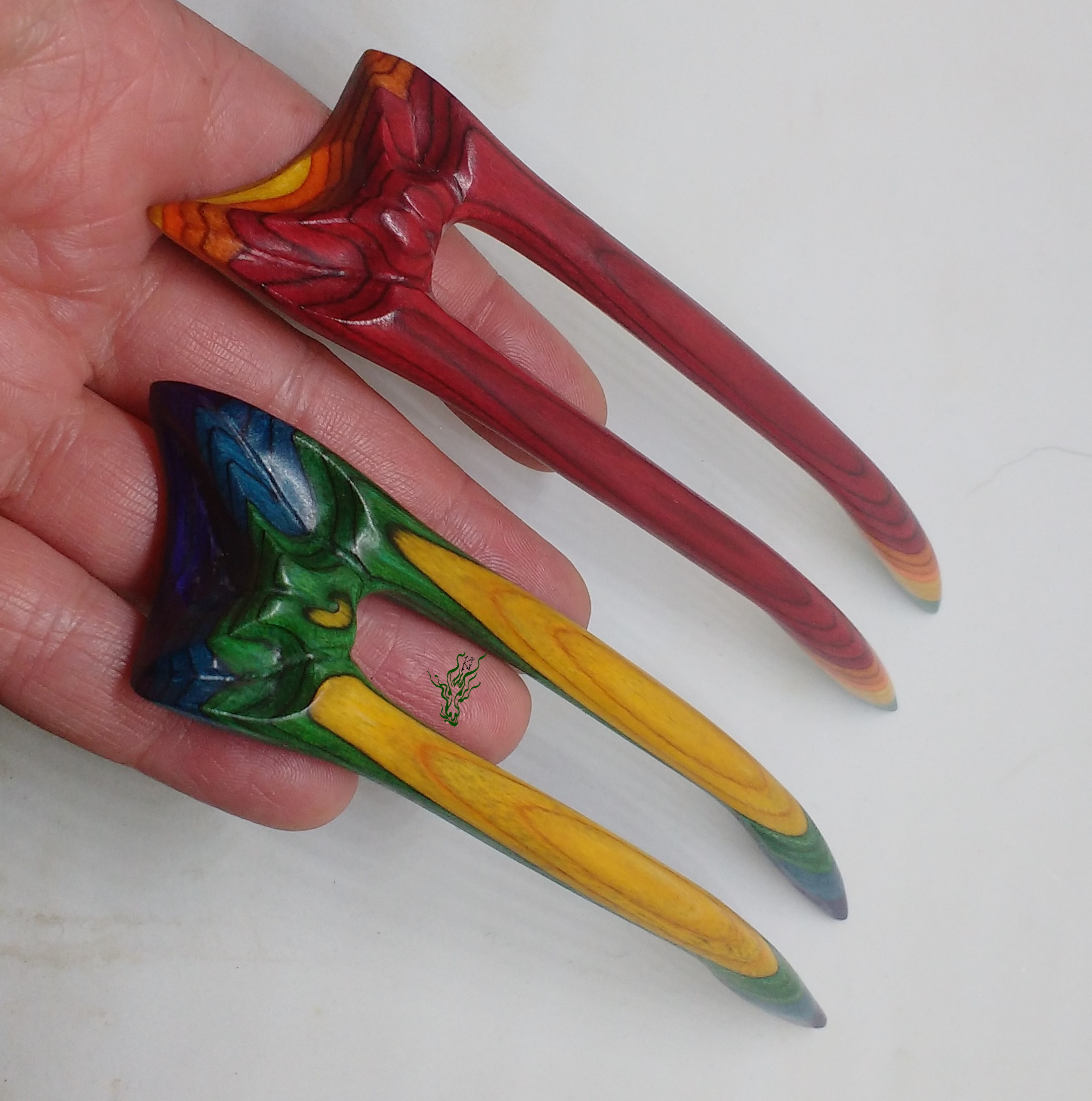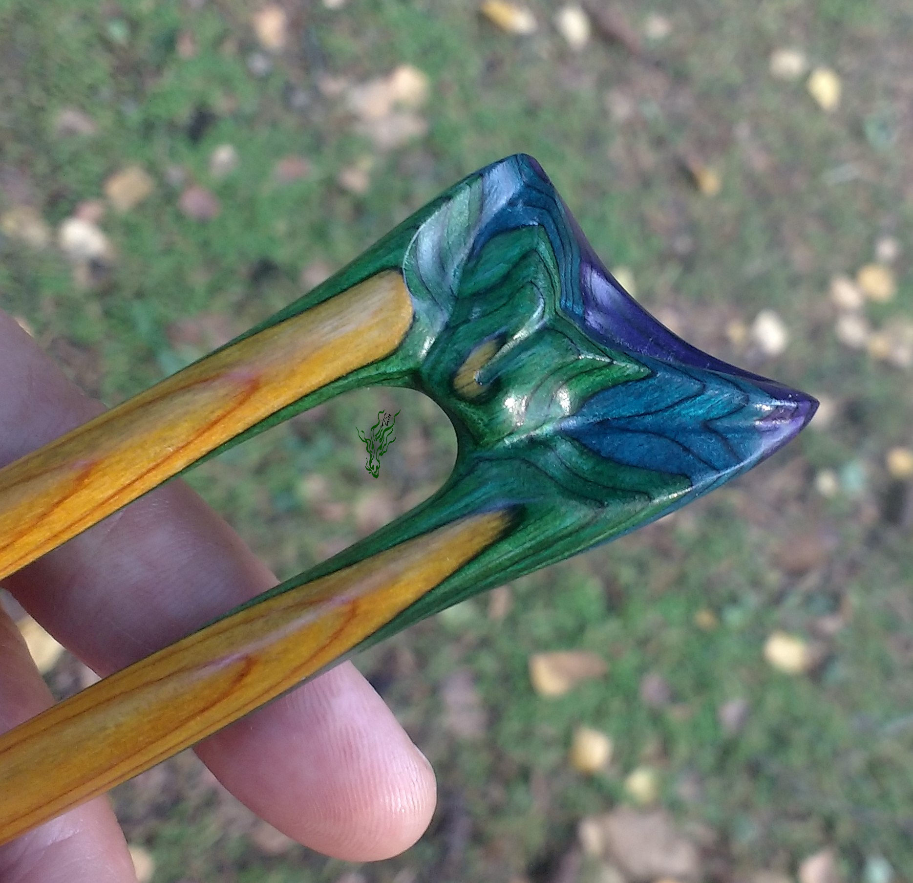 Zusammen ein Regenbogen. 2 zusammen passende Haarforken mit Blattschnitzerei. *Bunte Blätter feurig* zeigt im Topper Rot, Gelb & Orange & *Bunte Blätter kühl* schimmert in Grün, Blau & Lila mit Gelb. Am Schönsten zusammen, aber auch einzeln adoptierbar.