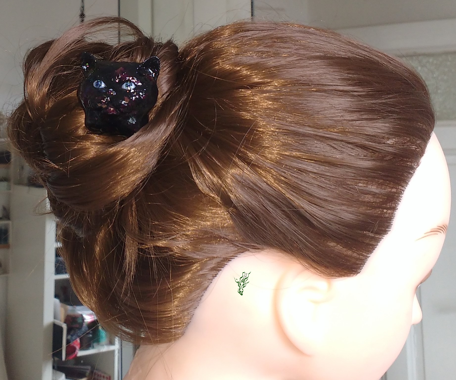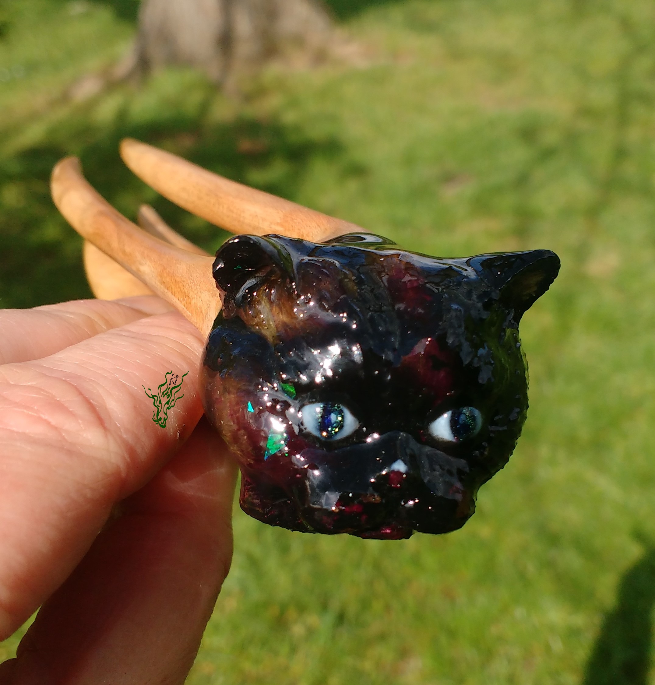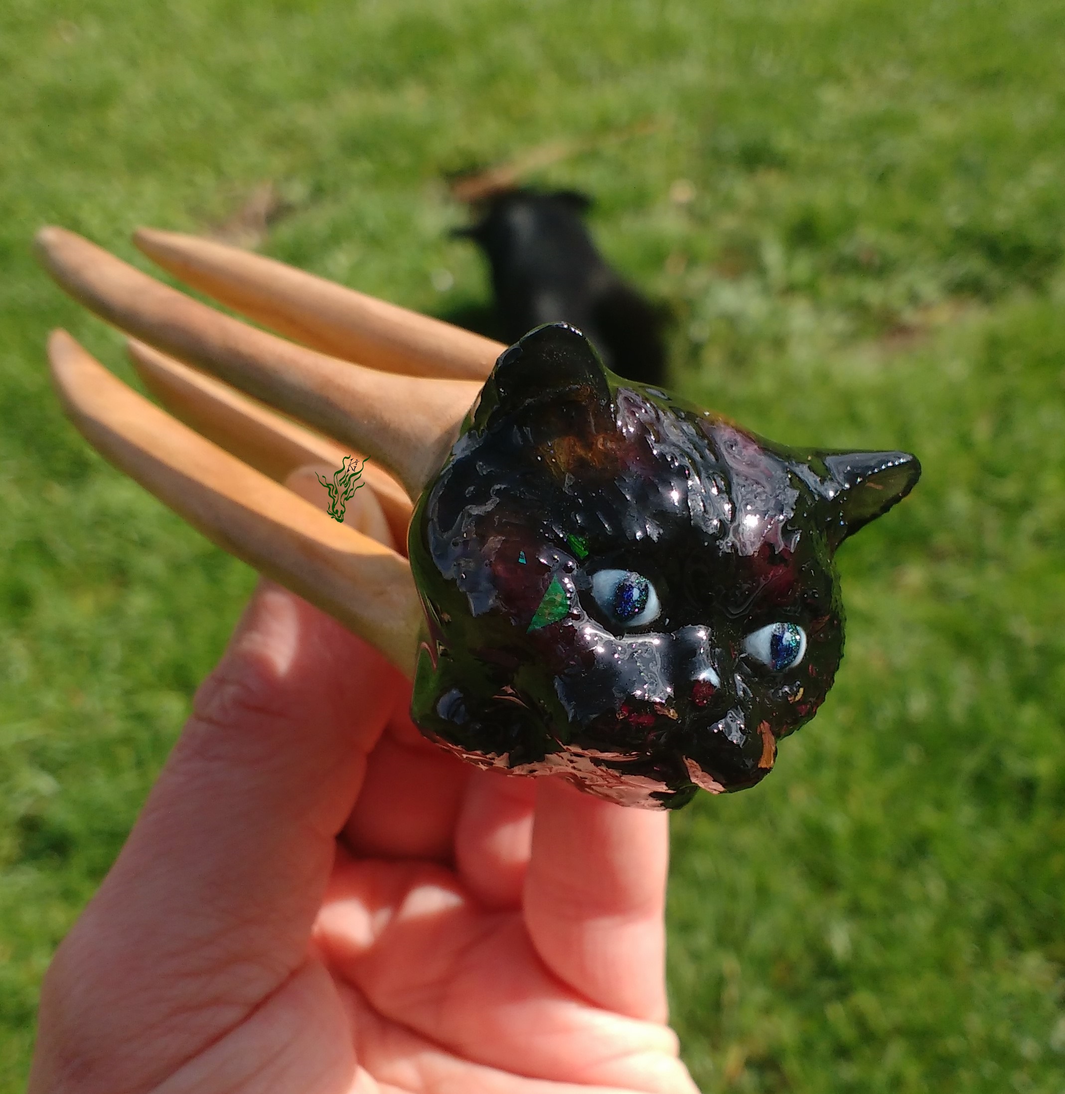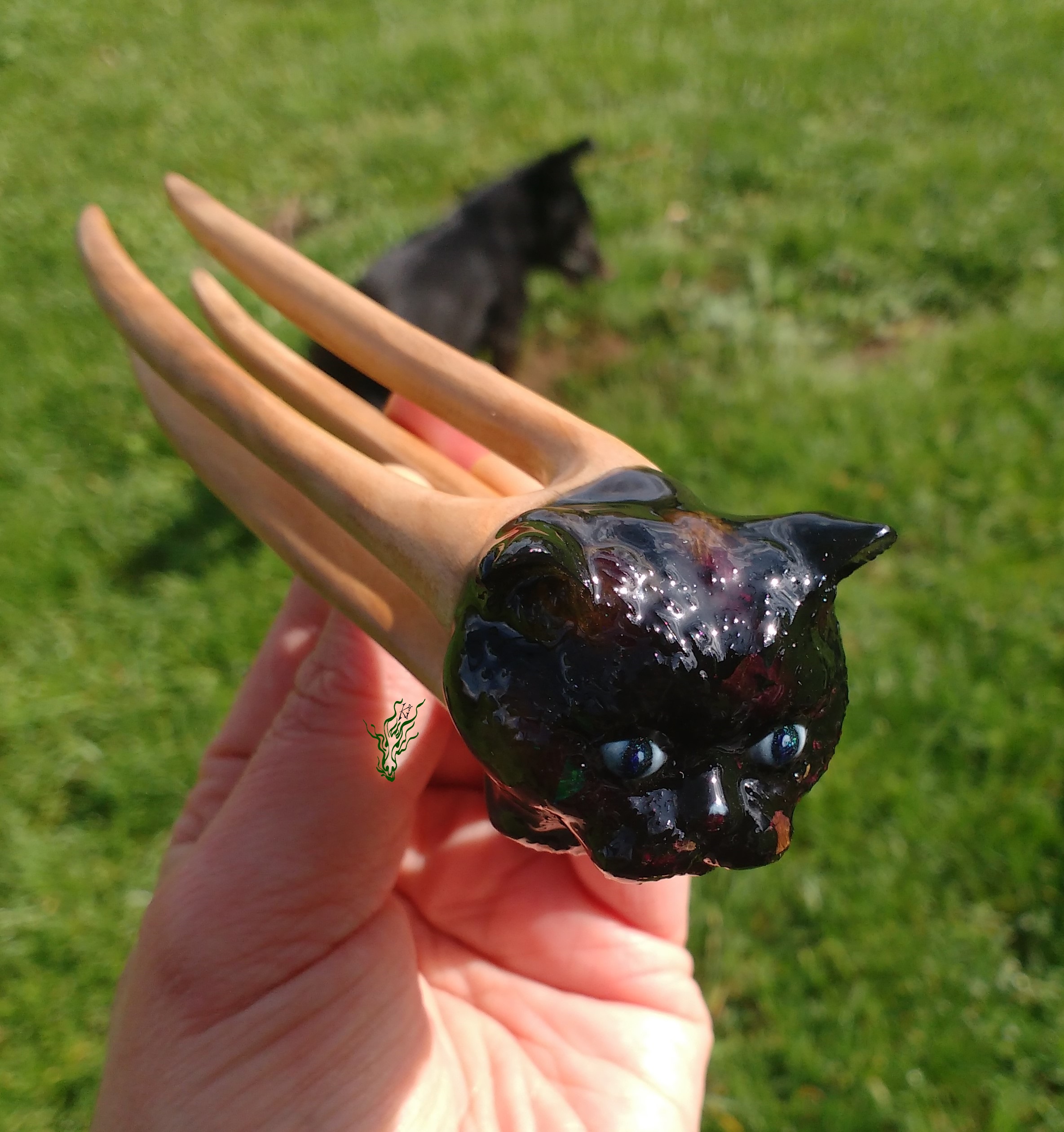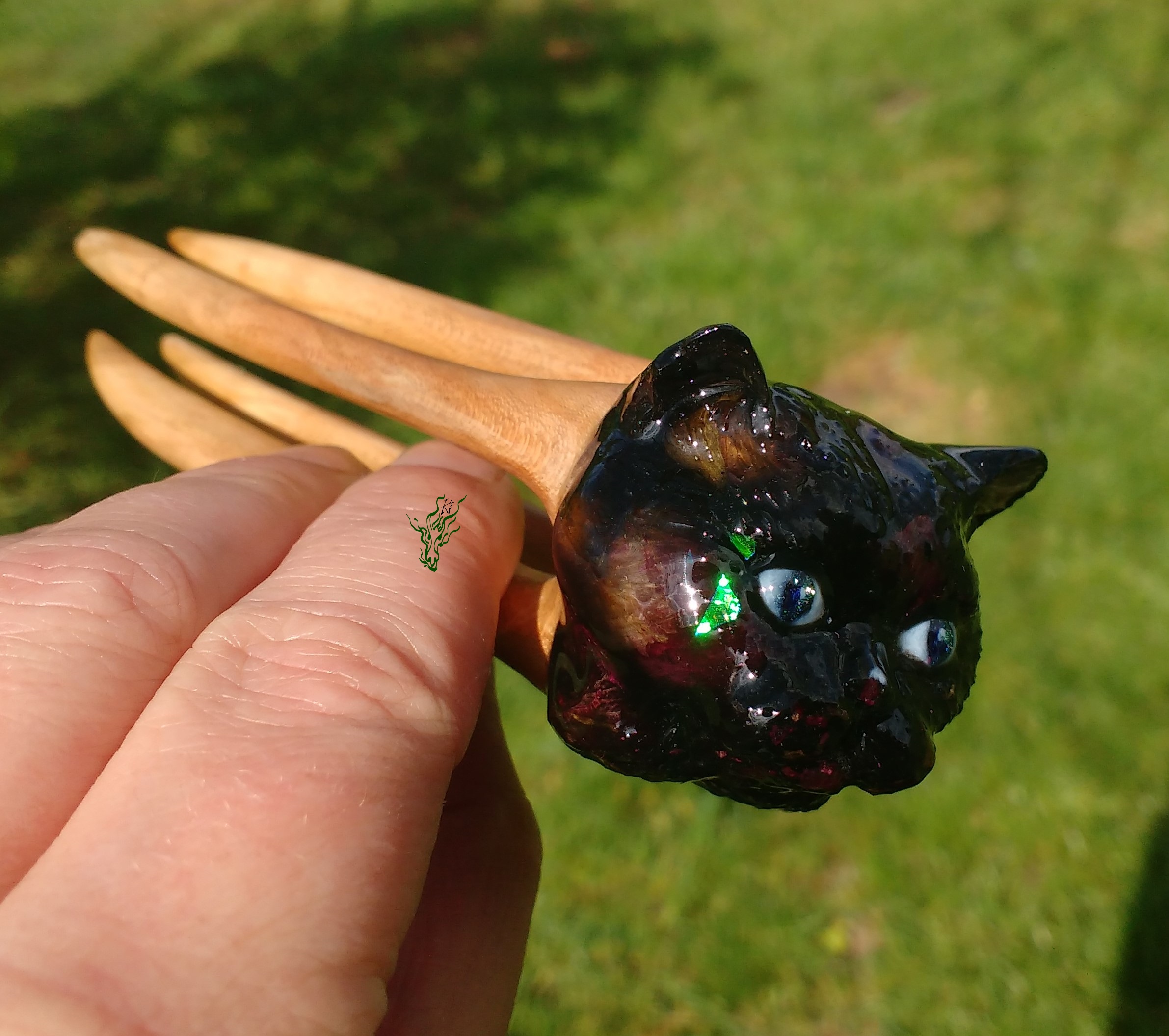 Detailgetreu geschnitzter Katzenkopf – nicht massiv. Schwarzes Resin mit Rosenknospen auf Kirschholz.