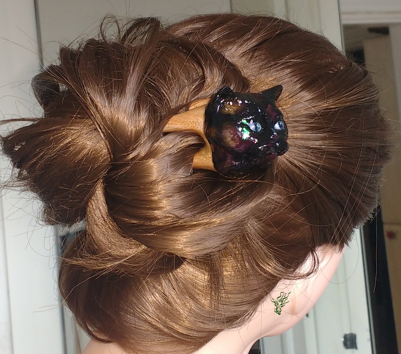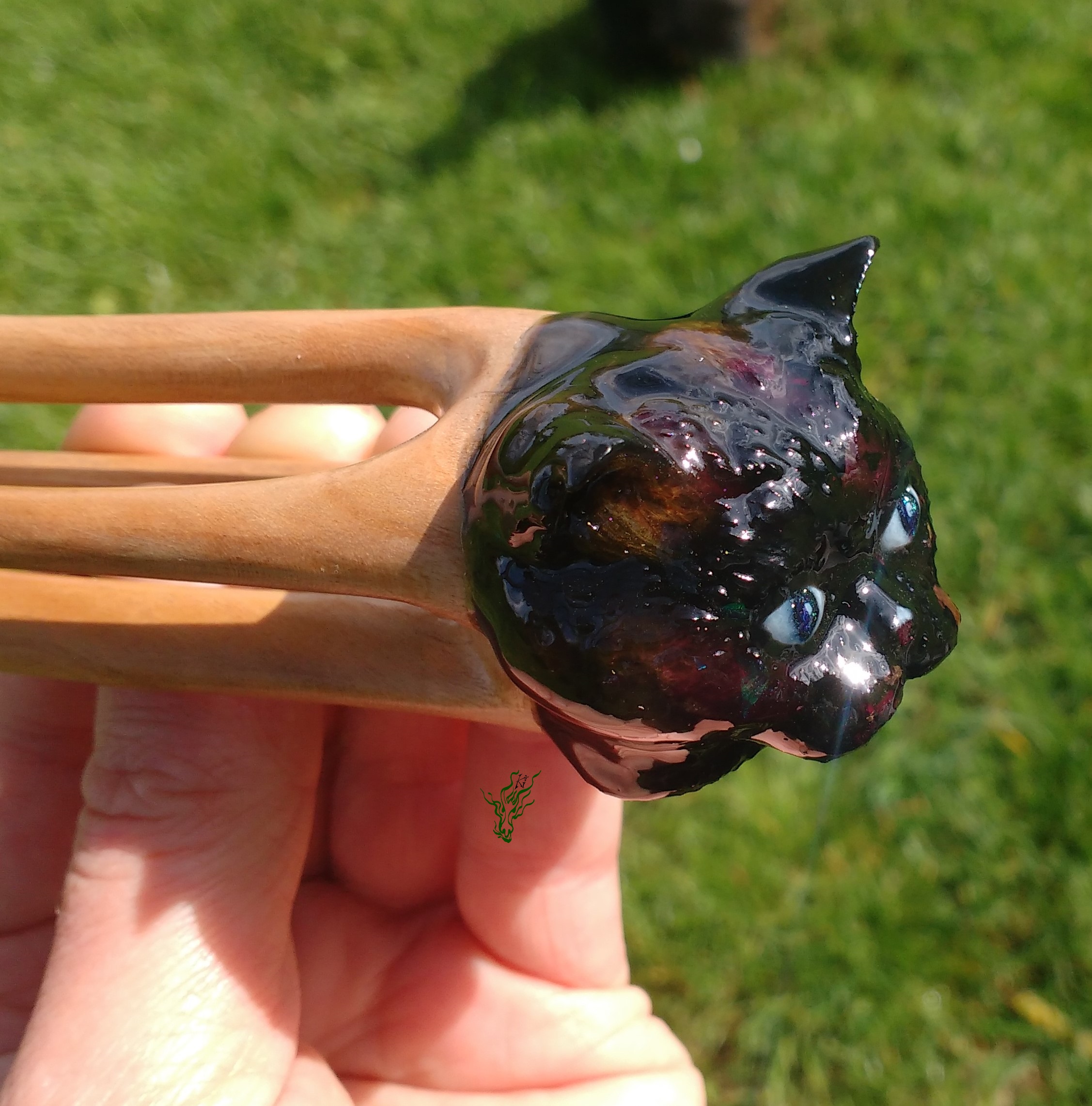 Ich habe die Forke so geschnitzt, dass sie sich optimal in die Frisur einfügt und möglichst wenig Gewicht hat. Sie ist gut ausbalanciert. Und du weisst ja, wie toll ich 3D Forken finde – sie halten besonders sicher und zaubern schönes Dutt Volumen. Für zusätzliche Tragesicherheit sorgen die Kopfformbiegung. Zusätzlich geschützt vor Feuchtigkeit von meiner Wachs- Öl- Mischung für Wahnsinnsglanz.