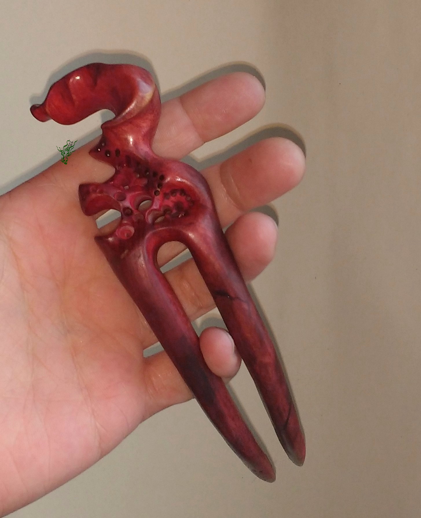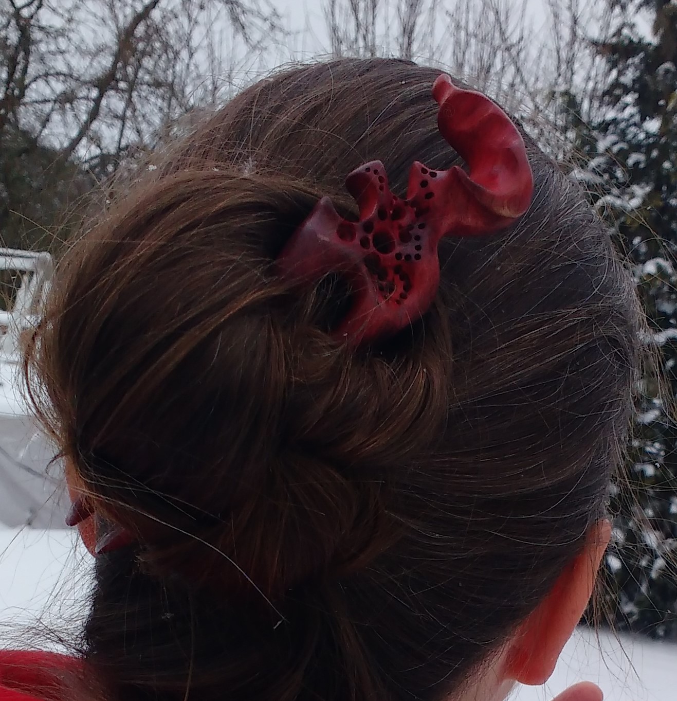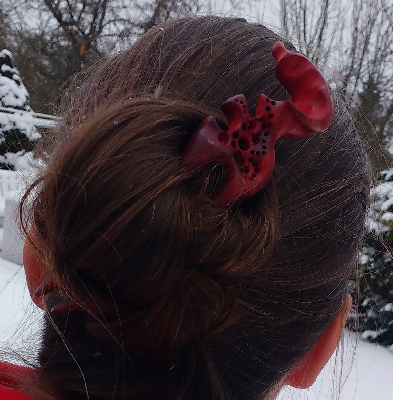 Diese hand geschnitzte Haarforke aus Olivenholz hat einen auffallenden, anspruchsvollen Topper und ist mit roten & lila Pigmenten behandelt. Insgesamgt ist sie zwar lang – die stark gebogene Form schmiegt sich jedoch eng an deinen Kopf – durch eine deutliche Kopfformrundung für große Bequemlichkeit und ein stimmiges Gesamtbild. Wie immer schütze ich das Holz durch eine Öl- Wachsmischung gegen Feuchtigkeit.
