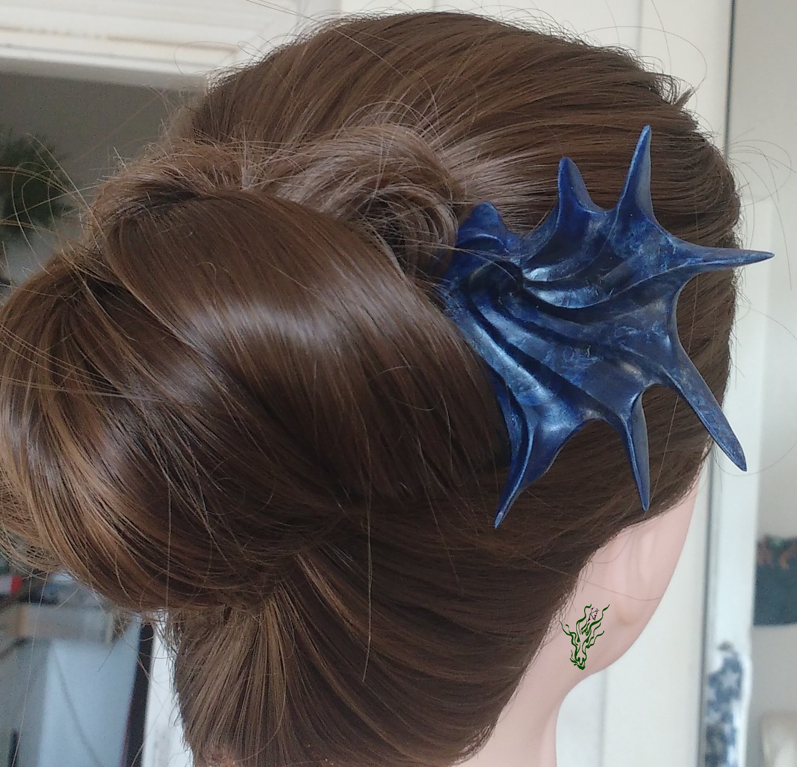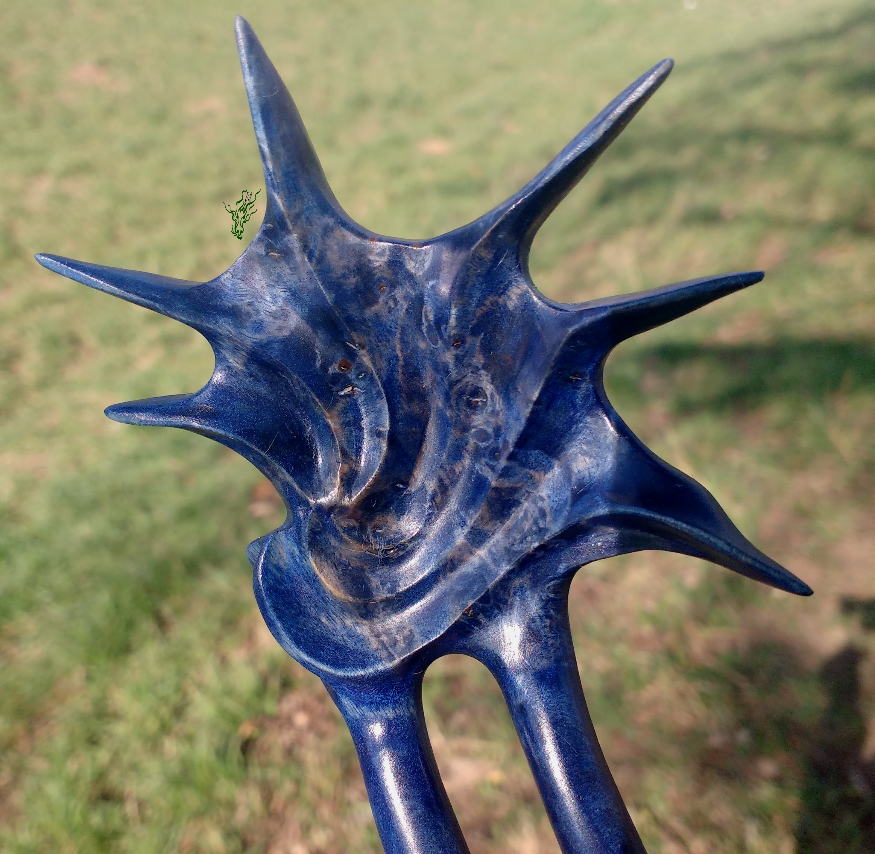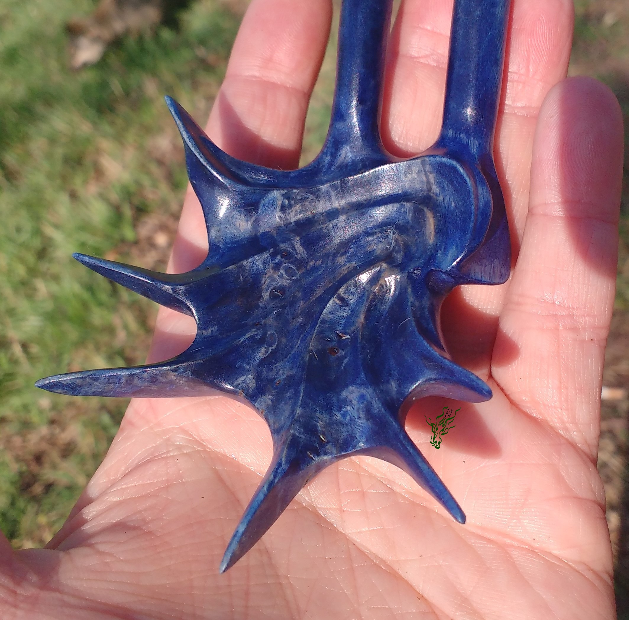 Perfekt für eine komplizierte Schnitzerei. Et Voilá: ein Statement Forke, ein Kunstwerk fürs Haar. Abgerundet mit royalblauen Pigmenten, um die Maserung hervor zu heben & geschützt von meiner Wachs- Öl- Mischung für Wahnsinnsglanz.
