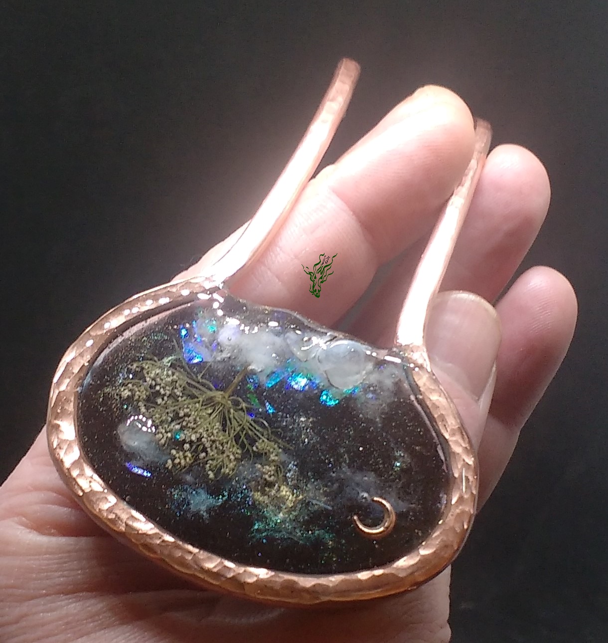 Gletschermalerei: echte Pflanzen &  Edelsteine  (Amethyst &  Bergkristall), Wolken, Schnee &  der Mond.  Regenbogenfarbige  Lichtinseln