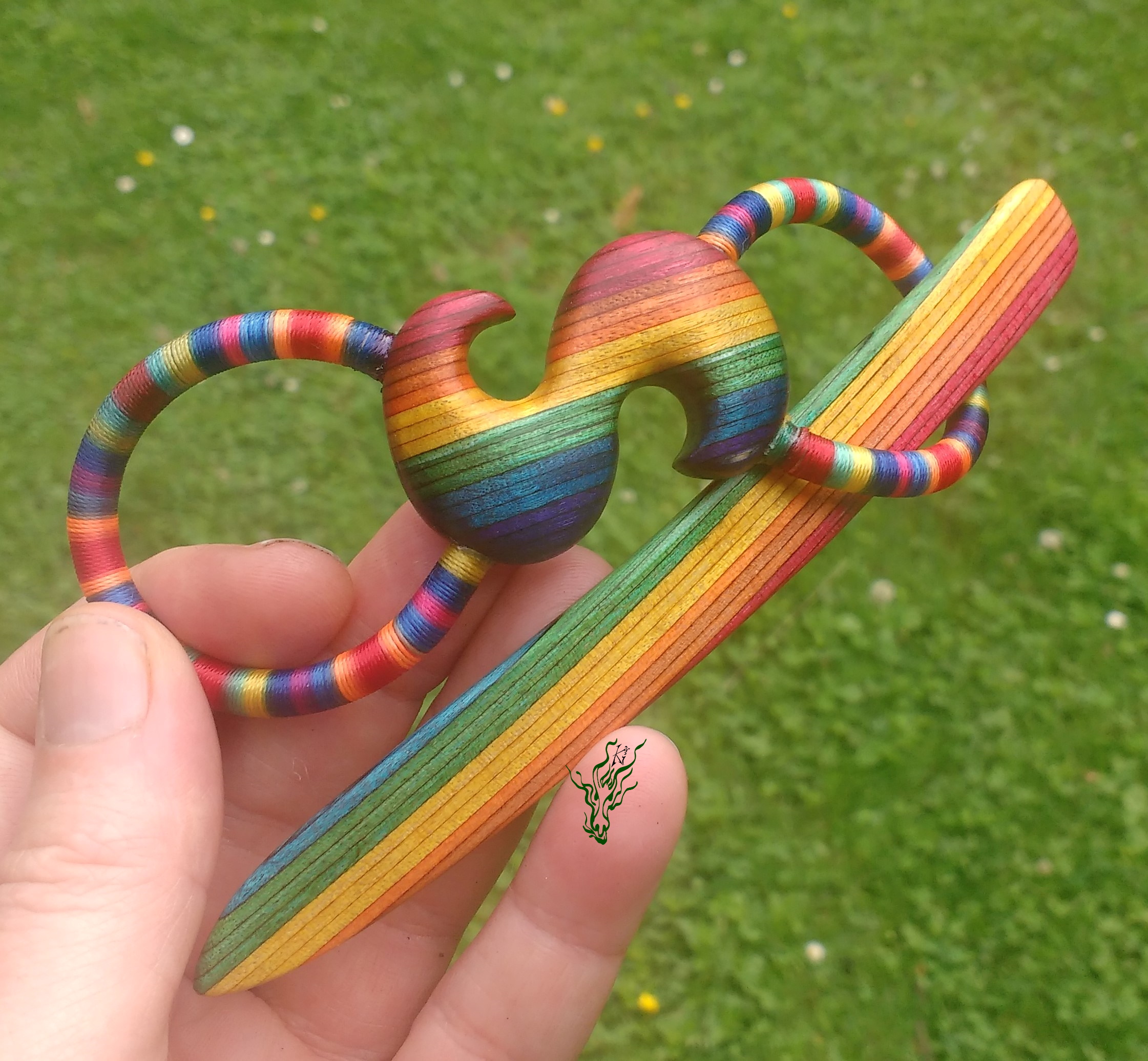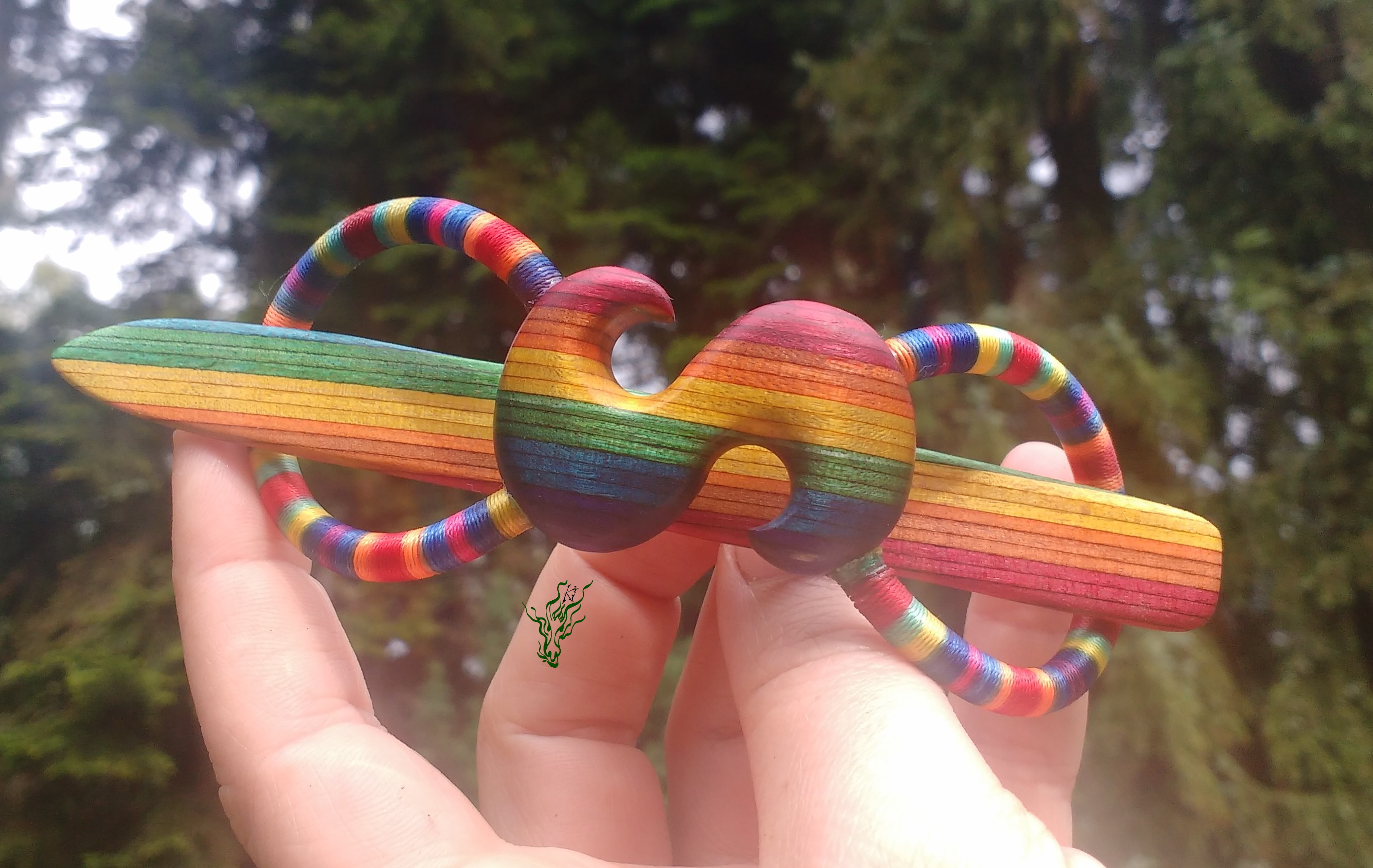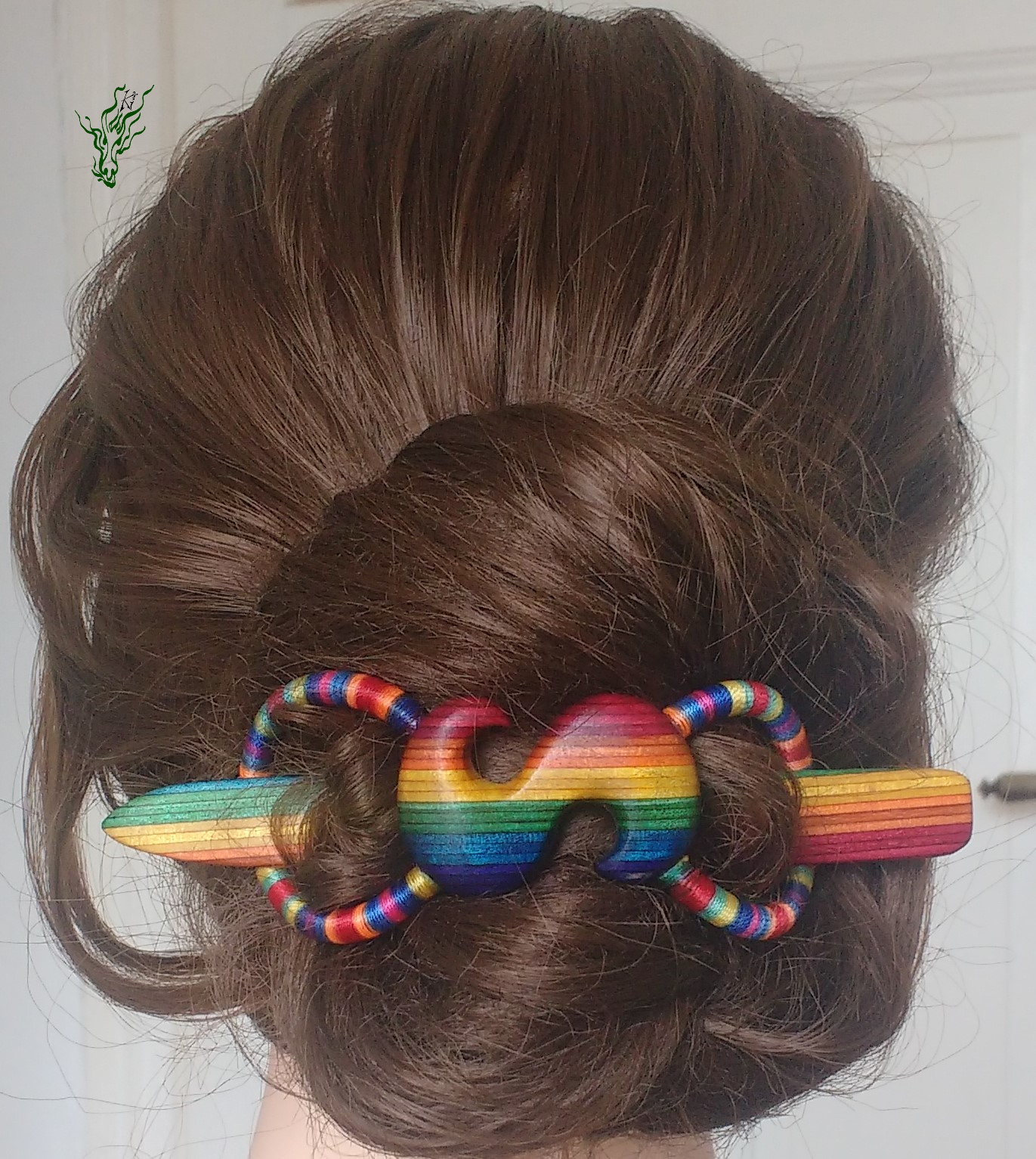 Haarspange aus meinem herrlichen selbst designten RegenbogenHolz & Regenbogenband (aus Regenbogengarn & Silikon, glaub ich). Die Vegane Variante meiner Haarspangen. Handgeschnitzt mit S für Sommer oder falls du Sophia heißt ^^ oder Gruppetto- Symbol,  falls du Musikerin bist.  Meine Haarspangen sind echt flexibel. Diese hier hält sowohl meinen Dutt mit 7,5 cm ZU- Taperhaar, wie auch das meines Modells, die mehr als 9 cm ZU hat – jeweils in meiner Duttvariante.