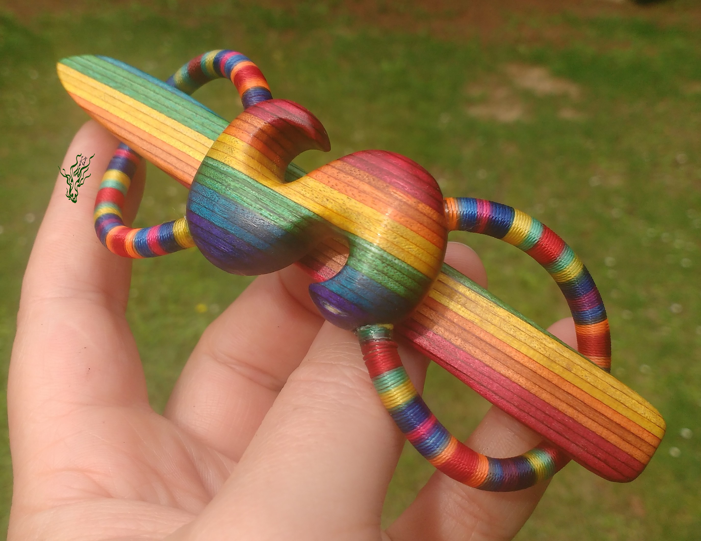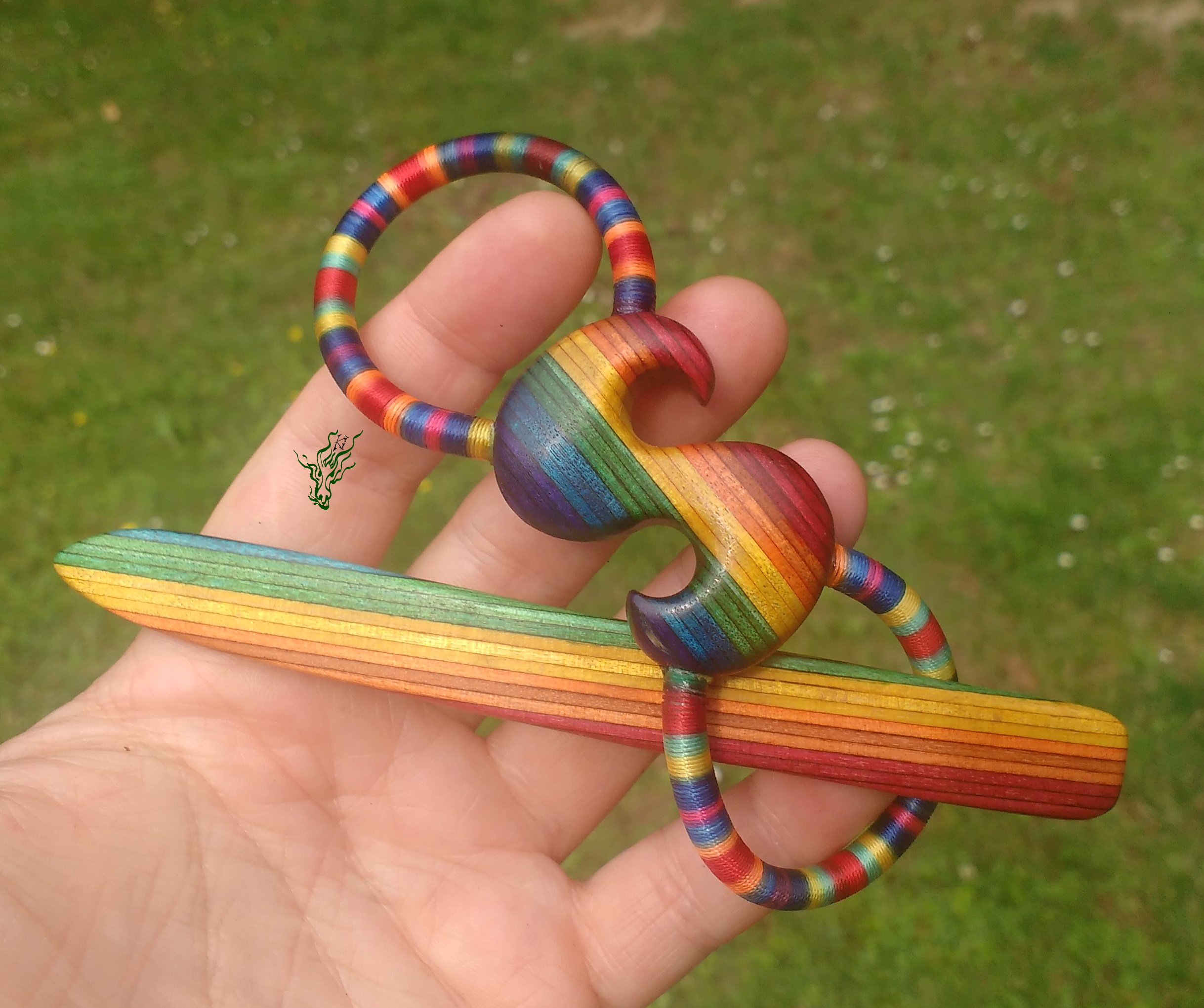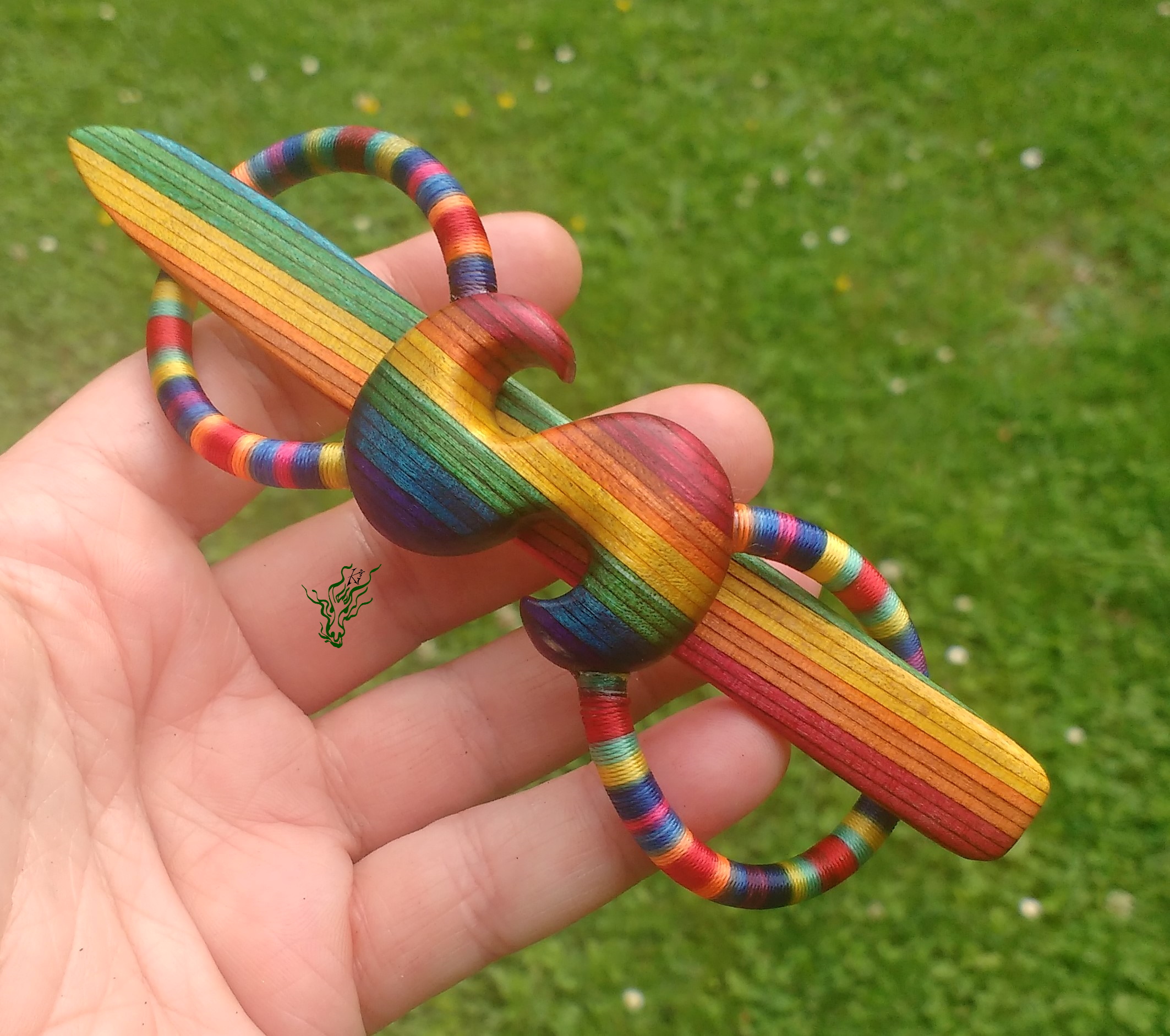 Haarspange aus meinem herrlichen selbst designten RegenbogenHolz & Regenbogenband (aus Regenbogengarn & Silikon, glaub ich). Die Vegane Variante meiner Haarspangen. Handgeschnitzt mit S für Sommer oder falls du Sophia heißt ^^ oder Gruppetto- Symbol,  falls du Musikerin bist.  Meine Haarspangen sind echt flexibel. Diese hier hält sowohl meinen Dutt mit 7,5 cm ZU- Taperhaar, wie auch das meines Modells, die mehr als 9 cm ZU hat – jeweils in meiner Duttvariante.