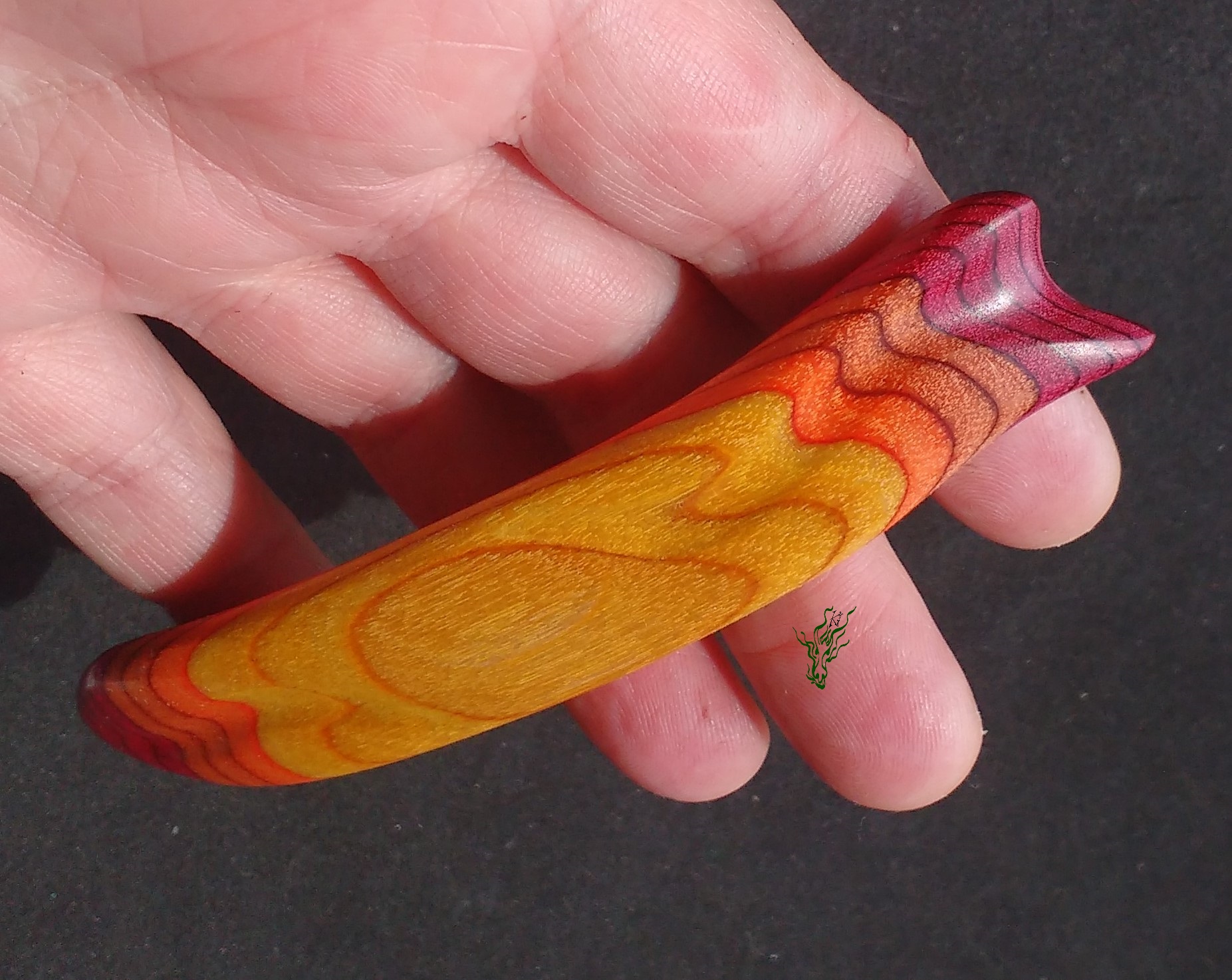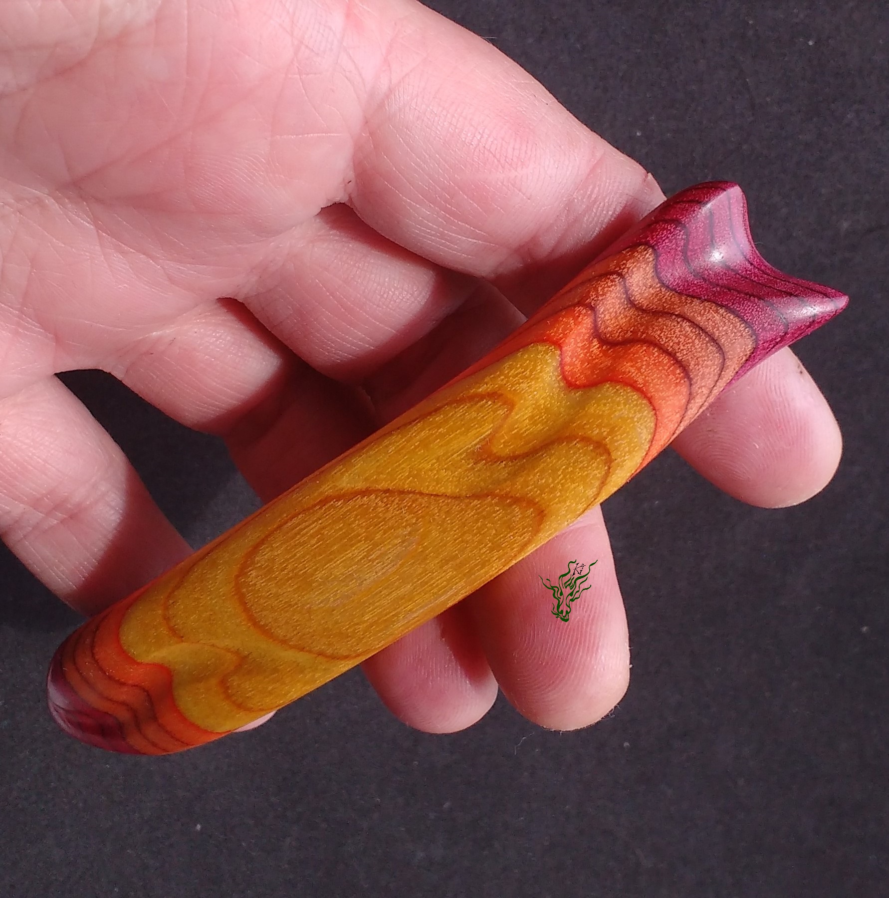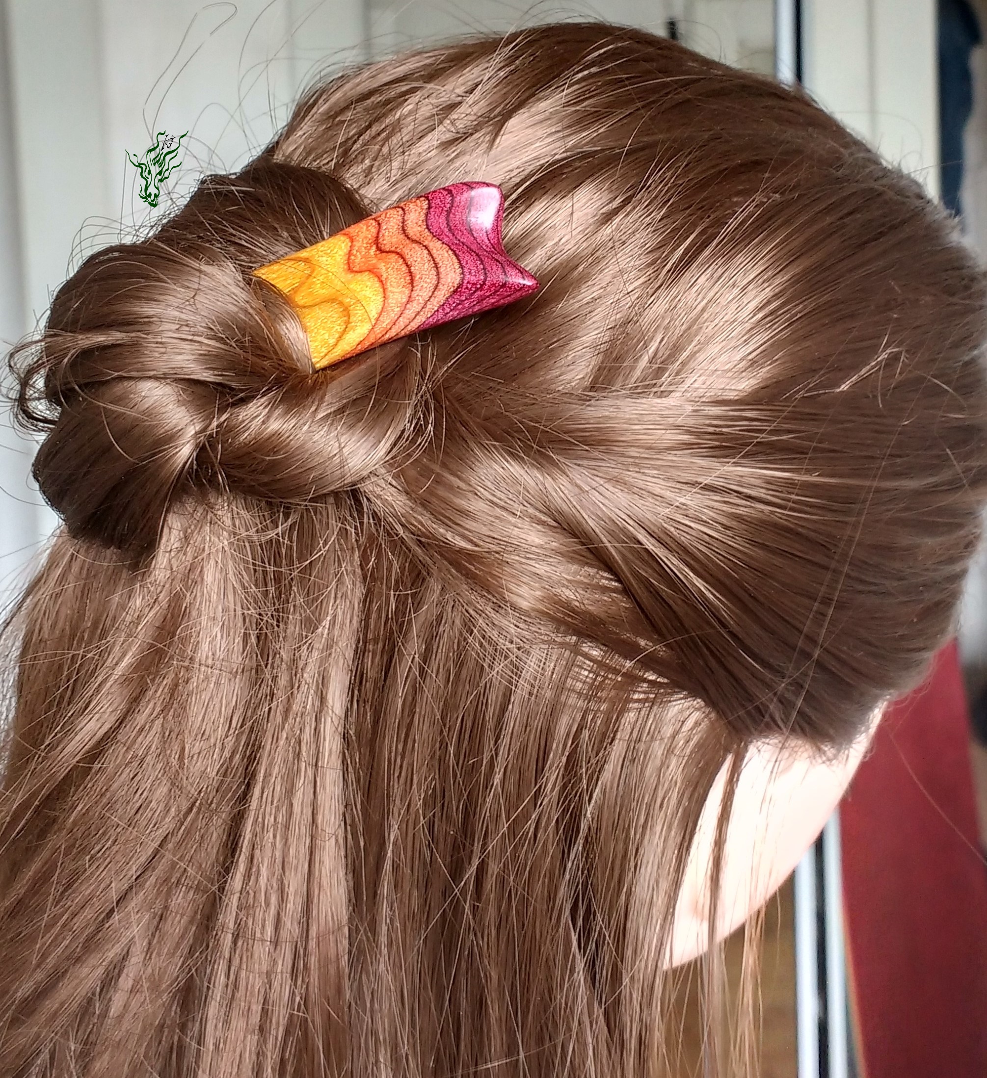 Zum  Geburtstag des Jadedrachen habe ich mir einen lang  gehegten Wunsch erfüllt und mein RegenbogenHolz  selbst  designt.  Dieses einzigartige, bunte  Schichtholz ist auf Echtholzbasis. Die Farben des Feuers findest du in diesem bequemen Haarstab –  schön  breit  zur Entlastung und mit  Kopfformbiegung   für  Bequemlichkeit & Halt. leicht &  Feenhaar  geeignet.  Vor  Feuchtigkeit  geschützt durch meine Wachs- Öl-  Mischung & auf  Hochglanz poliert.