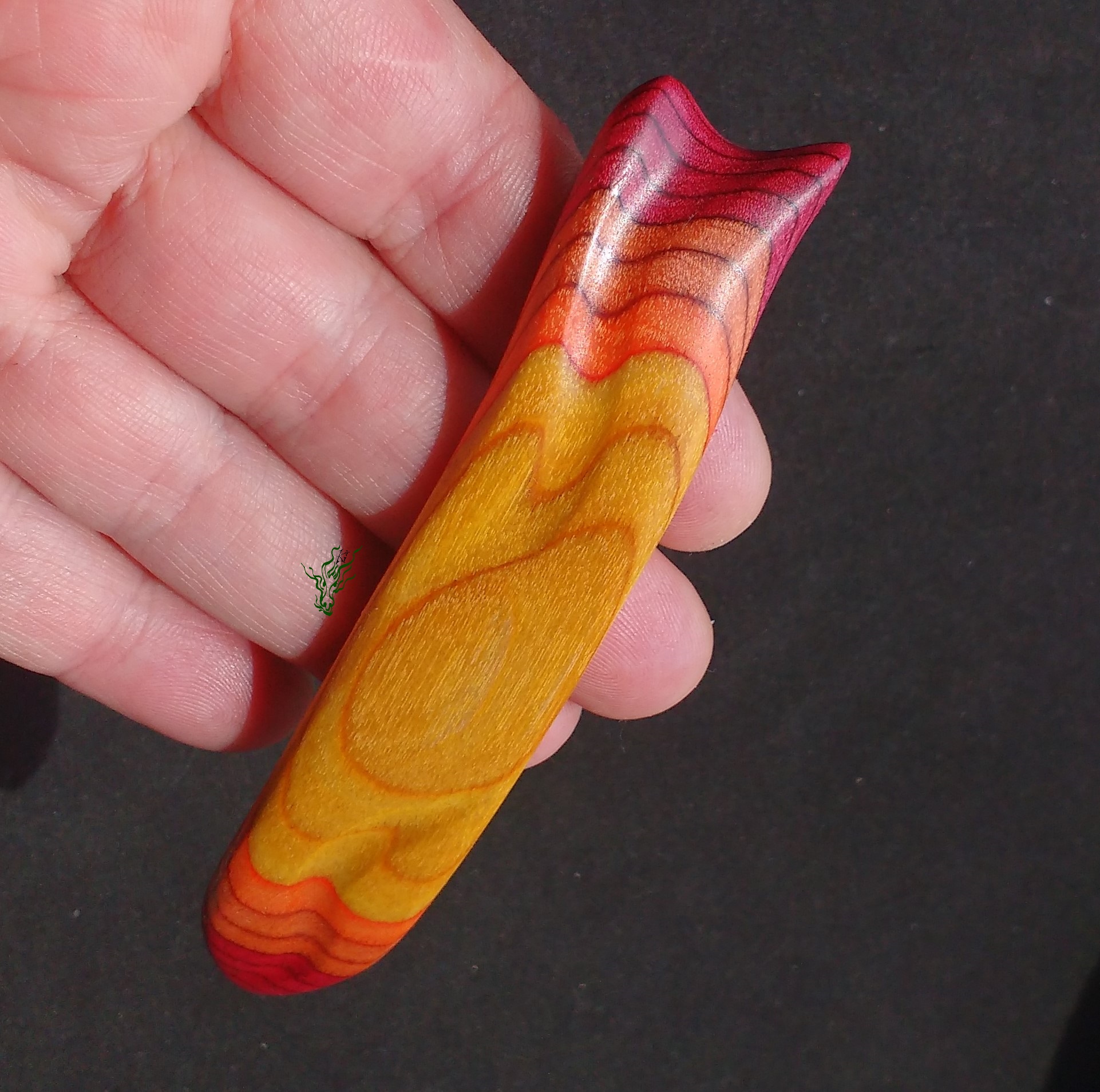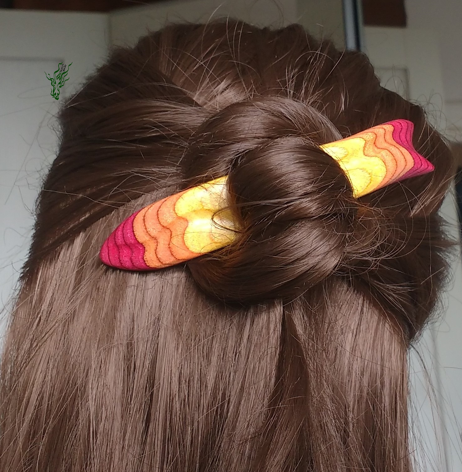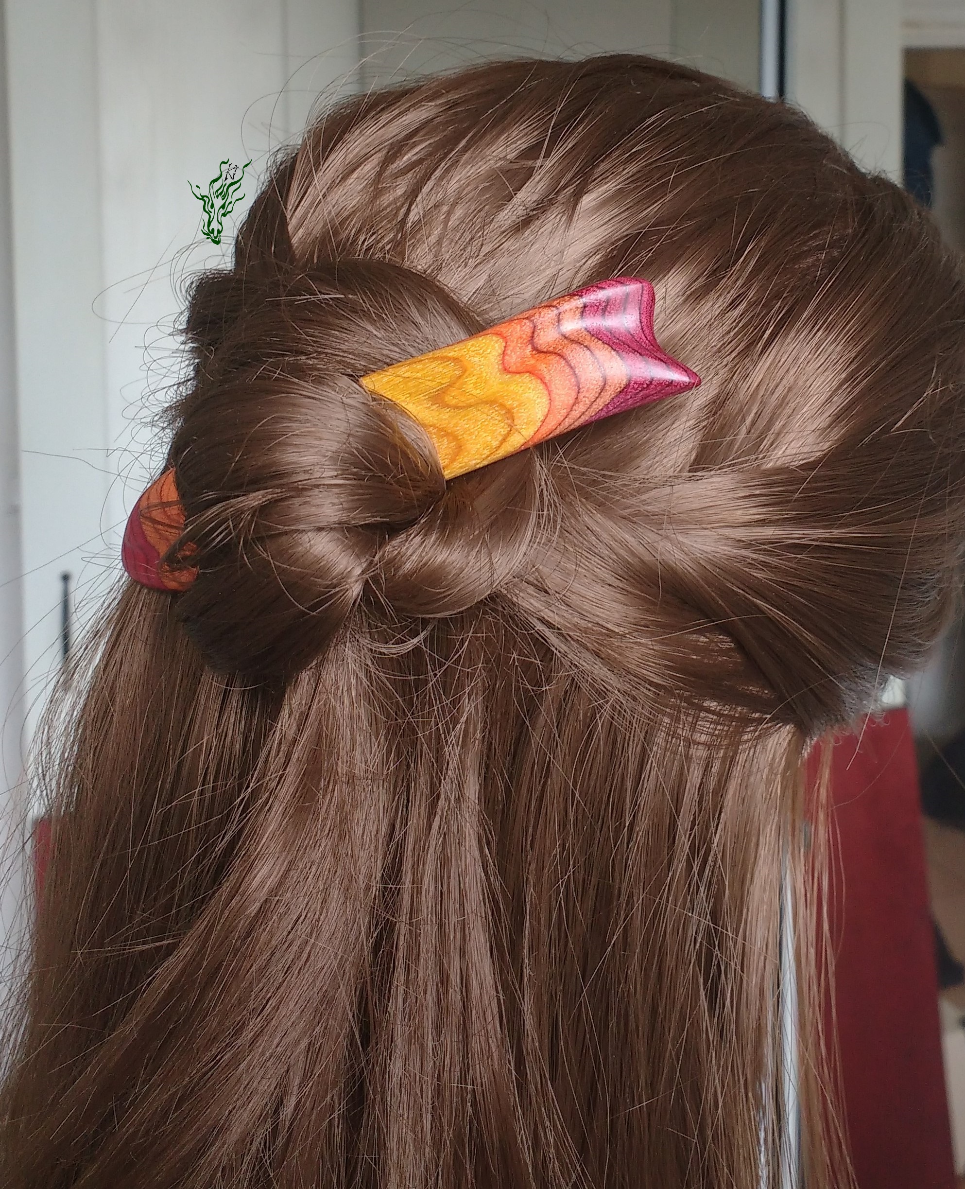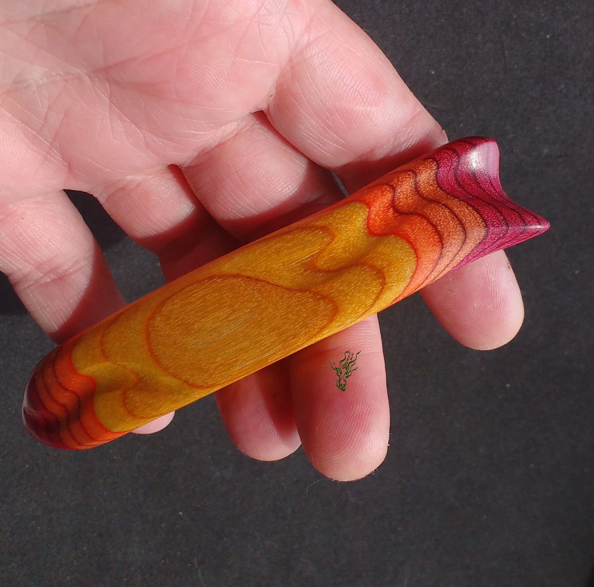 Zum  Geburtstag des Jadedrachen habe ich mir einen lang  gehegten Wunsch erfüllt und mein RegenbogenHolz  selbst  designt.  Dieses einzigartige, bunte  Schichtholz ist auf Echtholzbasis. Die Farben des Feuers findest du in diesem bequemen Haarstab –  schön  breit  zur Entlastung und mit  Kopfformbiegung   für  Bequemlichkeit & Halt. leicht &  Feenhaar  geeignet.  Vor  Feuchtigkeit  geschützt durch meine Wachs- Öl-  Mischung & auf  Hochglanz poliert.