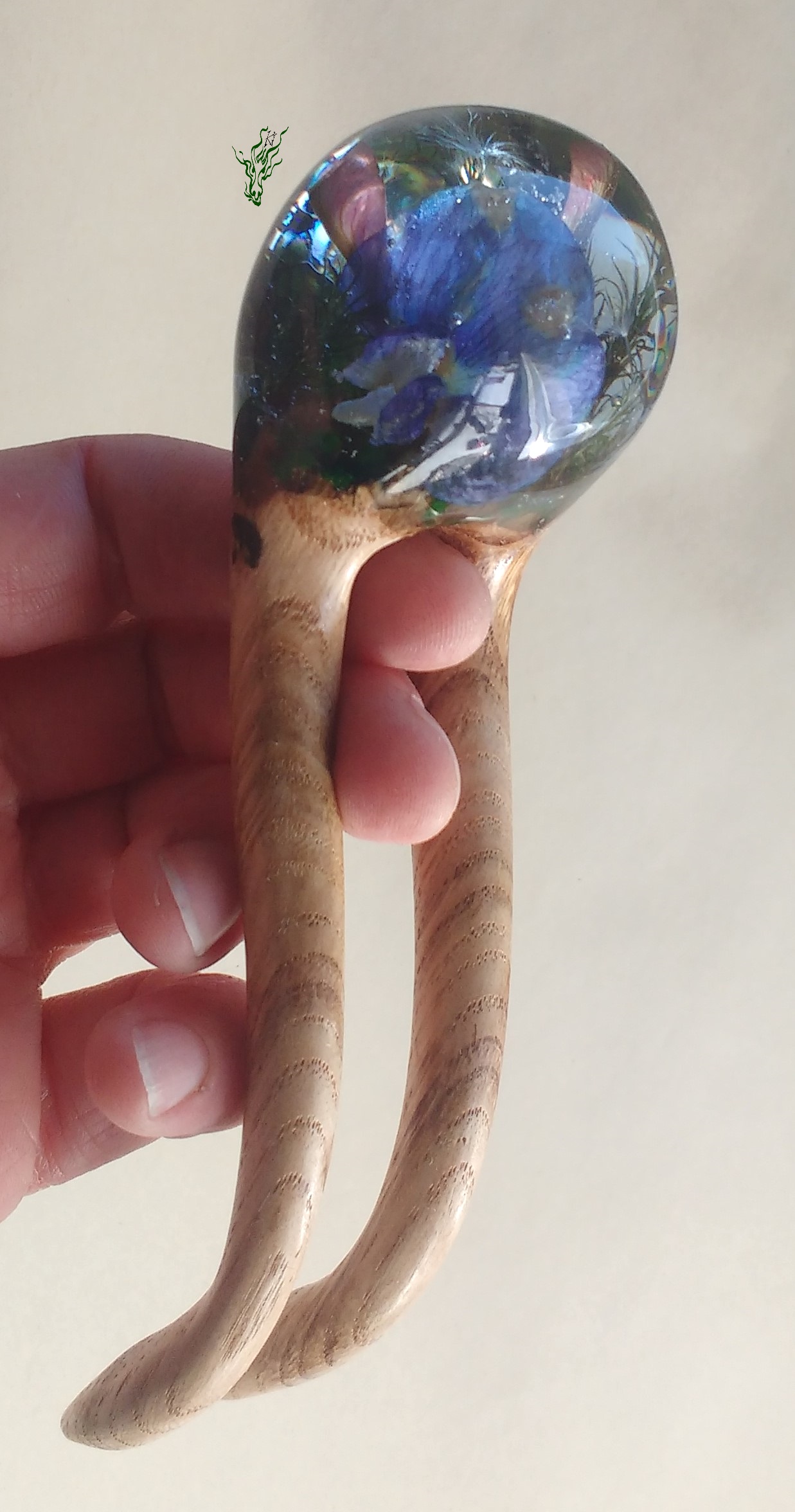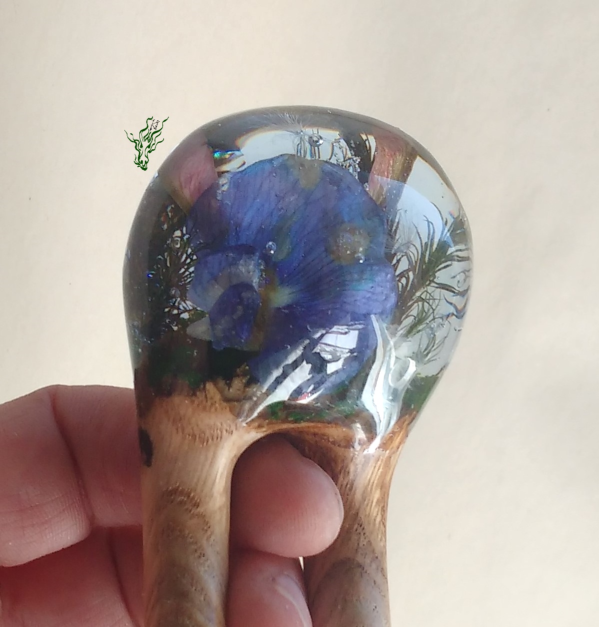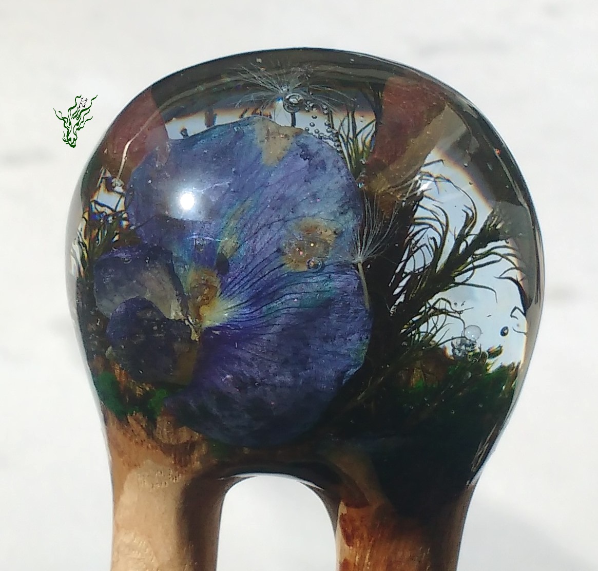 Wiesenpflanzen, Wickenblüten und frische Ahornflügelchen umgeben von irisierenden Bläschen, ein einzelner Pusteblumenschirm hebt gerade ab und entstanden ist eine kleine Welt, in der du versinken kannst. In einer bläulich- durchsichtigen, hochglänzenden Kuppel, die auf aufregendem Eschen-Holz wohnt.