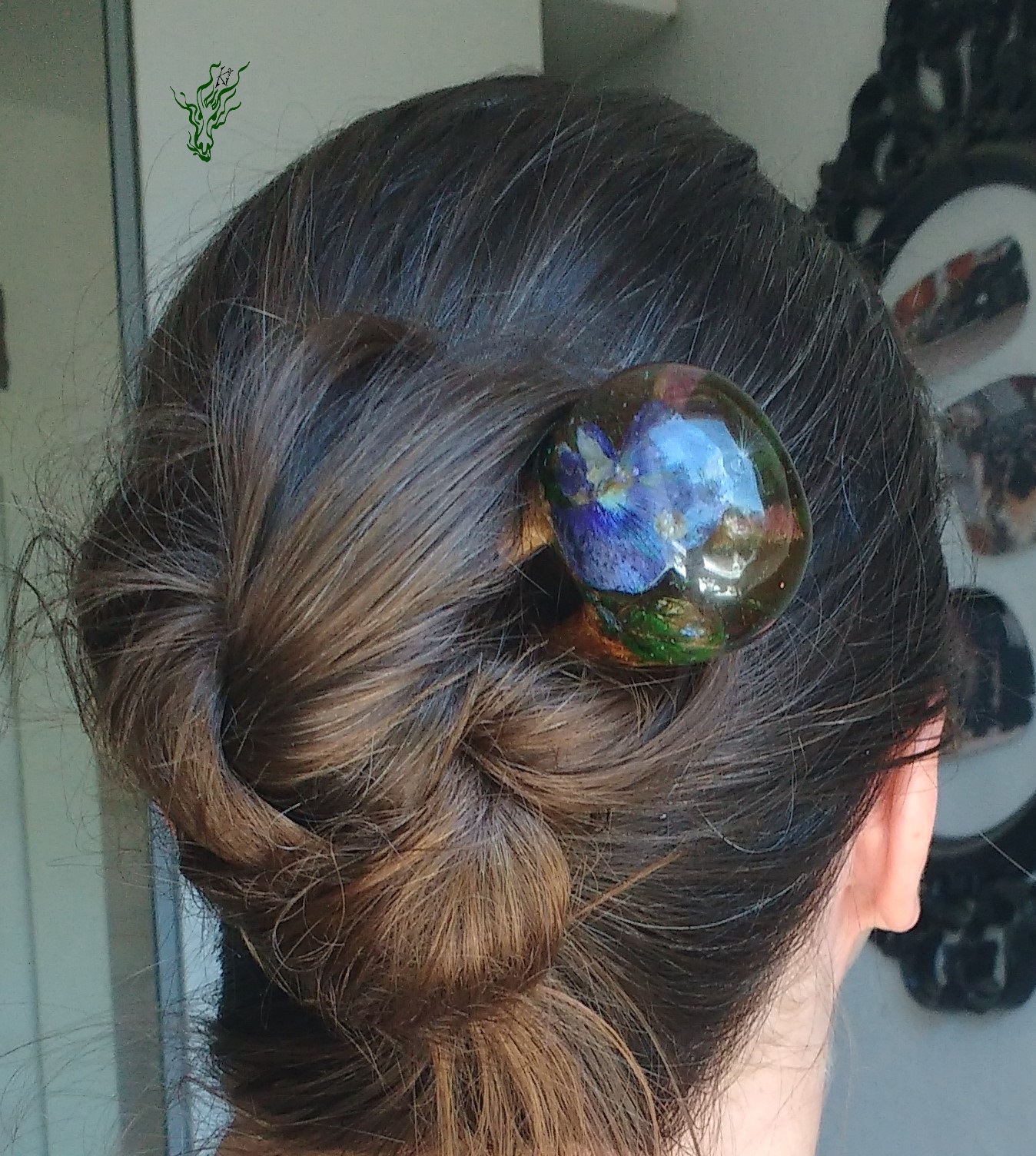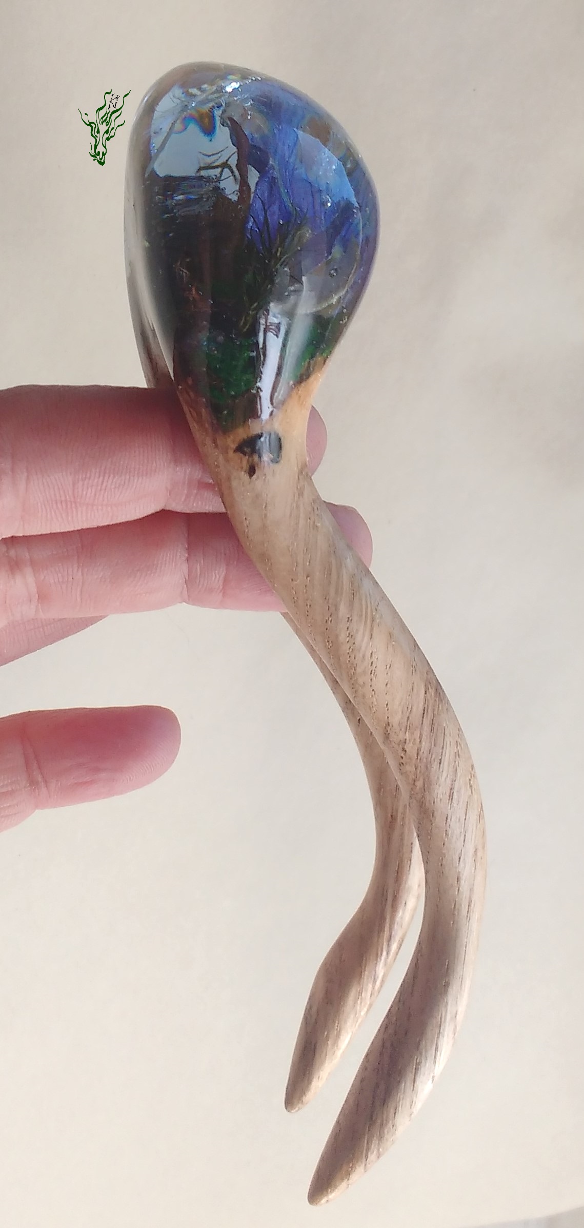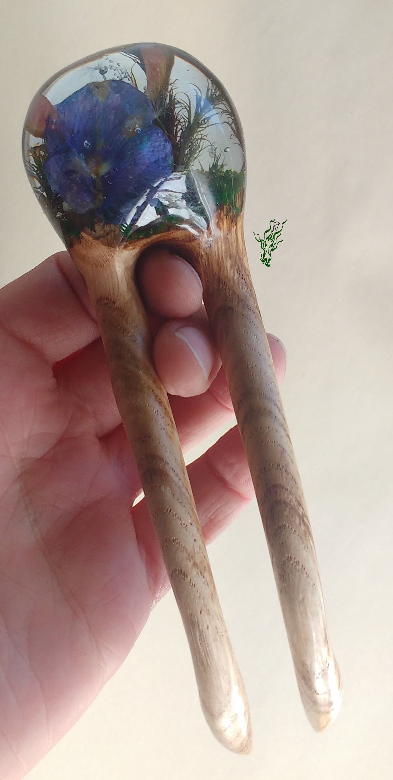 Wiesenpflanzen, Wickenblüten und frische Ahornflügelchen umgeben von irisierenden Bläschen, ein einzelner Pusteblumenschirm hebt gerade ab und entstanden ist eine kleine Welt, in der du versinken kannst. In einer bläulich- durchsichtigen, hochglänzenden Kuppel, die auf aufregendem Eschen-Holz wohnt.