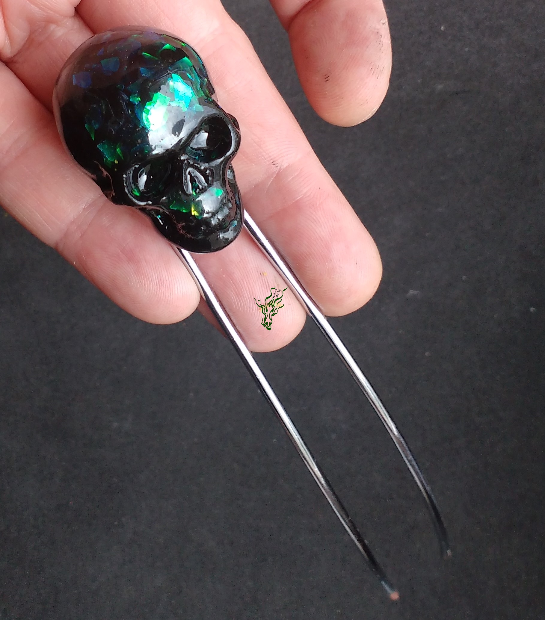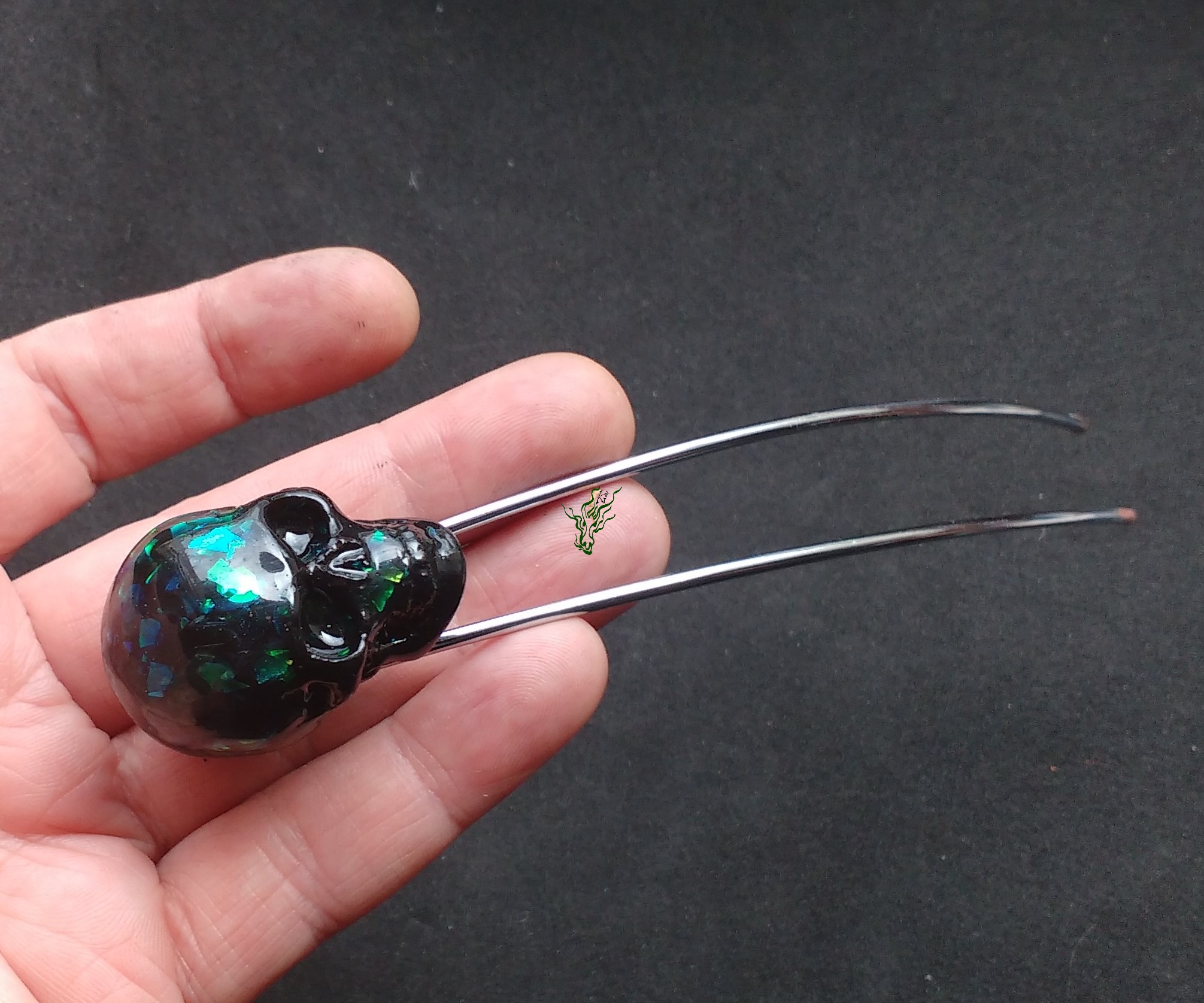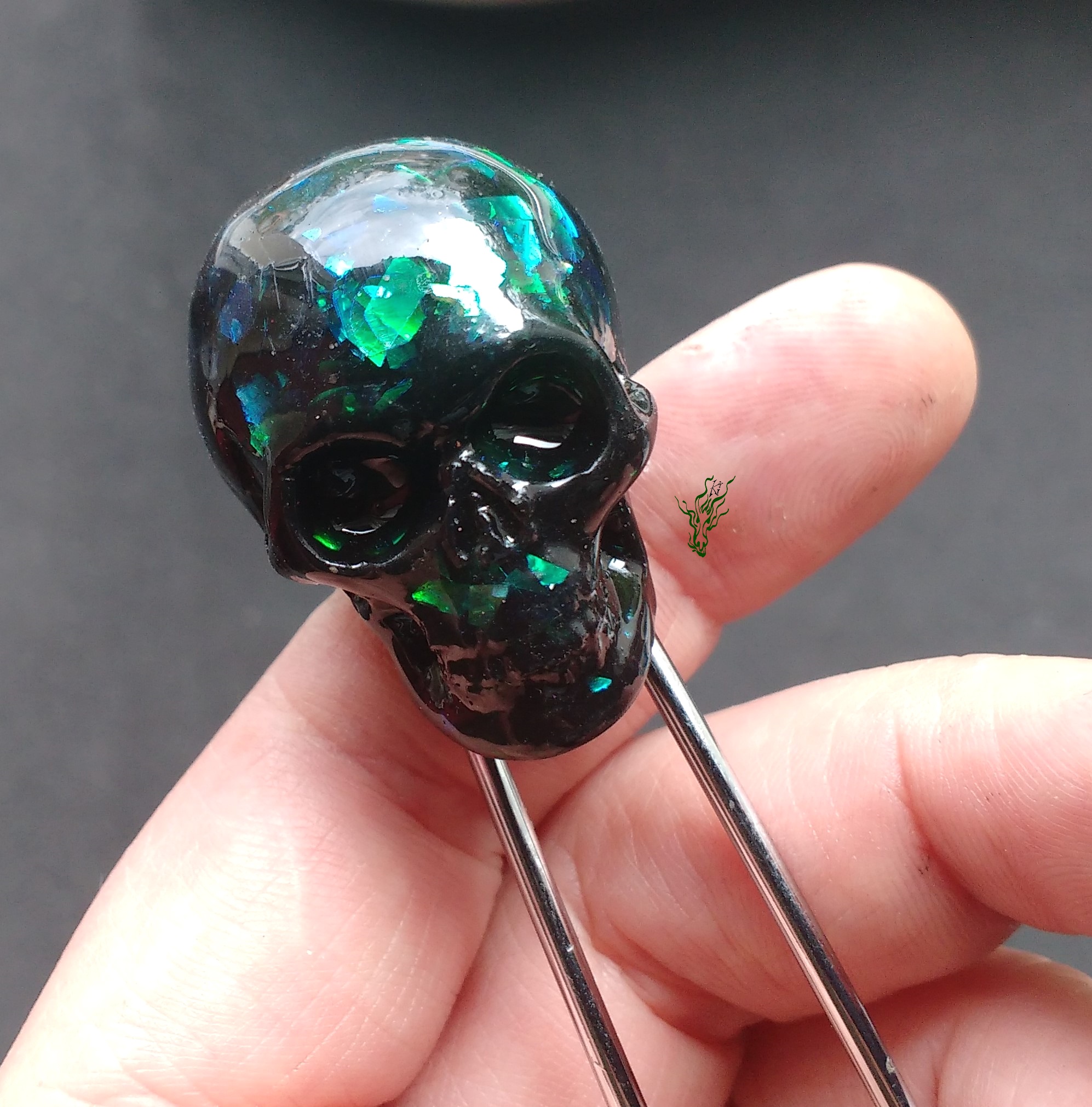 Der Schädel ist von Hand geschnitzt aus mit Metallpartikeln durchzogenen schwarzen Resin mit Flitter in Abalone- Optik.