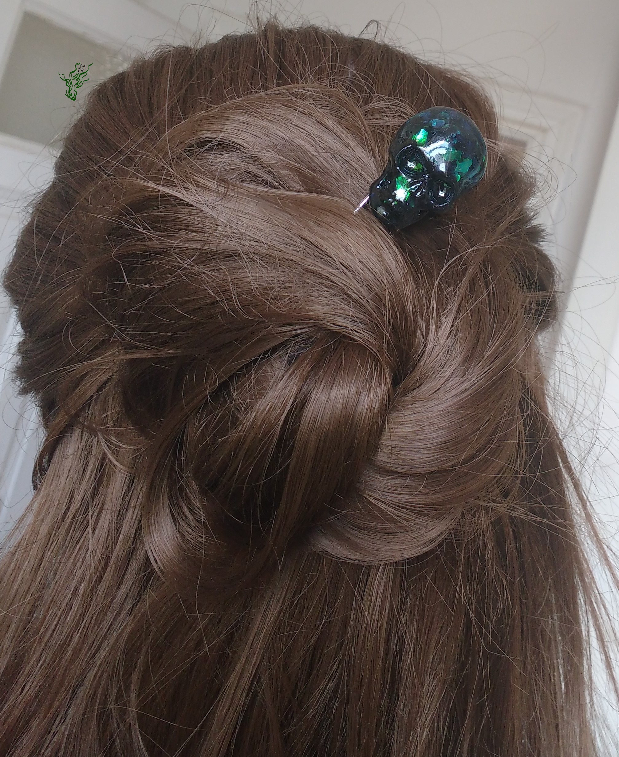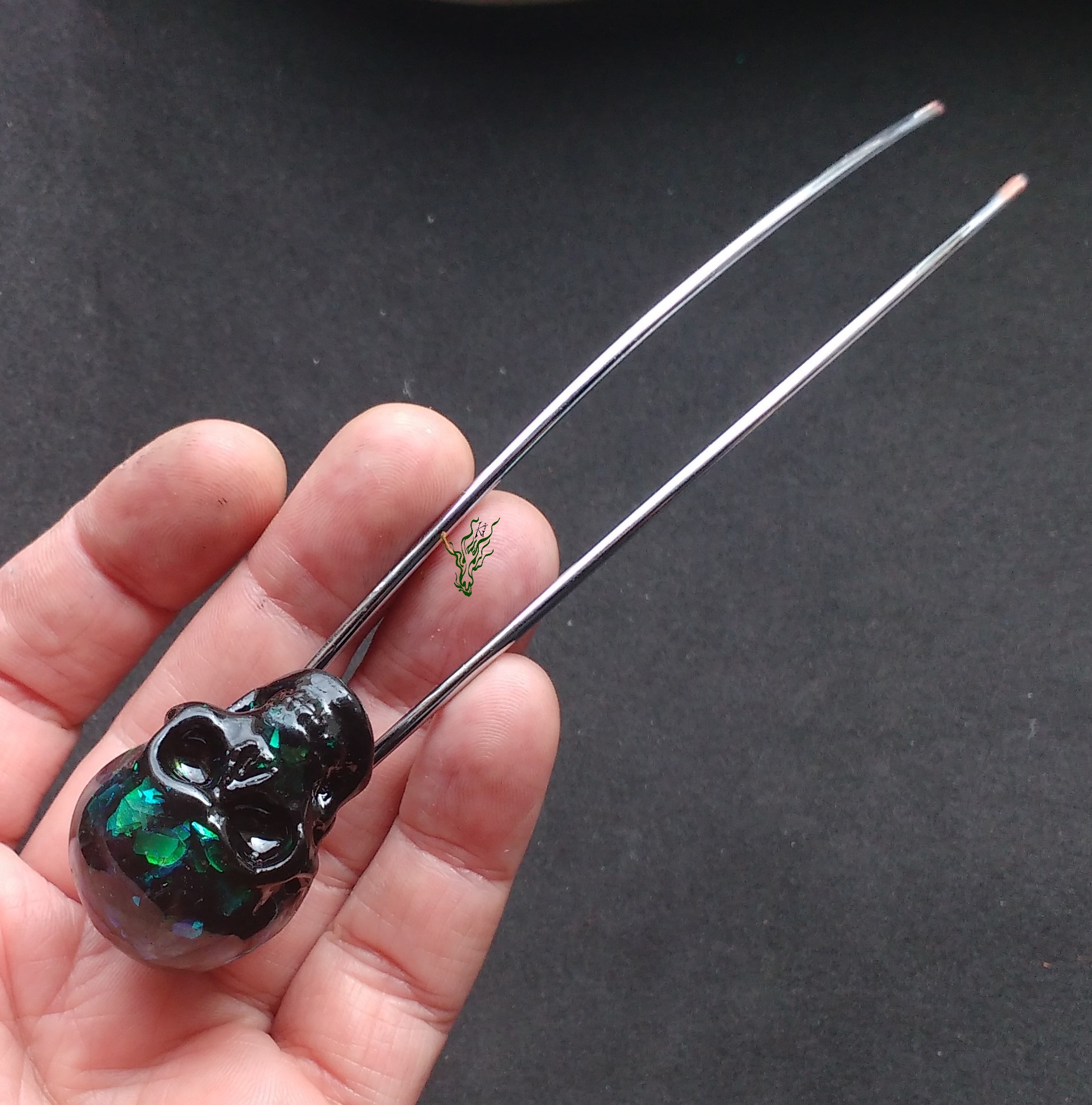 Für die Beine habe ich ein Küchenutensil aus Edelstahl upcycelt. Für extra dünne aber stabile Zinken, natürlich mit Kopfformbiegung. Der Totenkopf für Feenhaar.
