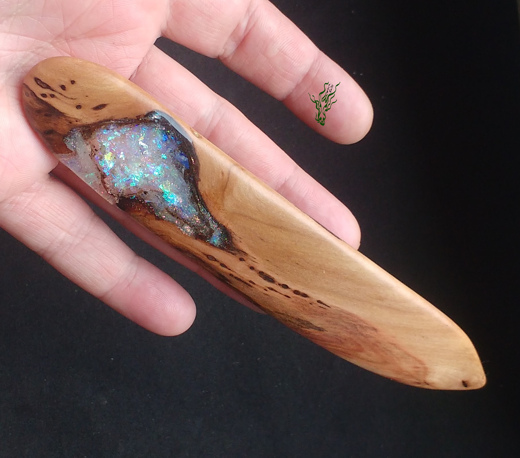 Wieder so ein seltenes Holzwunder! Das RotdornHolz überrascht mit Farben von roten Streifen über cremiges braun bis hin zu schwarzen Sommersprossen. Breiter Gletscherstab , so bequem aus rarem,  wunderbar  gemasertem RotdornHolz. Regenbogiger  Glitzer in klar, schimmert  anders in jedem Licht.  In Kopfform  gebogen und natürlich gegen Feuchtigkeit geschützt durch meine Wachs- Öl- Mischung.