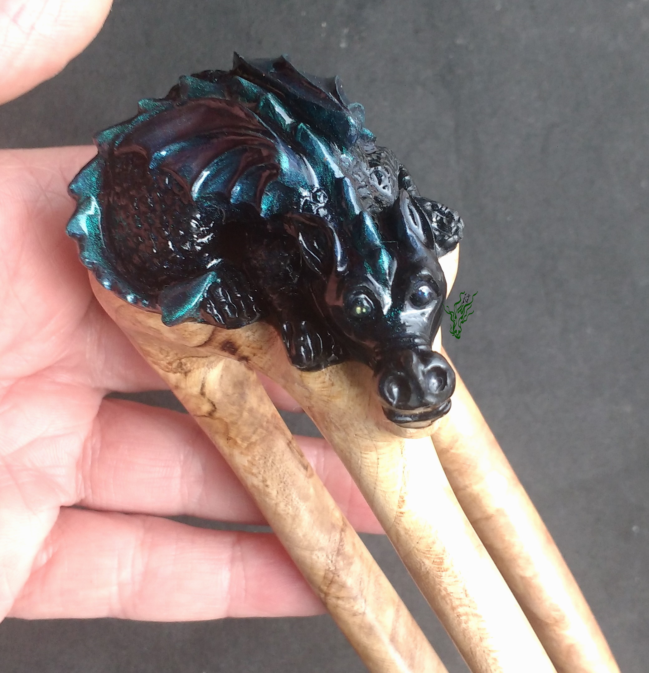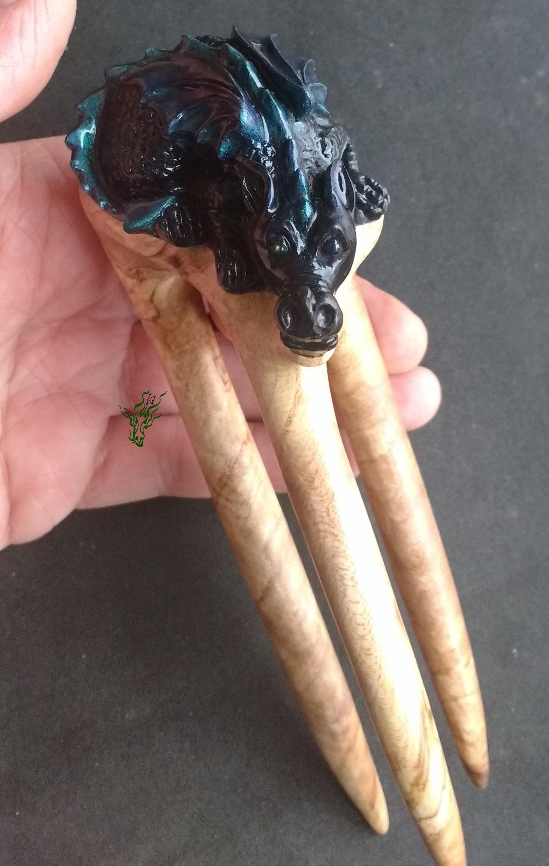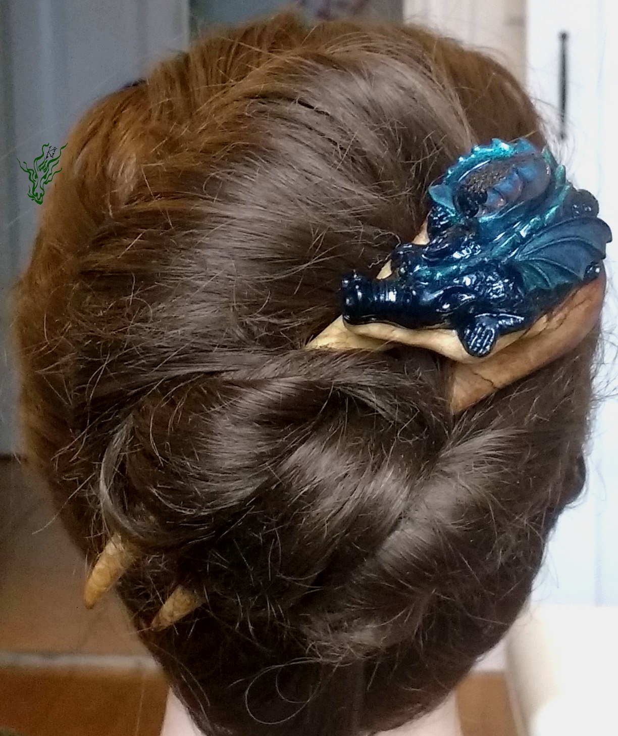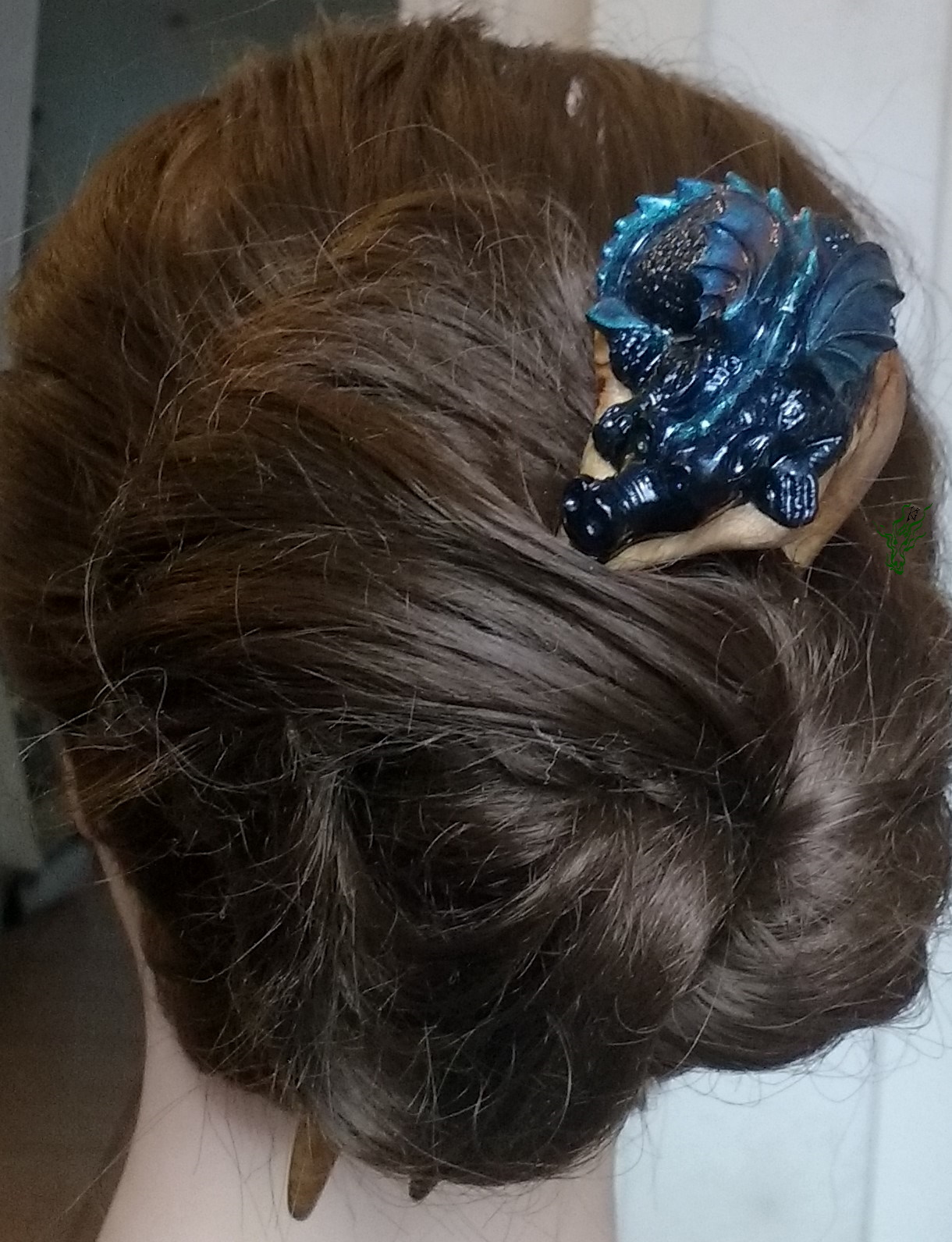 Ein tiefschwarzer Drache mit holo- blauen Schimmerpigmenten. Detailliert & mit Persönlichkeit. Et Voilá: eine Statement Forke, ein Kunstwerk für dein Haar.