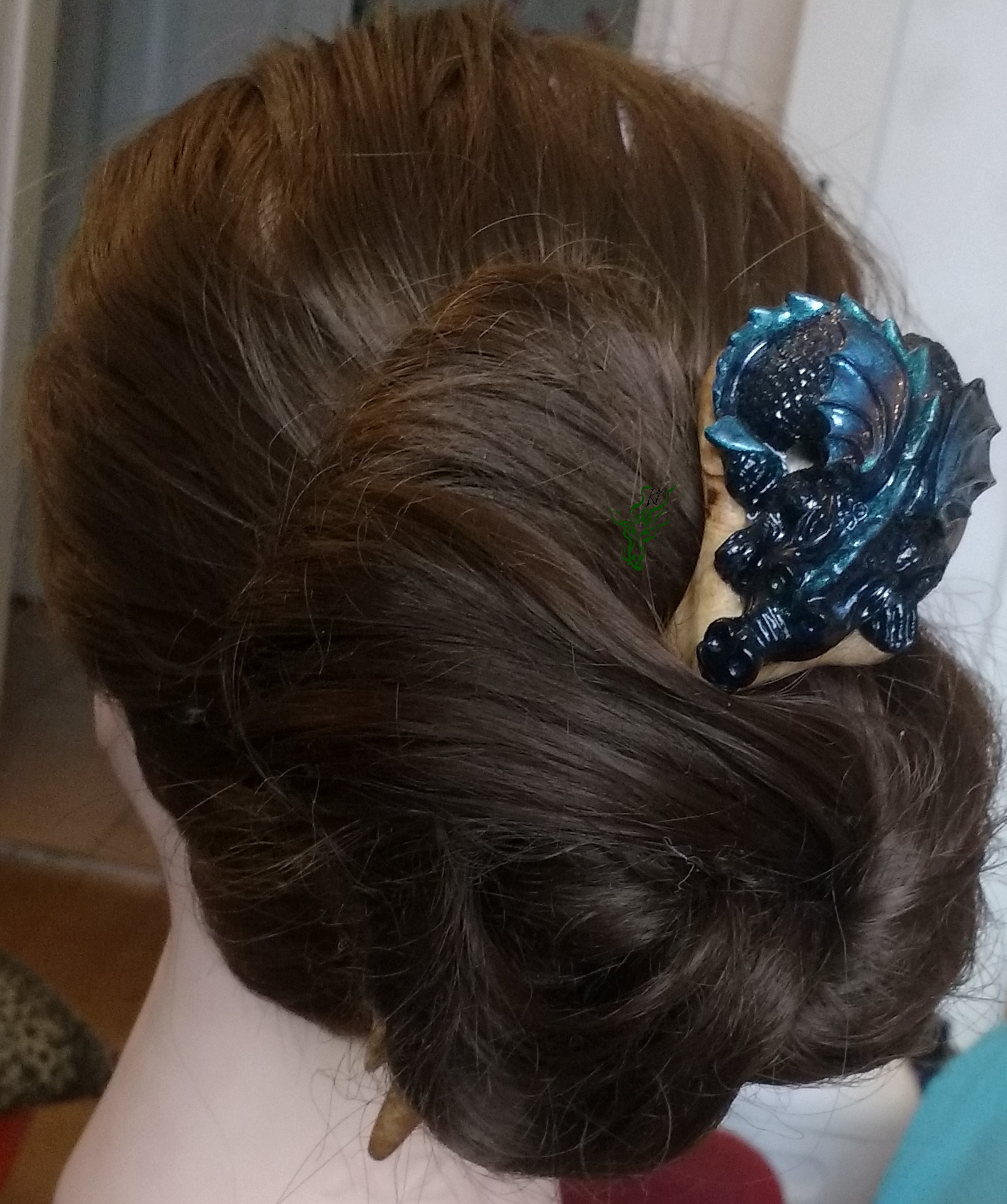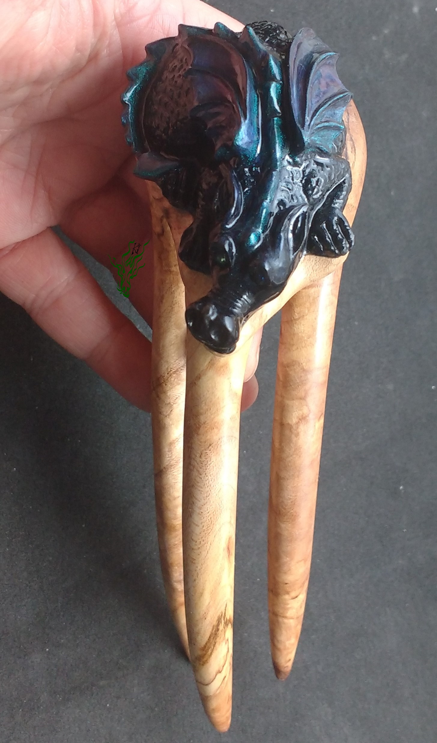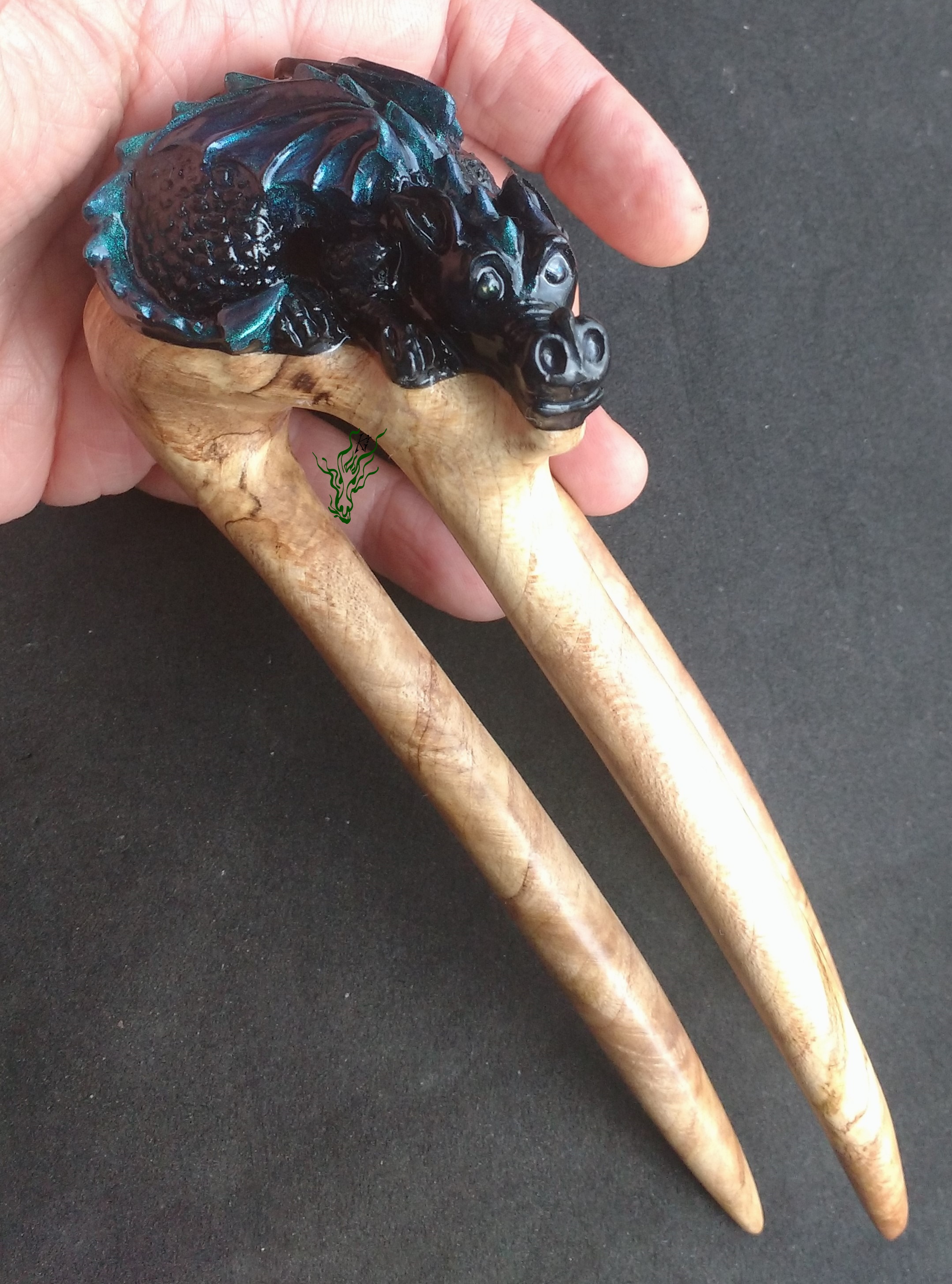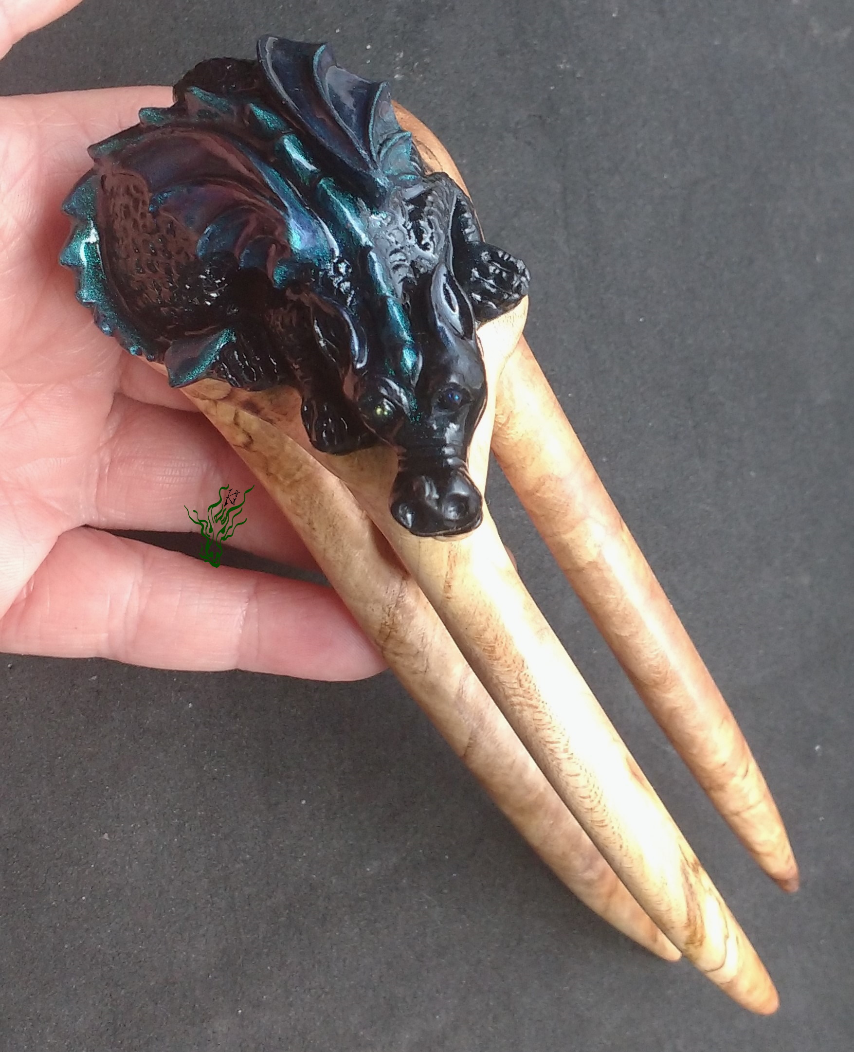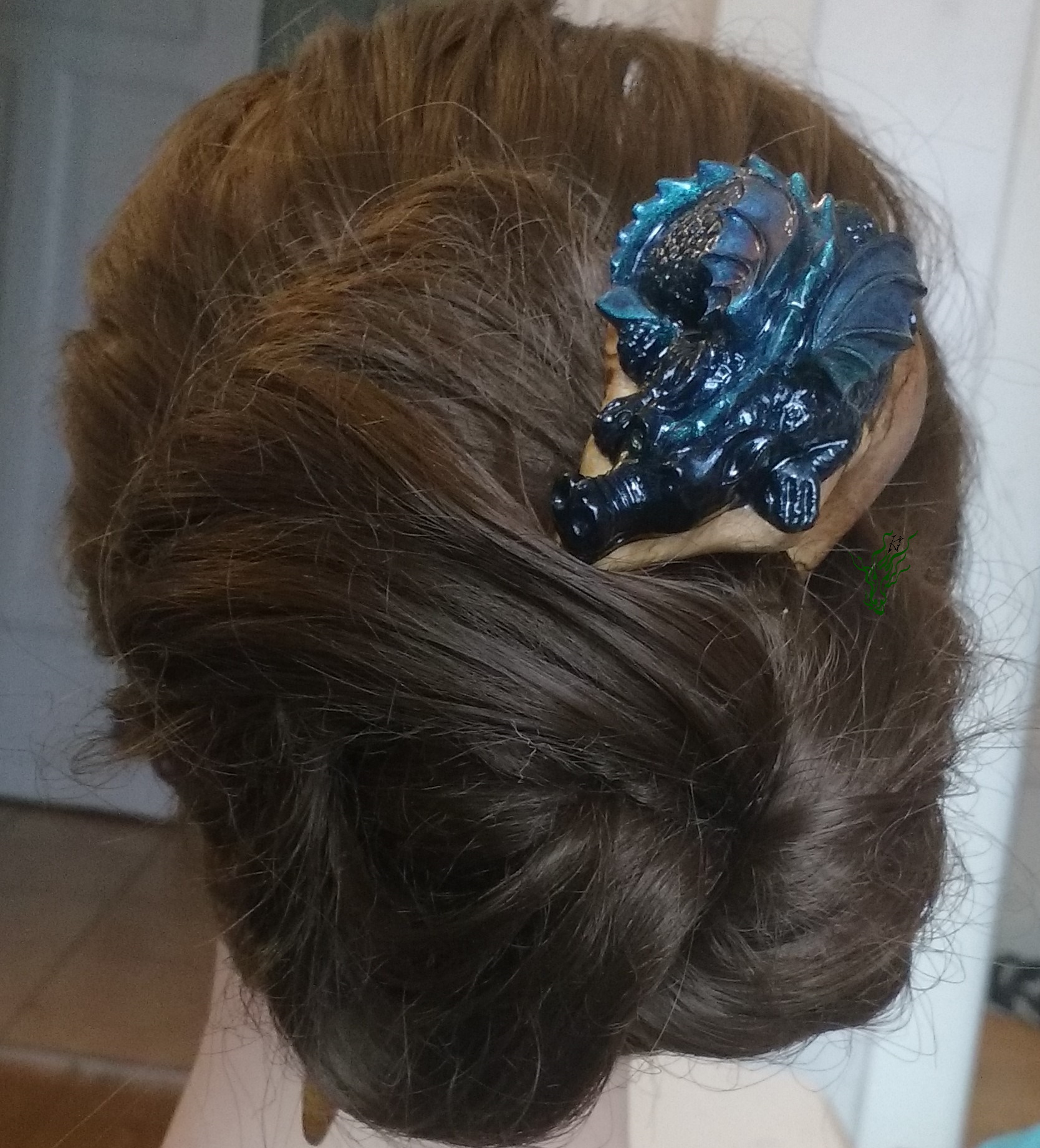 Ein tiefschwarzer Drache mit holo- blauen Schimmerpigmenten. Detailliert & mit Persönlichkeit. Et Voilá: eine Statement Forke, ein Kunstwerk für dein Haar.
