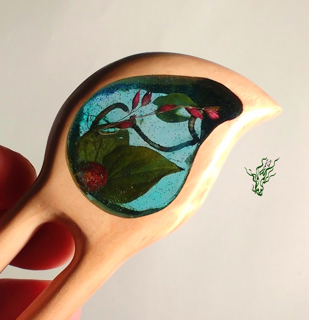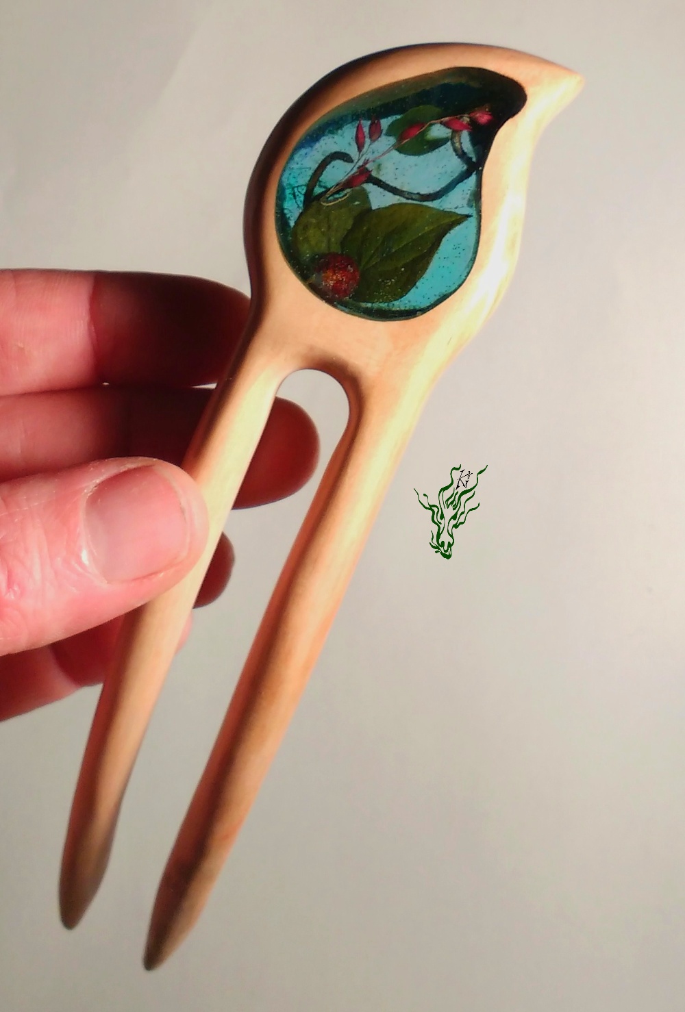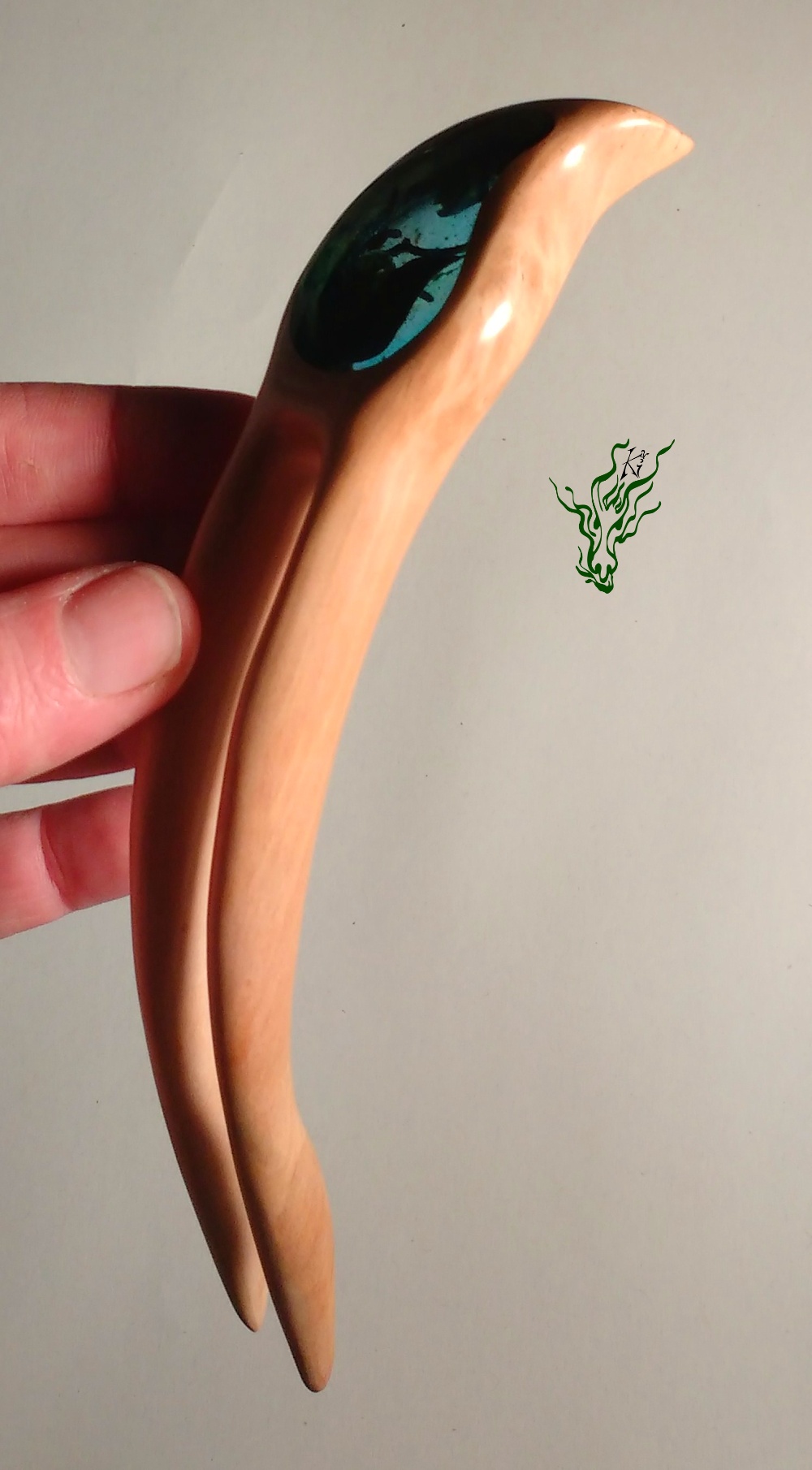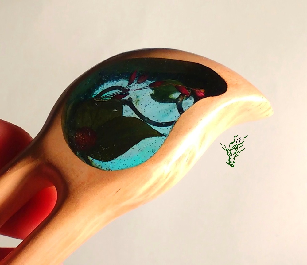 Natürlich hat diese Gletscherforke mit *Glück* auch wieder eine Kopfwölbung, bequemen Zinkenabstand & Nöpsies für den optimalen Halt. Sie ist hand geschnitzt und aus seidenglattem Birnenholz.