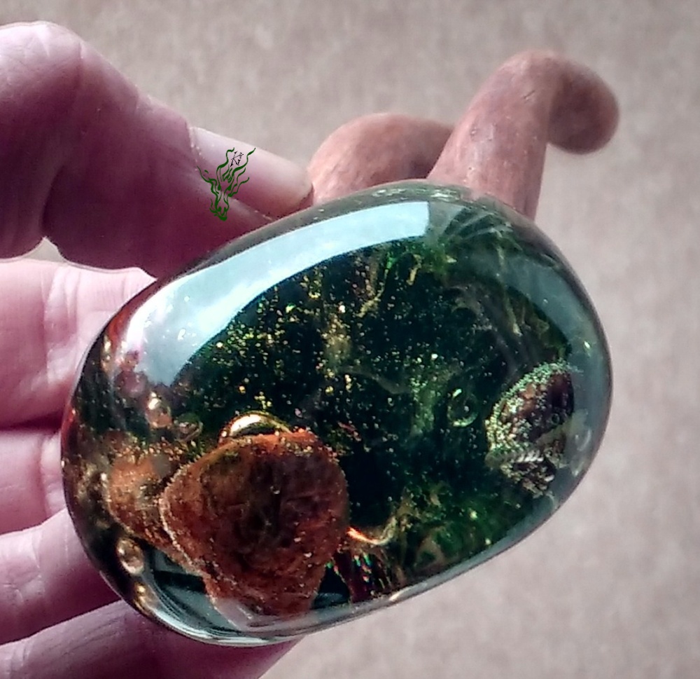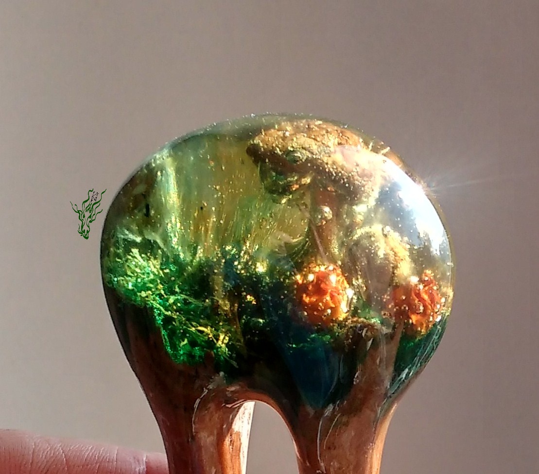 jadedrache Haarschmuck Gletscherforke grün gold Flirrende Farben vermischen sich – Grün & Rot & Gelb.